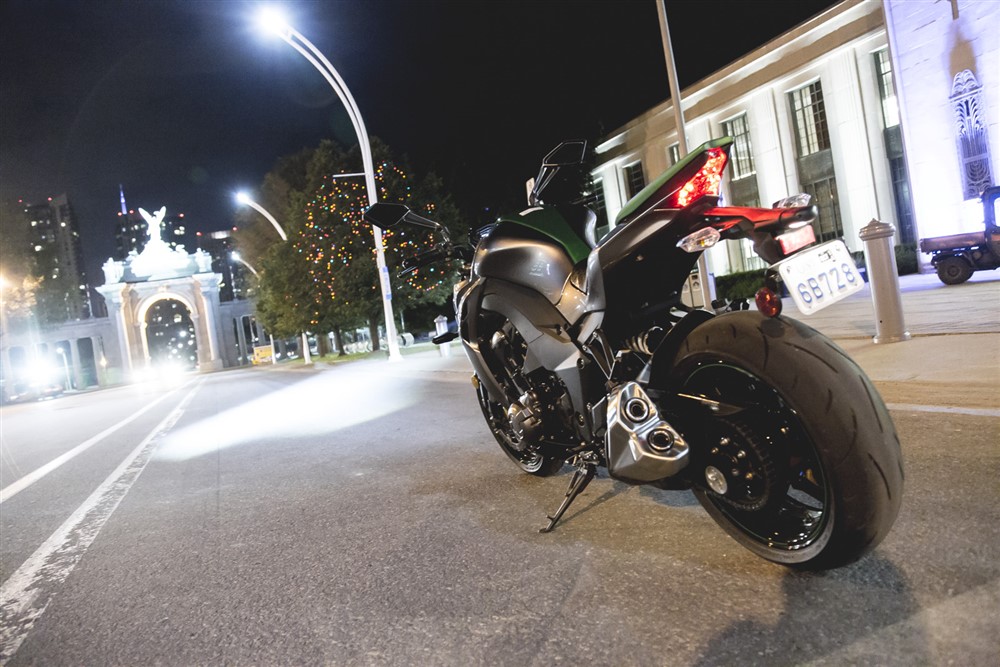 Throttle response is immediate and there’s literally zero hesitation. Despite the excellent throttle response though, what’s remarkable about the Z1000 is that it’s insanely easy to ride around town. It’s not intimidating in the slightest, and it’s very maneuverable for a liter-bike. Its final-drive gearing is actually significantly shorter than that of its sibling, the Kawasaki Ninja 1000, which makes this a totally different beast to ride. Its weight of 487 lbs may sound a little on the hefty side, but Kawasaki has put a lot of effort into ensuring that the bike’s weight is centralized. This allows even the intermediate rider to be able to put the Z1000 into corners with ease.
