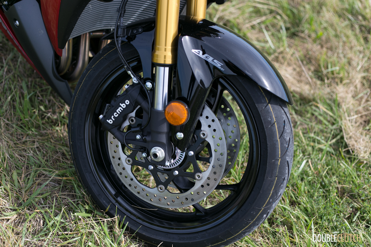 Suzuki has tuned the traction control system we first experienced last year with the V-Strom 1000 to add a more sporting level of intervention. Canadian GSX-S1000s come standard with ABS (Stateside, a base model can be had without) working in concert with a pair of floating 310 mm rotors front, and a single 220 mm rear disc. Front calipers are by Brembo, rear by Nissin. And rolling stock is a 120/70-17 front and meaty 190/50-17 rear Dunlop Sportmax.