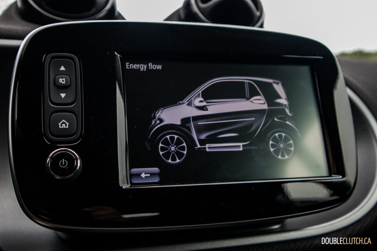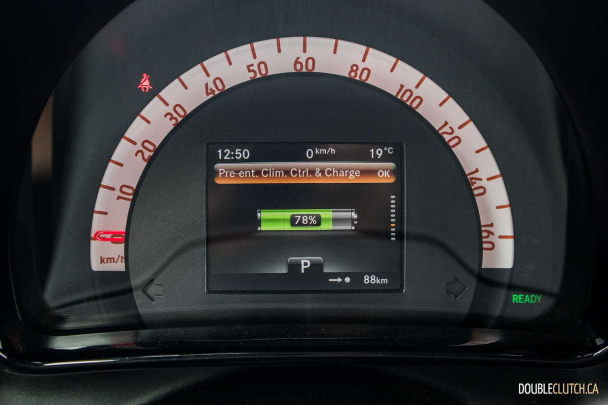 Smart’s latest little charmer can be charged via a 7.2kWh onboard charger. Plugging it into my home’s wall outlet showed us a 12-hour charge time from 18% to full. Using a 240V Level 2 outlet can bump this to just over two hours. On a full charge, we observed an indicated range of 126km, and we can confirm this to be very realistic in ideal conditions. Use of the air conditioner will shave this range down significantly, and there is an “Eco” mode that maximizes your range as well.