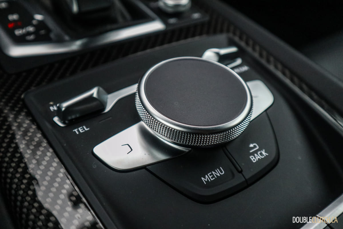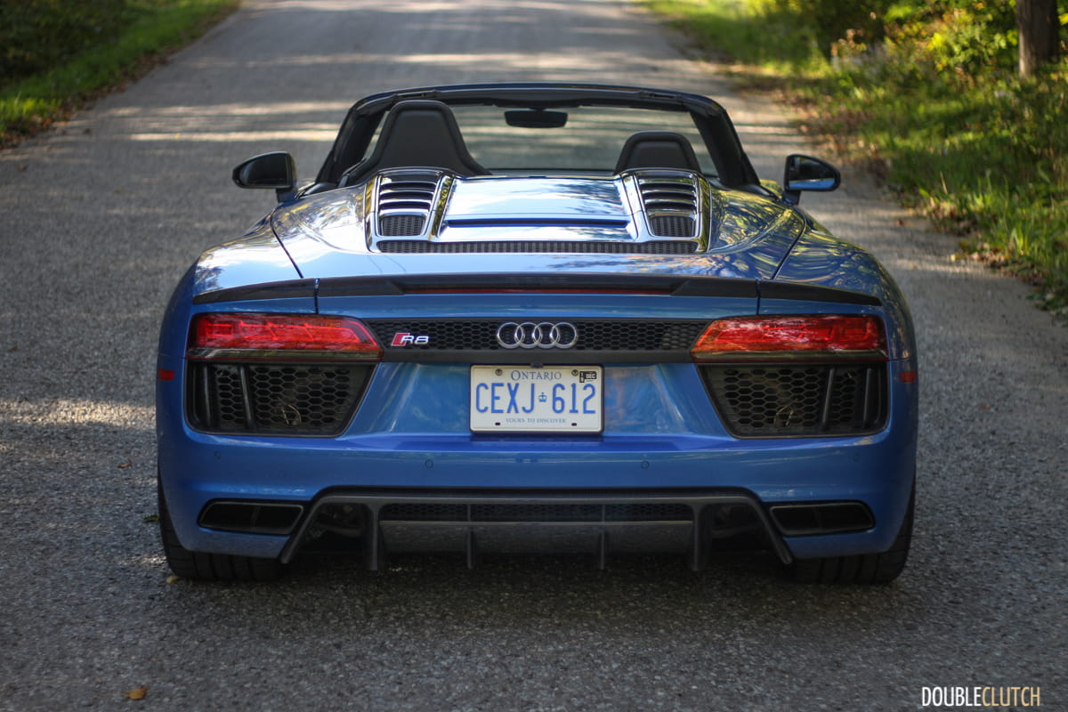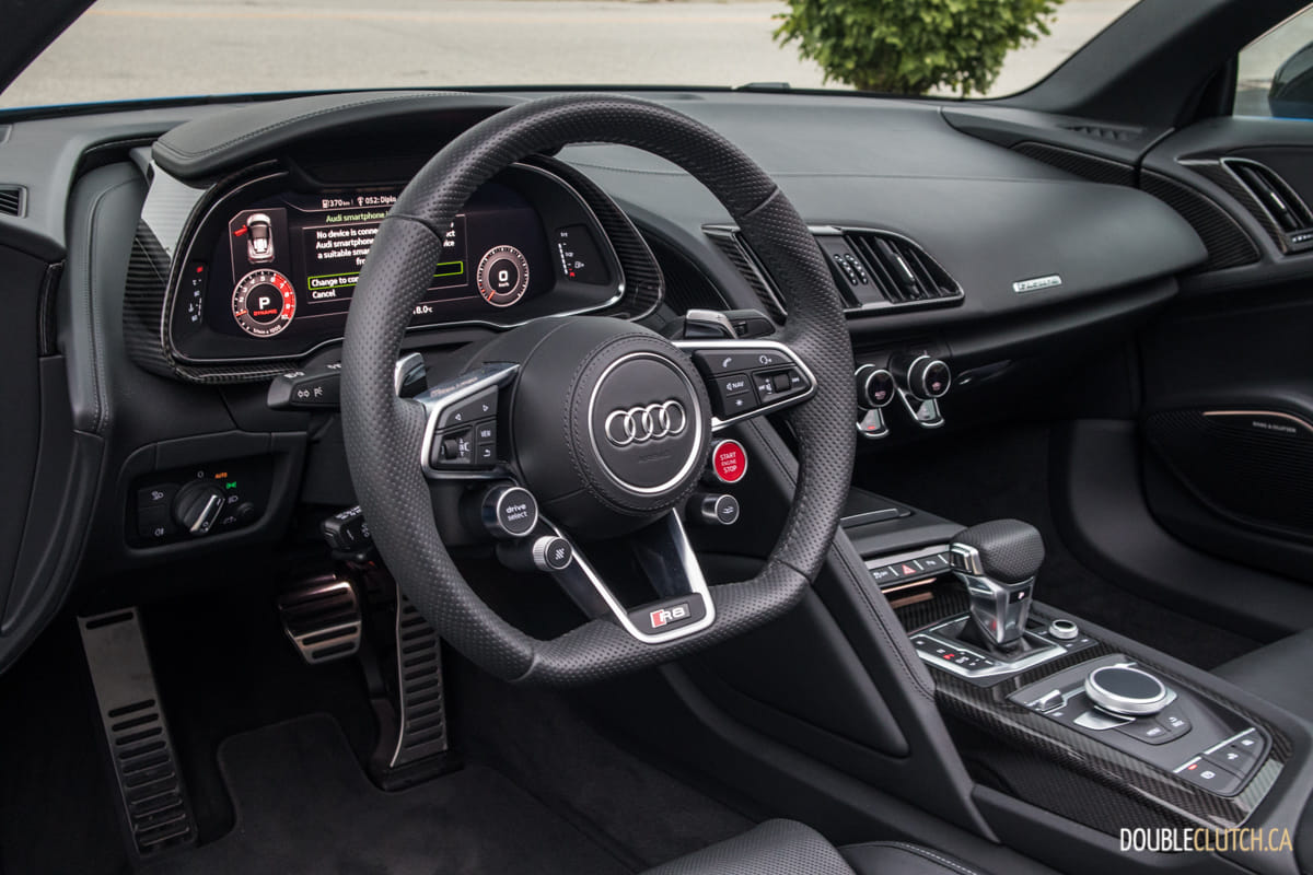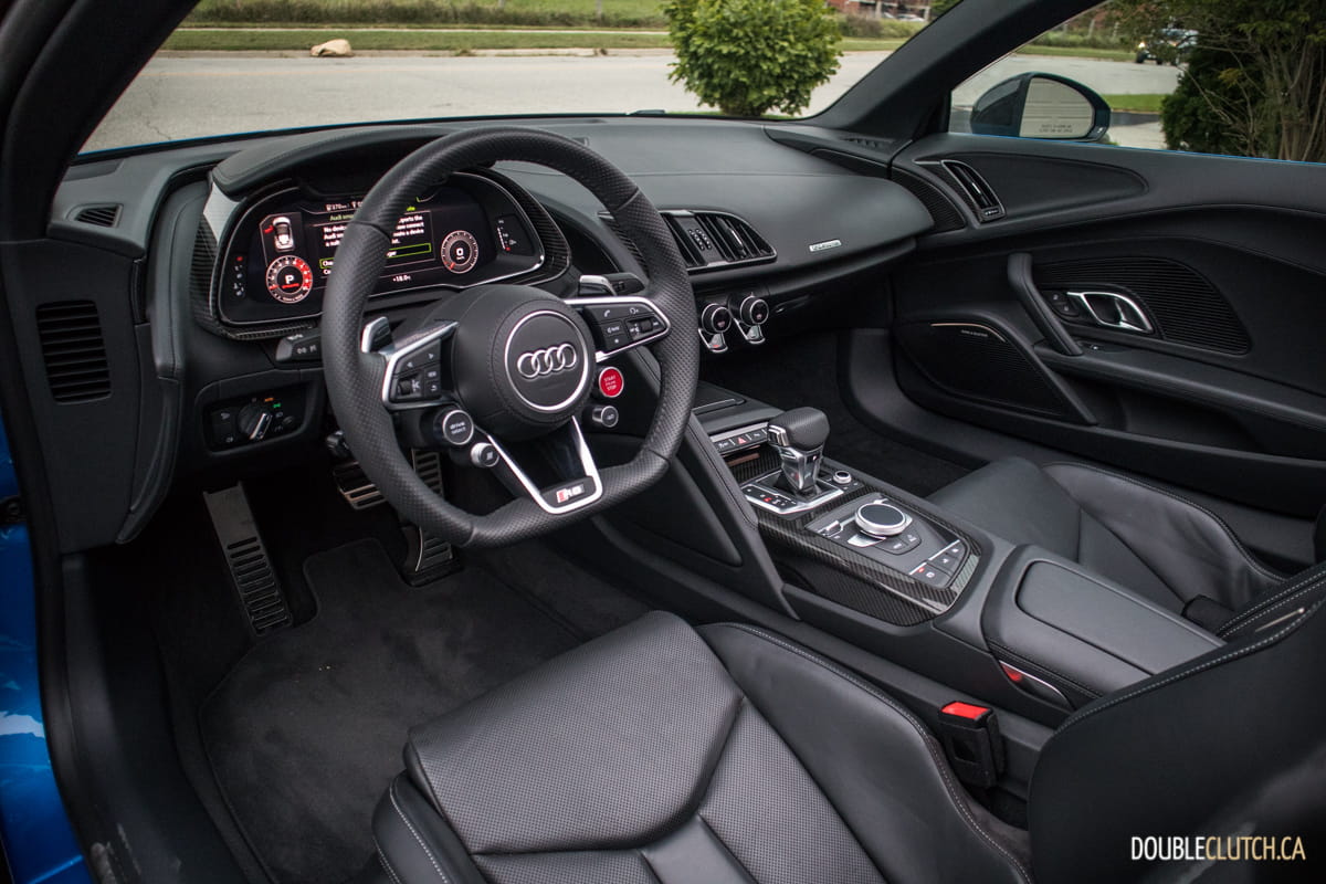 The soft top retracts at the touch of a button, and can be operated at neighbourhood cruising speeds. With the top in place, visibility out of the R8 Spyder is questionable, with massive blind spots on either side. One exceptionally cool touch is a powered rear window that, when rolled down, brings in a nice breeze but also is positioned so that rain won’t trickle into the cabin. It also means the driver and passenger can both hear that V10 sing a little bit louder from behind the cabin.