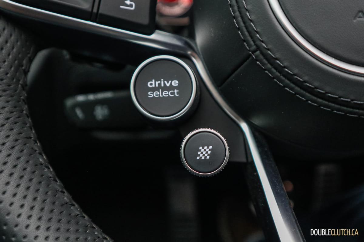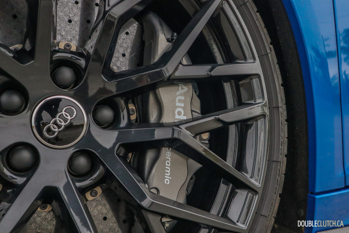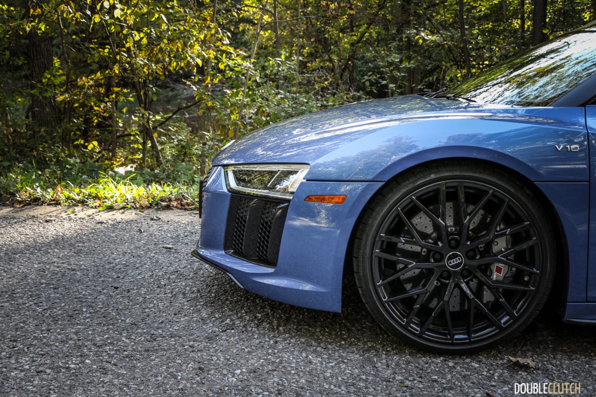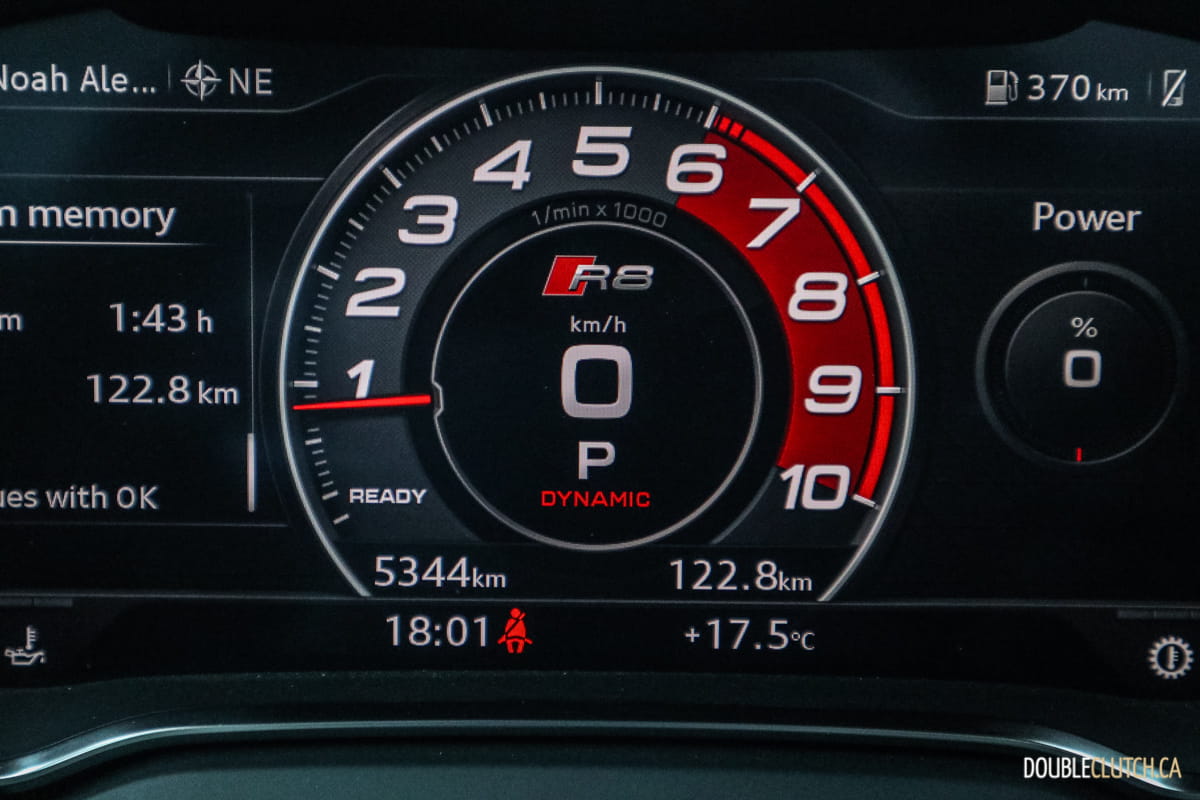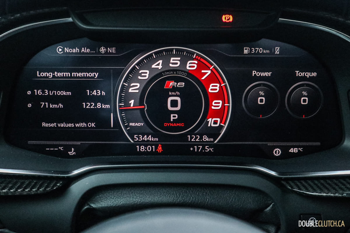 Audi Canada rates the fuel efficiency of the R8 Spyder V10 Plus at 17.1L/100km city, 11.3L/100km highway, and a combined estimate of 14.5L/100km. Our test consisted of mostly city driving, and considerable use of the “Performance” setting. We averaged 19.2L/100km operating solely on 94-octane ultra-premium fuel. Longer highway runs resulted in matching the manufacturer’s estimate and slightly besting it at 11.0L/100km. This was achieved in “Comfort” mode with the transmission left in its automatic setting.