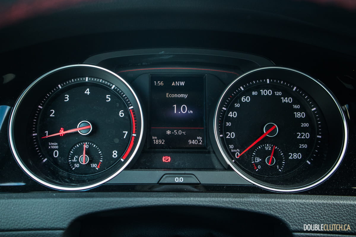 Fuel consumption for the 2019 GTI comes in at 9.6L/100KM in the city and 7.3L/100KM on the highway for manual transmission-equipped cars. Expect dual-clutch automatic units to fare slightly better in the city, and slightly better on the highway. Fuel tank capacity is 50 litres, which is a little on the small side. Observed economy over a week of highway driving netted 7.5L/100KM, and Volkswagen says that regular octane fuel is completely acceptable, unlike the Honda Civic Si, which requires premium.