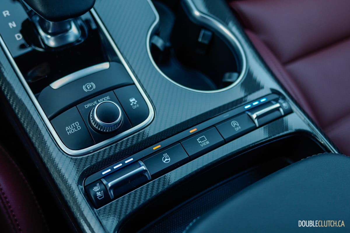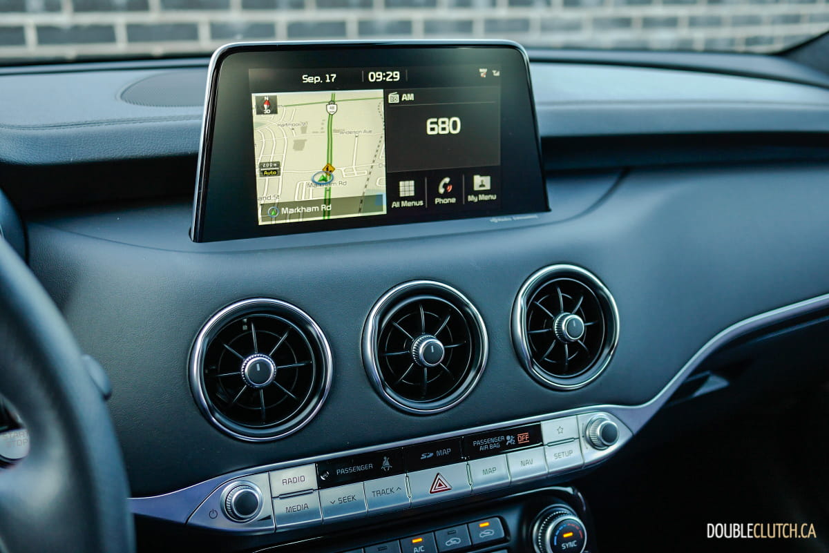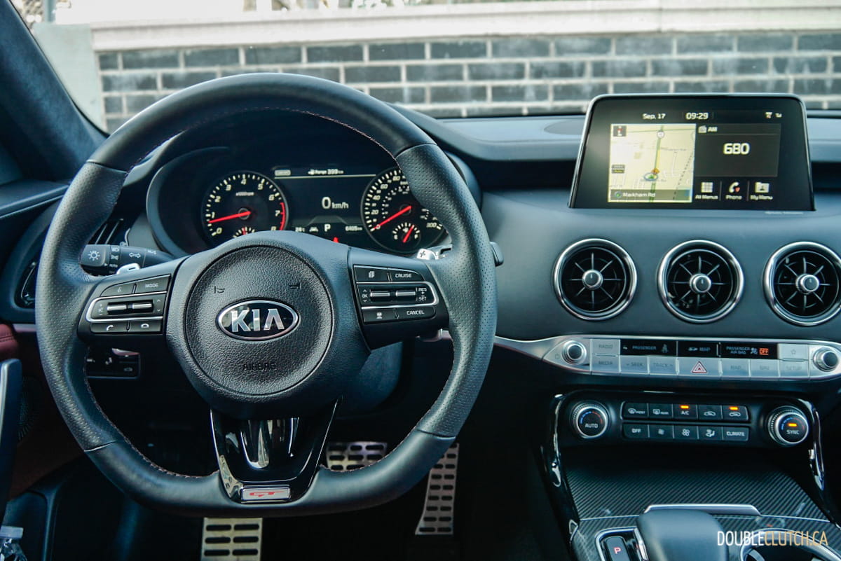 Unlike Stingers offered in the U.S., where they can be ordered with rear- or all-wheel drive, all Stingers in Canada have power routed to all four wheels. The standard Torque Vectoring Control enhances overall performance during cornering by sending power to the wheels that require traction. Drivers can select from five drive modes (Smart / Eco / Comfort / Sport / Custom) that best suit their preferred driving experience, and we observed notable differences in its adaptive dampening response.