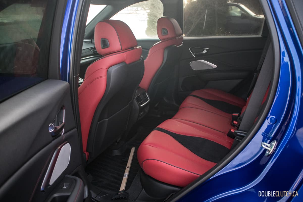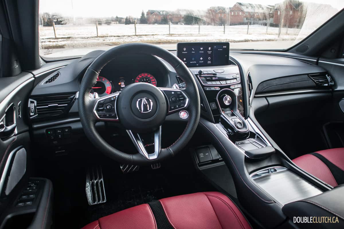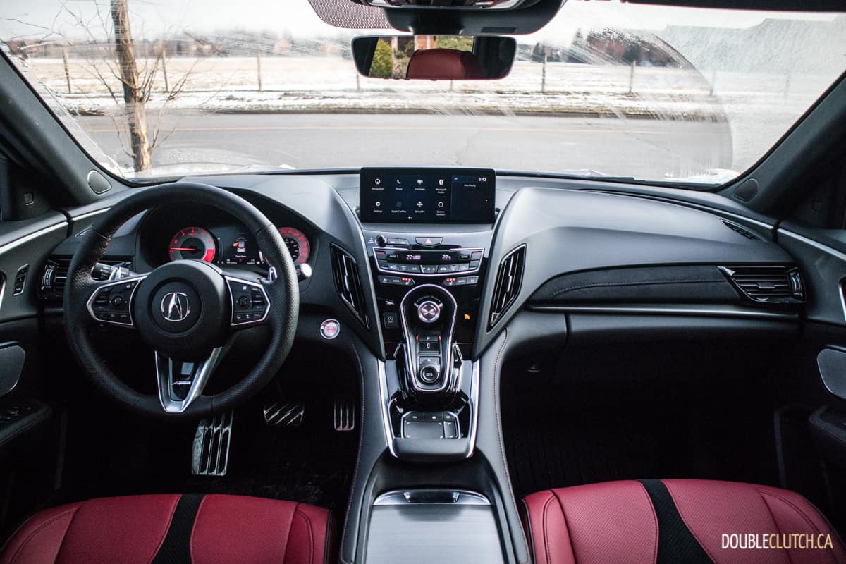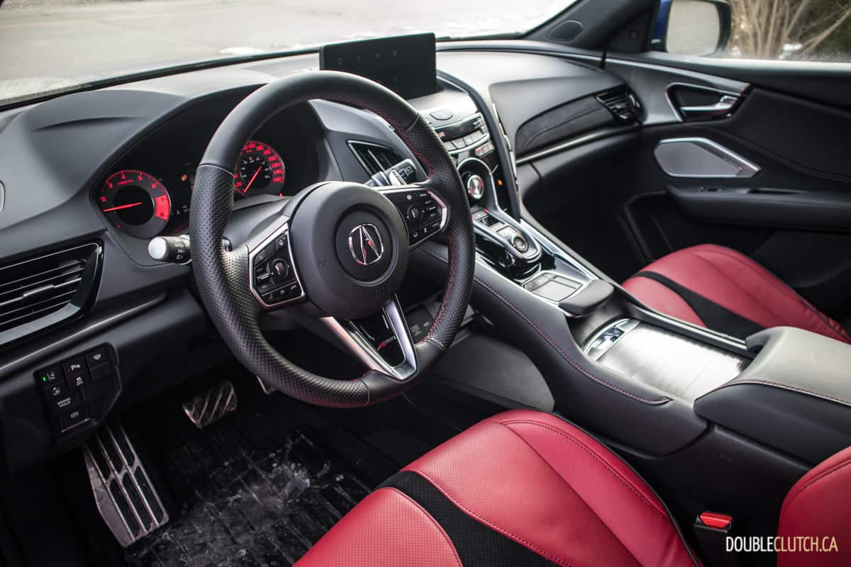 The standard RDX is one of the better looking compact SUVs on the road. The sculpted and sporty lines, Acura’s diamond pentagon grille and exterior LED lighting really set it apart from typically dreary looking peers. The A-Spec package takes a good vehicle and makes it even better with bolder fascia, prominent dual exhaust tips and 20-inch Shark Gray rims. Our tester came finished in Apex Blue Pearl, a color with a history on Acura’s performance vehicles, combined with red leather sport seats. It makes for a very eye-catching little crossover that garnered lots of looks.