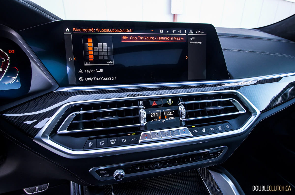 The infotainment system on the X6 M50i is latest version 7.0 of BMW’s iDrive, which possesses a control dial combined with two 12.3-inch displays – one for the main gauge cluster, and the other a touch screen for infotainment control. The system itself is slick to use, although the menu systems are a little too deep for non-distracted use. Many of the same functions are also re-oriented compared to older versions of iDrive, so BMW die-hards may find a bit of a learning curve to overcome. Apple CarPlay is standard for those who want to easily mirror their iPhones, but Android users are out of luck: there’s no Android Auto available at all. BMW’s Intelligent Personal Assistant is a voice command that allows control of iDrive functions, but in practice, we found the reaction to be slow and inaccurate.