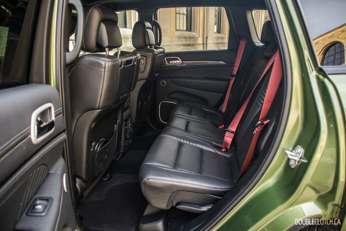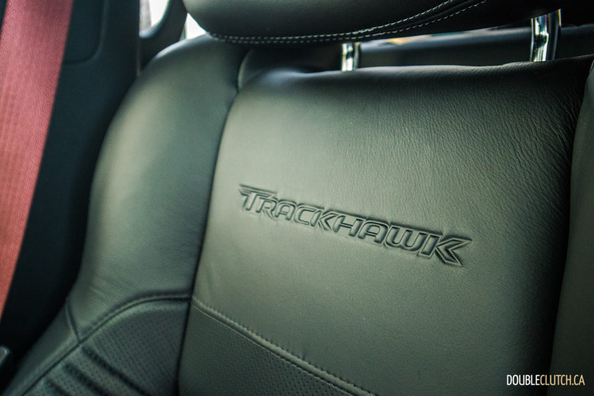 I haven’t written much about the Trackhawk’s interior, because it’s basically the same interior you’ll find in a regular high-trim level Grand Cherokee, but with the big soft performance bolstered bucket seats up front, red seat belts, and some Trackhawk logos. That’s not a bad thing, because the Grand Cherokee interior makes for an excellent family space, with a roomy second row and plenty of storage up front. It also has Chrysler’s fantastic Uconnect infotainment system with Apple CarPlay and Android Auto.