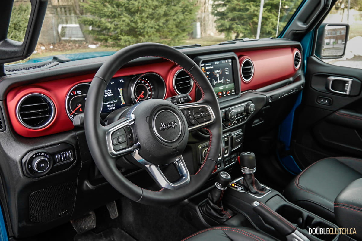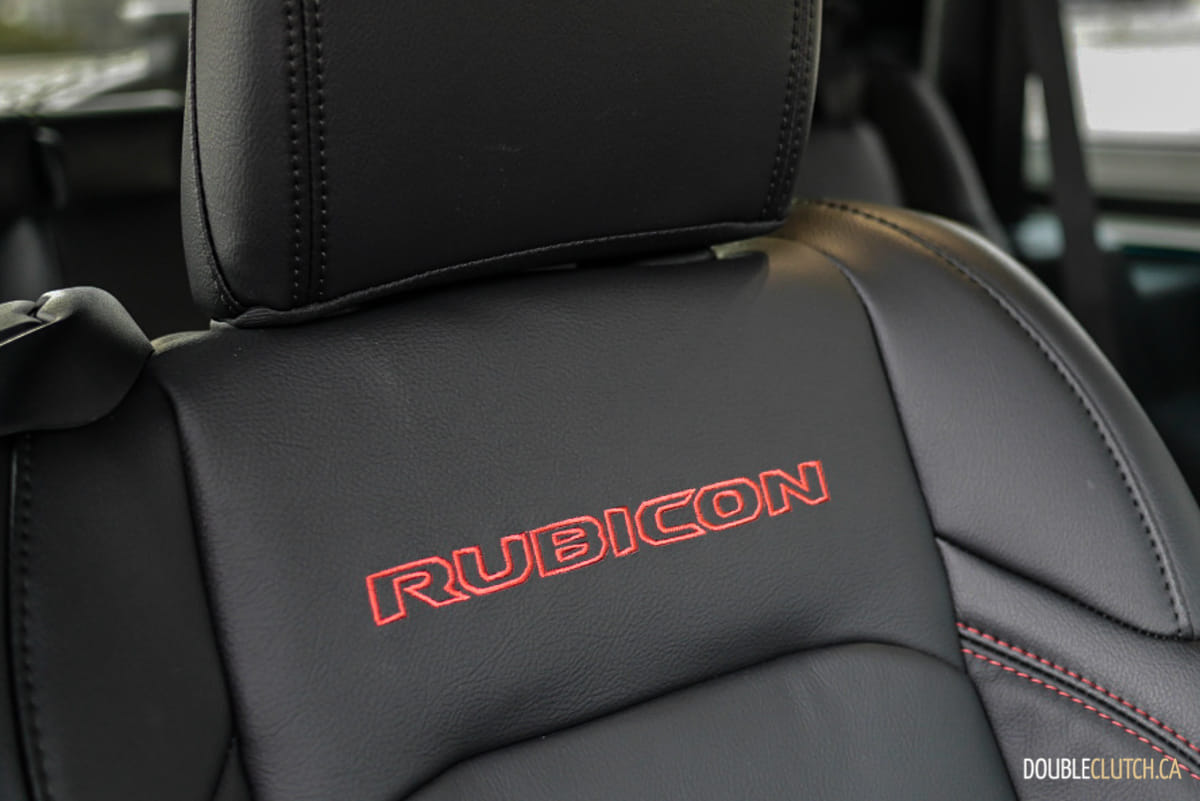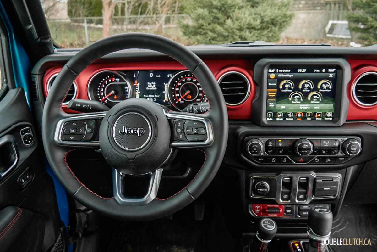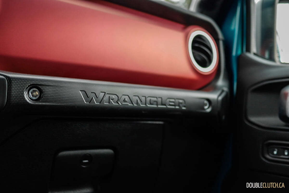 Jeep Wrangler interiors have always taken a function over form approach. Materials are easy to clean, and the switches and knobs are large enough to accommodate those wearing gloves. Our tester is optioned with a variety of comfort features such as leather-wrapped seats, shift knob, and parking brake handle, and heated steering wheel and front seats that could really benefit those braving changing climates out in the wilderness.