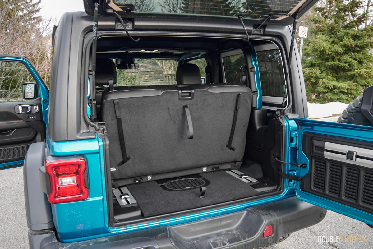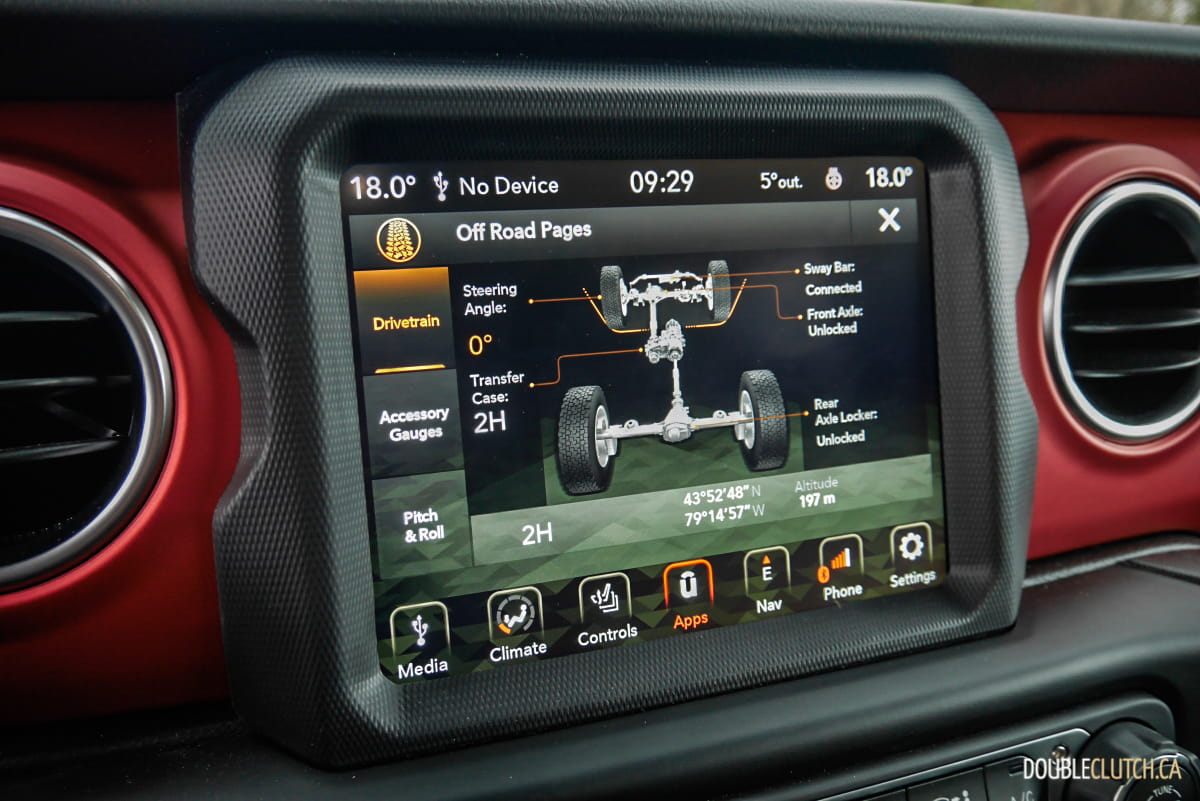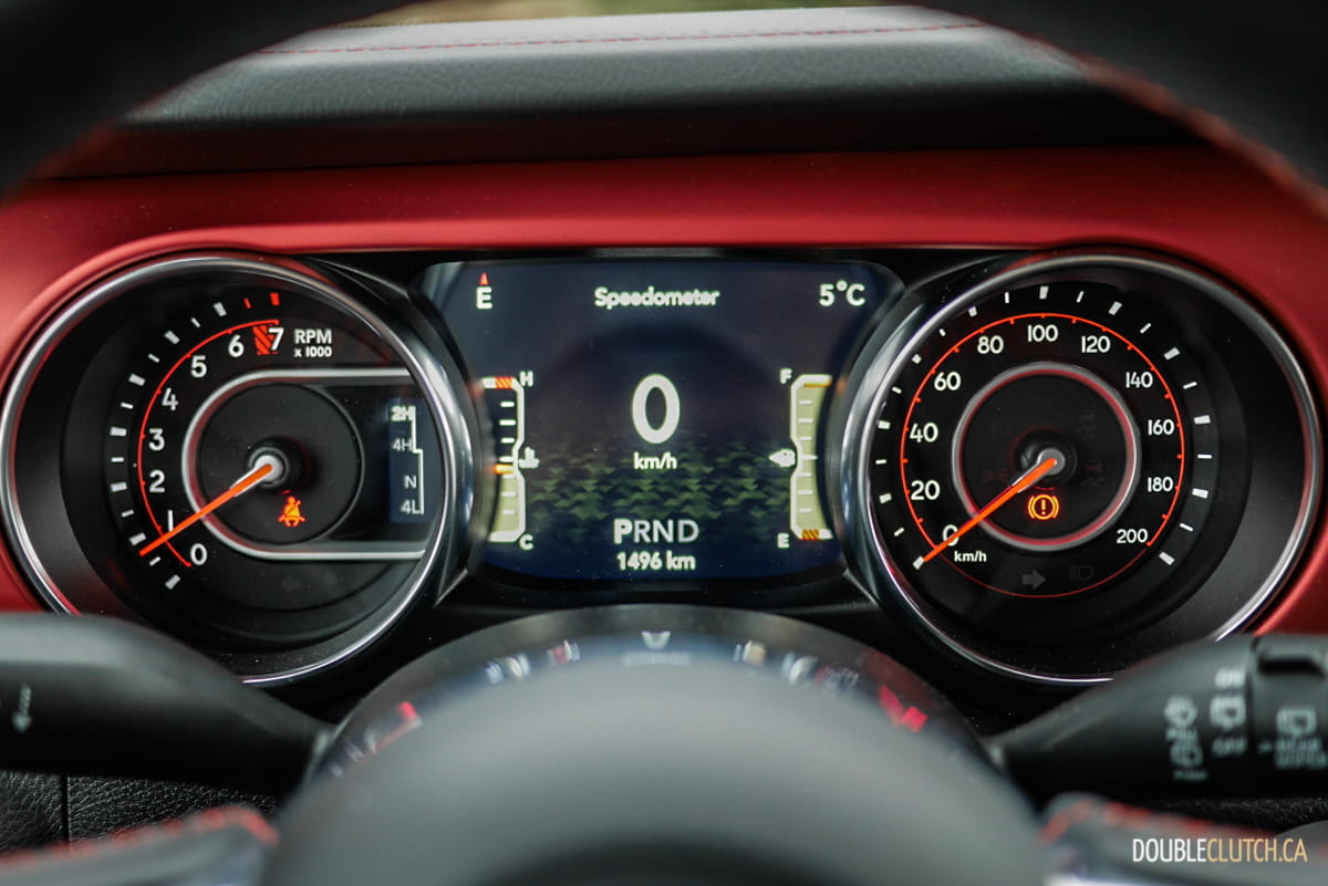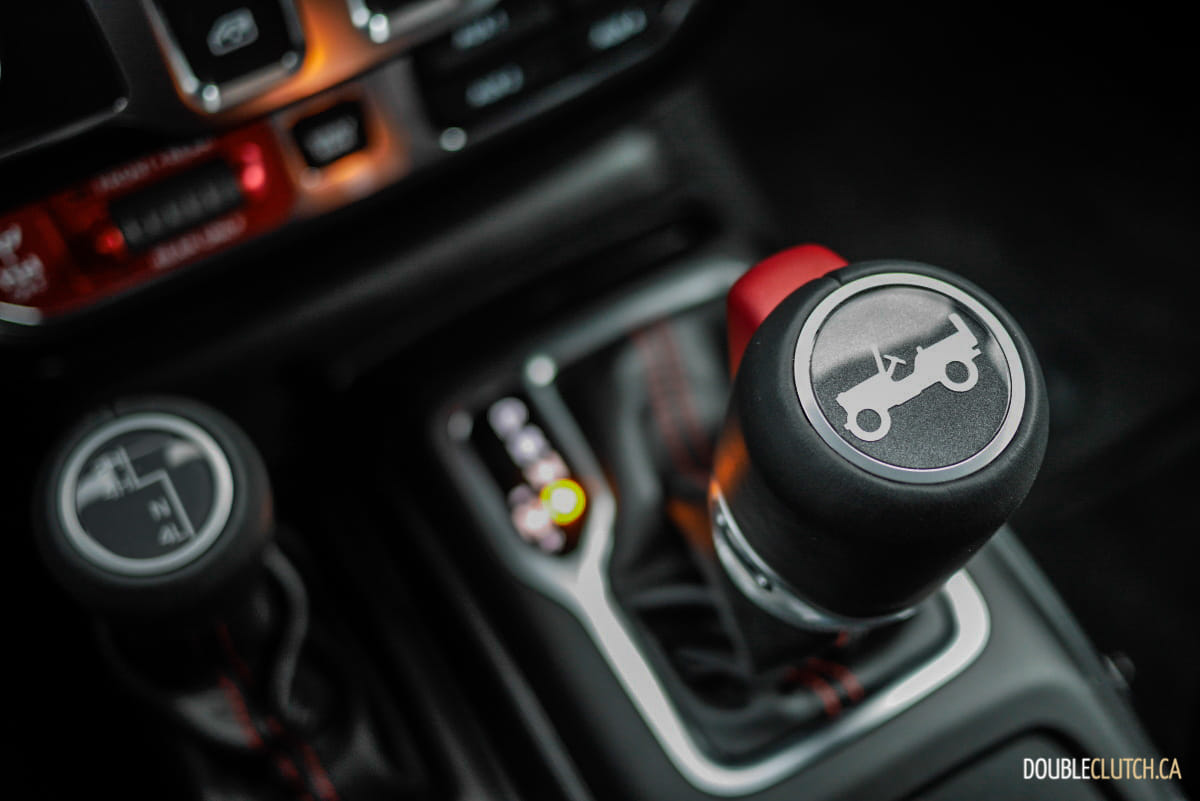 Jeep Wrangler interiors have always taken a function over form approach. Materials are easy to clean, and the switches and knobs are large enough to accommodate those wearing gloves. Our tester is optioned with a variety of comfort features such as leather-wrapped seats, shift knob, and parking brake handle, and heated steering wheel and front seats that could really benefit those braving changing climates out in the wilderness.