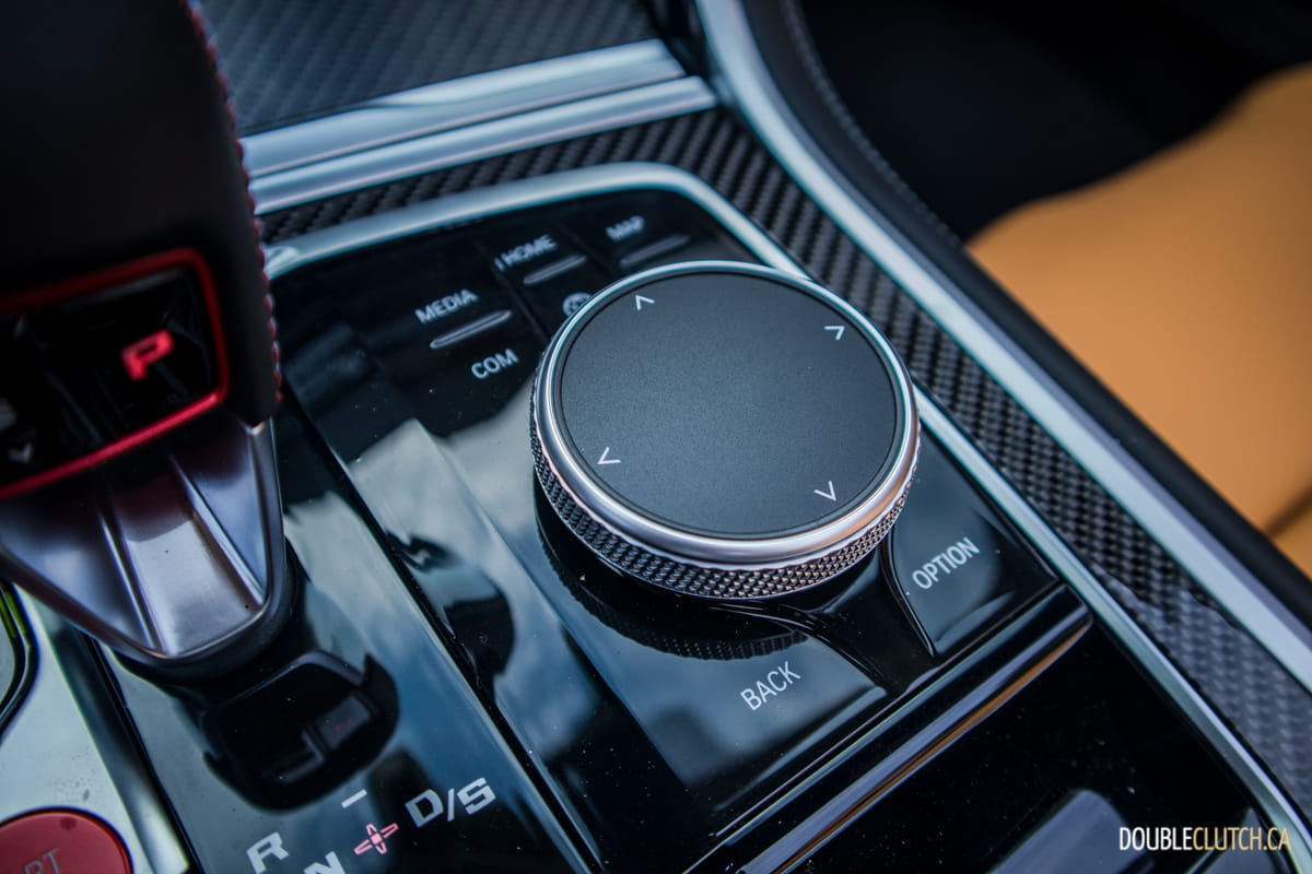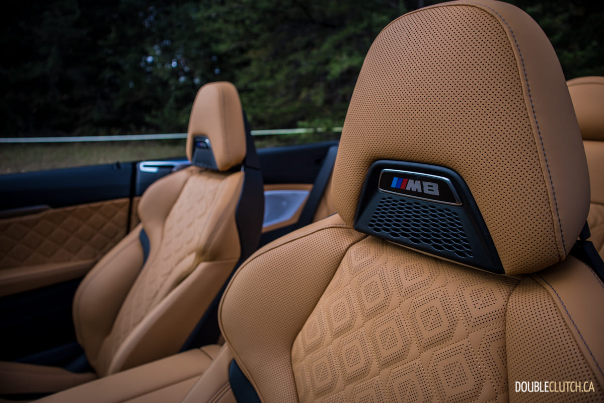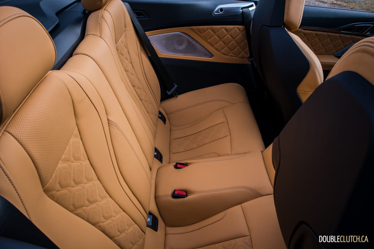 The interior of the M8 Cabriolet is mostly standard issue for the higher-spec BMWs, with generous use of leather and carbon fiber throughout. Fit and finish is excellent, and there are no visible panel gaps anywhere. Attention to detail is noteworthy, with nice touches like the traditional red and blue M colours stitched into the steering wheel. Being a large two-door, space for front occupants is plentiful, and rear accommodations are more generous than the smaller 4-series (reviewed here). However, taller folks will definitely have headroom issues in the back seat, especially if the top is in place.