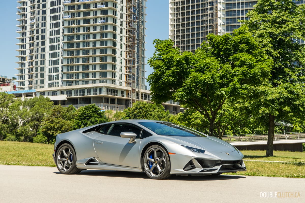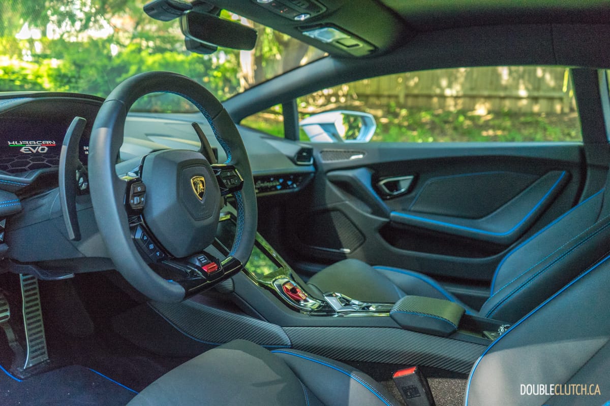 The base price of the Huracan Evo with all-wheel-drive is $305,691, but we all know that no vehicles are being transacted at the base price. Our test vehicle had a plethora of options, including the Grigio Artis paint for $22,400, the smartphone interface at $4,800, Telemetry Package at $7,100, Sensonum sound system, 20-inch wheels, blue calipers, powered and heated seats, ambient lighting, and more. The total sticker comes to roughly $385,000. The newly introduced Huracan EVO rear-wheel-drive is also the cheapest way to get one, so that may be an option for some buyers.