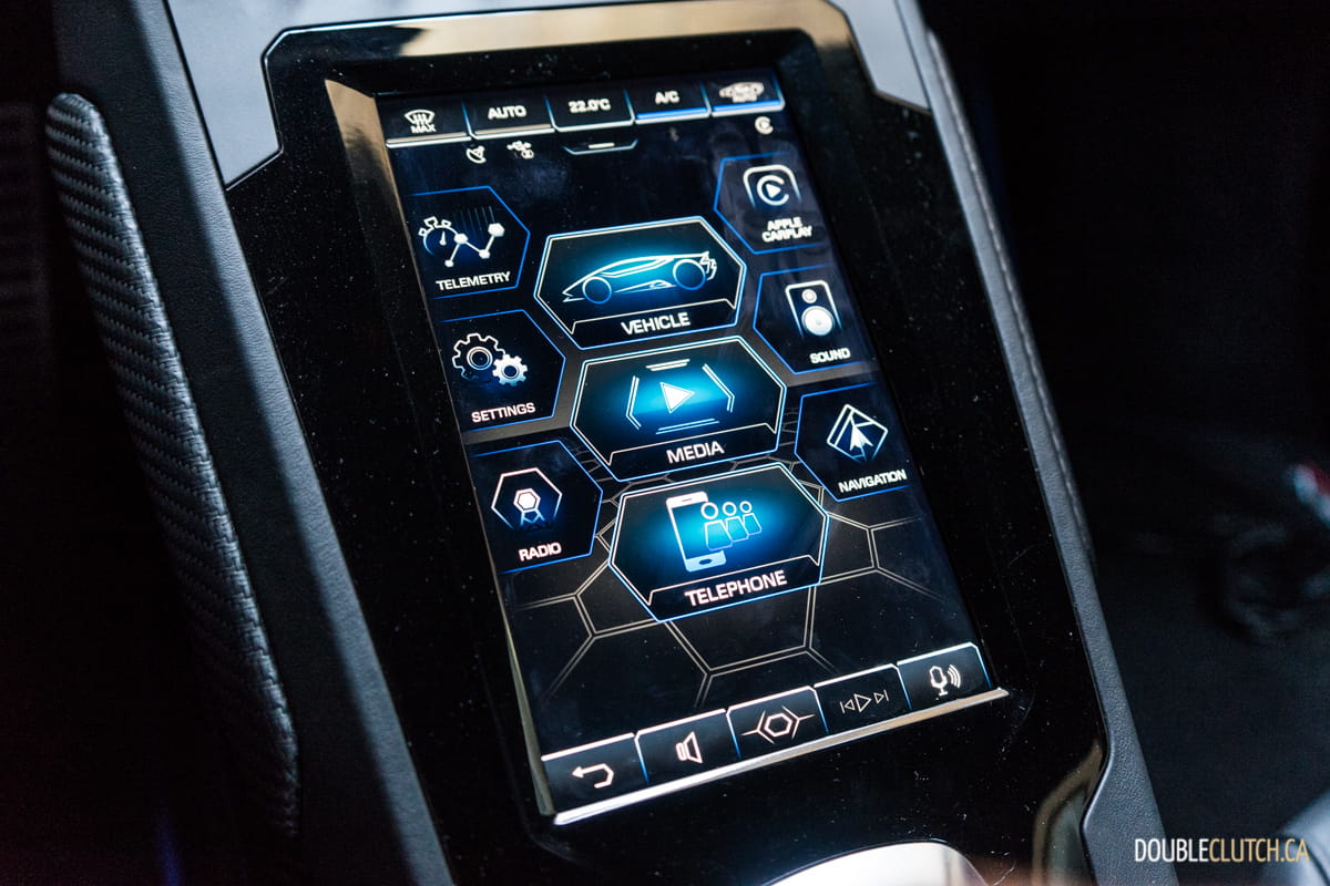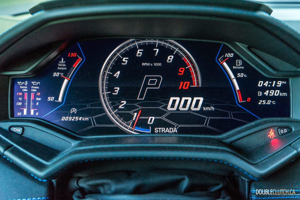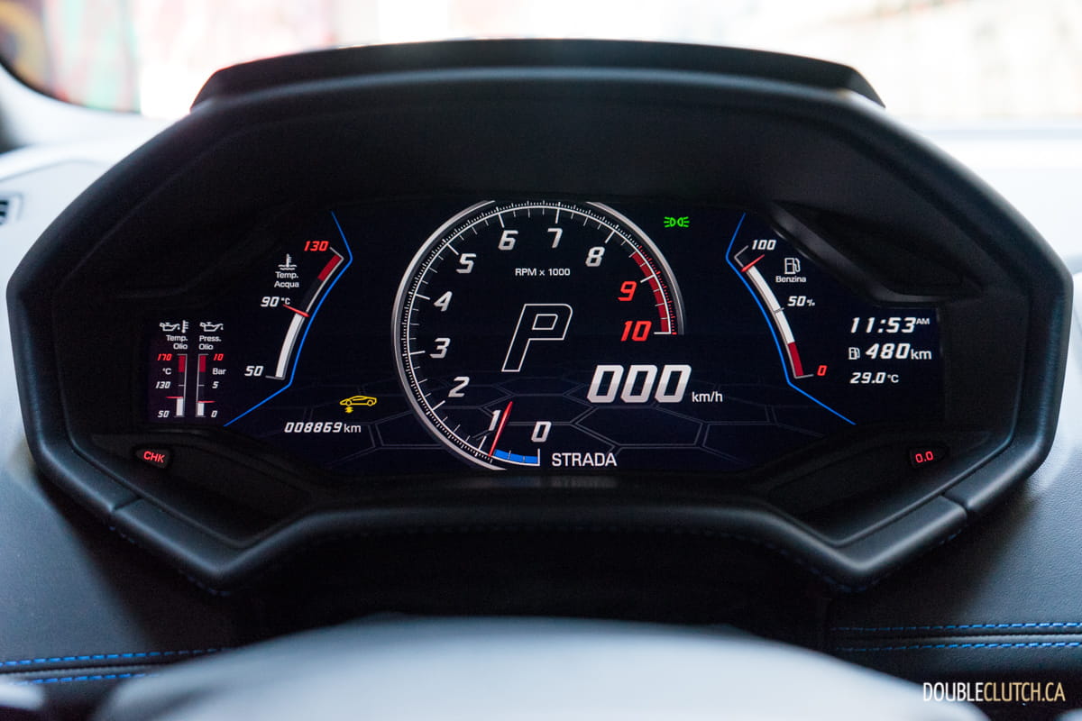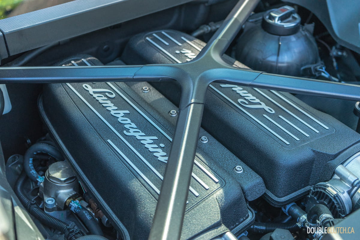 Located behind the passenger cabin is a 5.2-liter naturally aspirated V10, which also happens to be the only V10 on sale today. Yes, we know the Audi R8 (reviewed here) exists, but it shares the same essential motor. Output is 631 horsepower at a screaming 8,000RPM and 442 lb-ft. of torque at 6,500RPM. This engine is a real sweetheart, and revs freely right up to the redline. A seven-speed dual-clutch gearbox is a vast improvement over the single-clutch unit the Aventador is still plagued with, and snaps off shifts in milliseconds. The response from this powertrain really is like nothing else, and it rockets to 100km/h in well under three seconds.