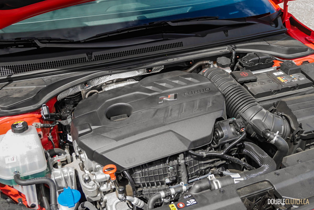 Powered by a 2.0-litre turbocharged inline four-cylinder that produces 275 horsepower and 260 lb-ft. of torque, the Veloster N has no problem keeping up with its competition. With a relatively light 3,148-pound curb weight, punchy turbocharger, and the satisfying crackle elicited by the high-flow active sport exhaust with every shift, the N feels like it outputs more than 300 horses.