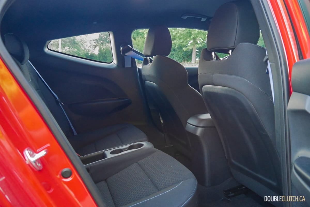 All Hyundai Velosters feature an unconventional third (or should we say fourth?) door on the passenger side that makes entry and exit into the backseats much easier. Hyundai shortened the passenger side front door as to not sacrifice body line to accommodate the additional panel. This keeps the car looking like the proper pocket rocket that it is. We particularly liked the design of the 19-inch wheels, though it’s a question as to how much better the ride quality would be if Hyundai had used an 18-inch set.