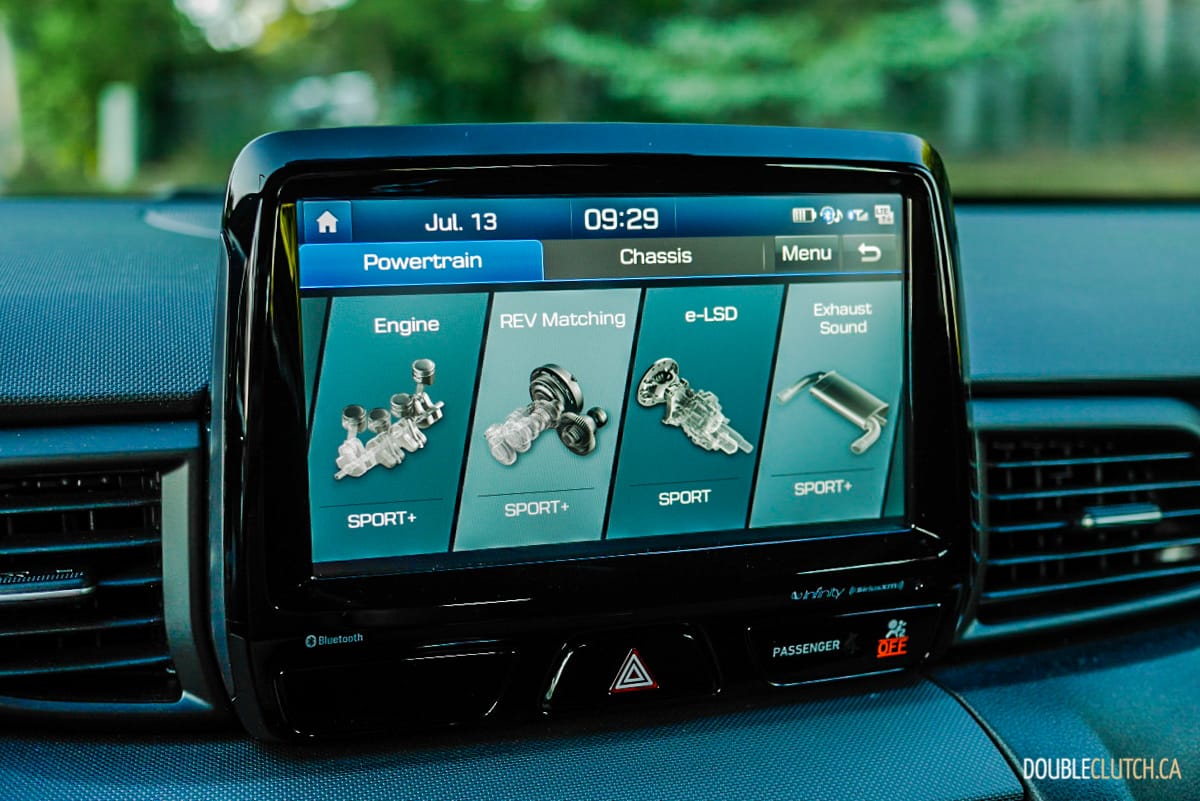 The standard six-speed manual is easy to shift, and can rev-match itself on downshifts when in the sporty N mode setting. We noticed the rev-matching speed was a split-second delayed during our spirited runs with the Veloster N, and opted to turn off the feature using the expansive N-custom menu. There are seven parameters (Engine/Rev Matching/e-LSD/Exhaust sound/Suspension/Steering/ESC) that can be individually controlled, allowing drivers to have a truly tailored driving experience.