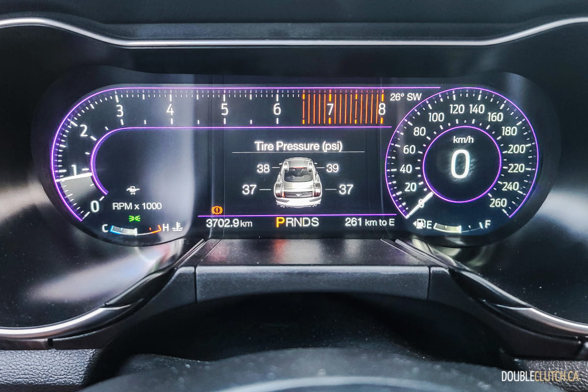 What is different in our 2020 Mustang EcoBoost is the large 12-inch LCD instrument cluster that is customizable, and a voice-activated touchscreen navigation system powered by SYNC 3. It also includes Apple CarPlay and Android Auto. The systems are easy to use and scroll through, and the car is equipped with a heated steering wheel, ambient lighting, and more. Standard items such as airbags, electronic stability control and post-crash system alert are included. Our vehicle included rear cross traffic alert and blind spot monitoring.