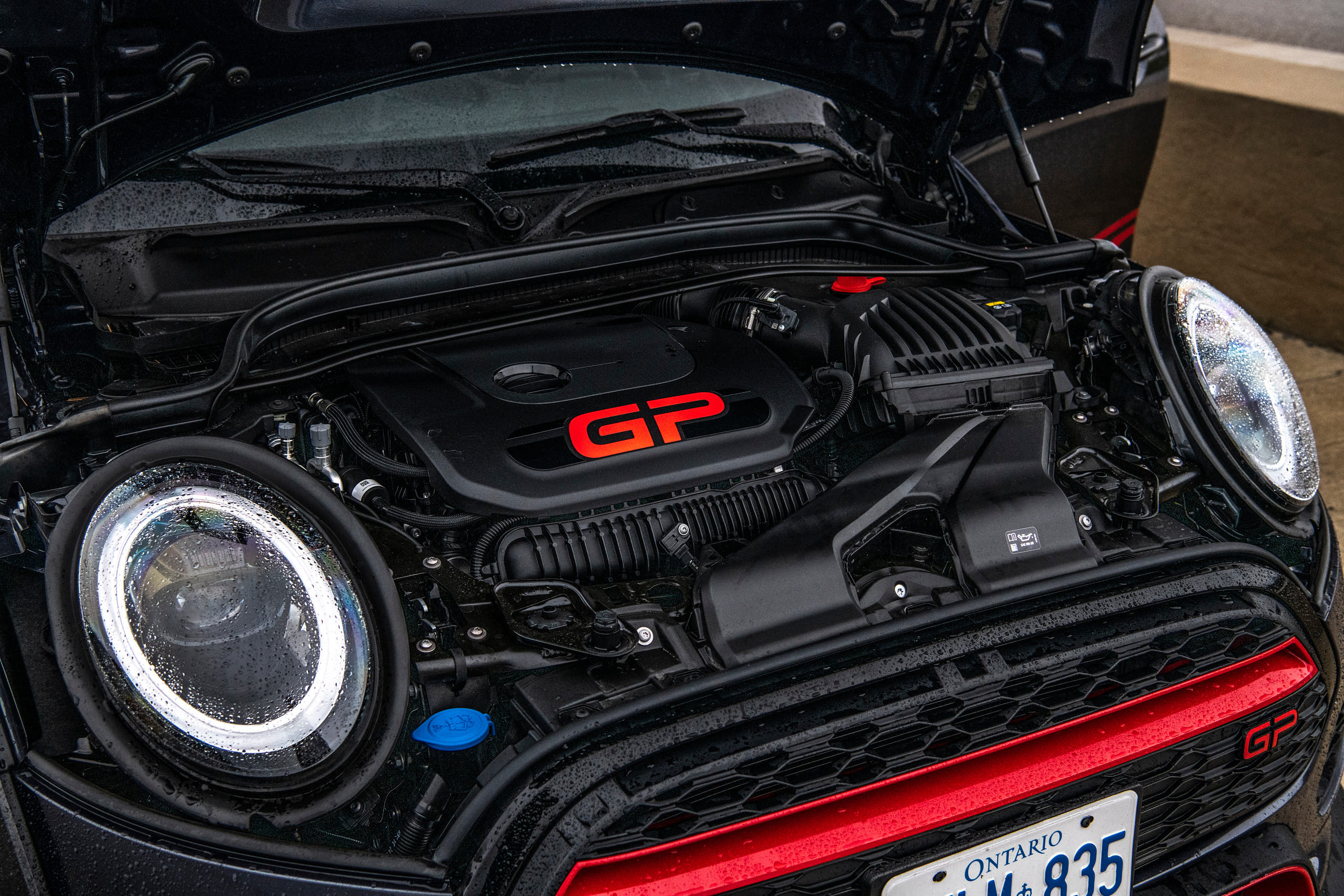 And is it ever – one stab of the throttle in this thing and it’s immediately evident that this is no ordinary MINI Cooper (reviewed here). The 2.0-liter turbocharged four under the hood outputs 301 horsepower and 332 lb-ft. of torque, substantial for a car that weighs under 2,800 pounds. A 5.2-second sprint to 100km/h makes it seriously quick and on par with the likes of the Honda Civic Type R and Volkswagen Golf R. It’s no slouch, and the performance exhaust system on the GP makes it sound the part too.
