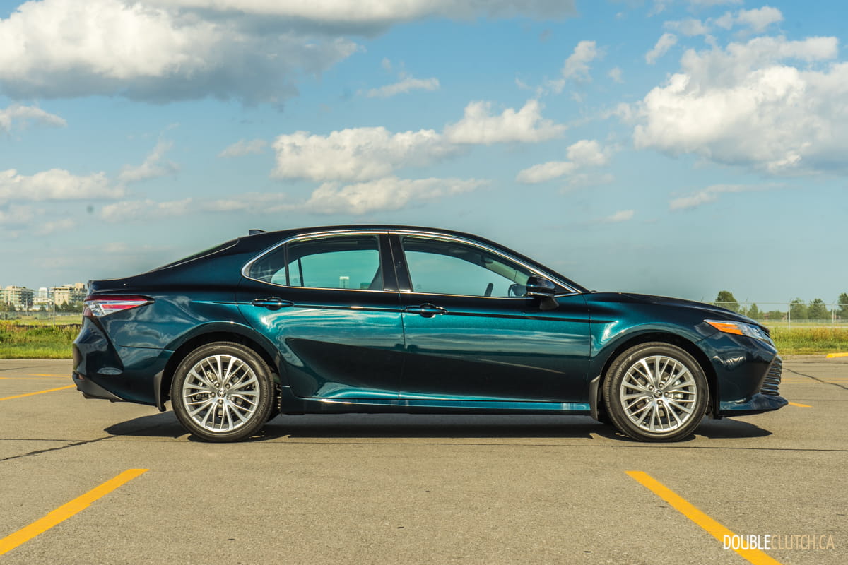 Rather than just being a blob of metal that does a great job carrying its passengers around, the XLE is has sculpted rear fenders and bumpers that give the Camry a wide stance. The front bumpers have a large grill and the Toyota emblem is carried by a V-shaped wing. A thick C-pillar helps shorten the trunk for a more flowing profile. Our tester is dressed in Galactica Aqua Mica, a deep dark luscious green, which contrasts well with the sharp alloy wheels. The Camry now has a physical presence that is more luxurious and more of a Lexus feel.