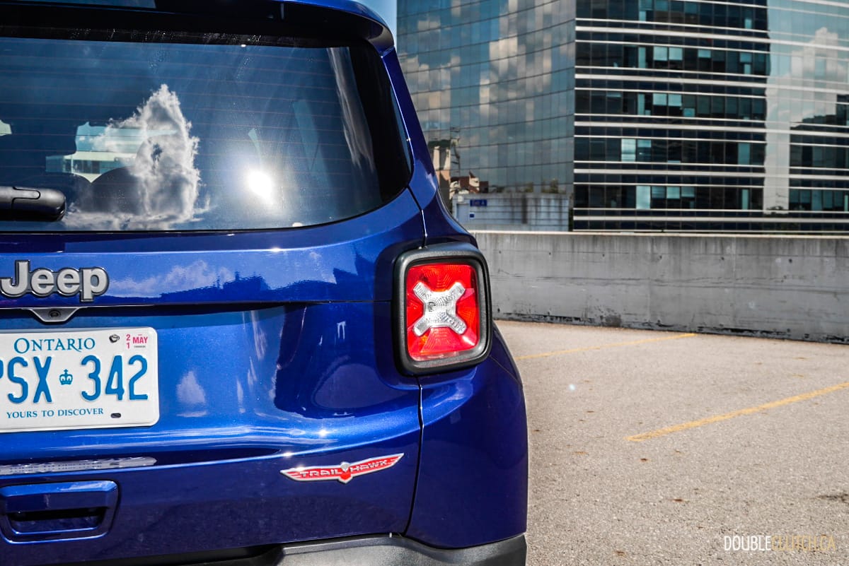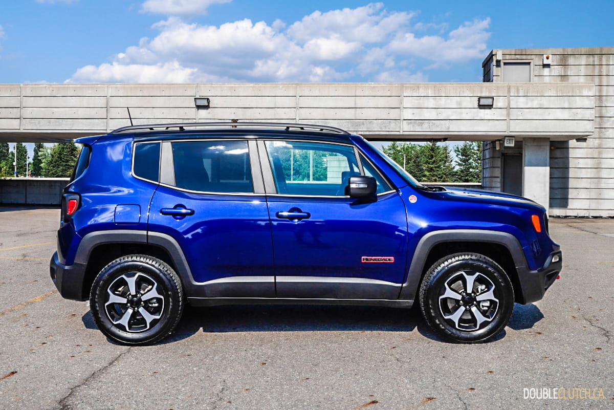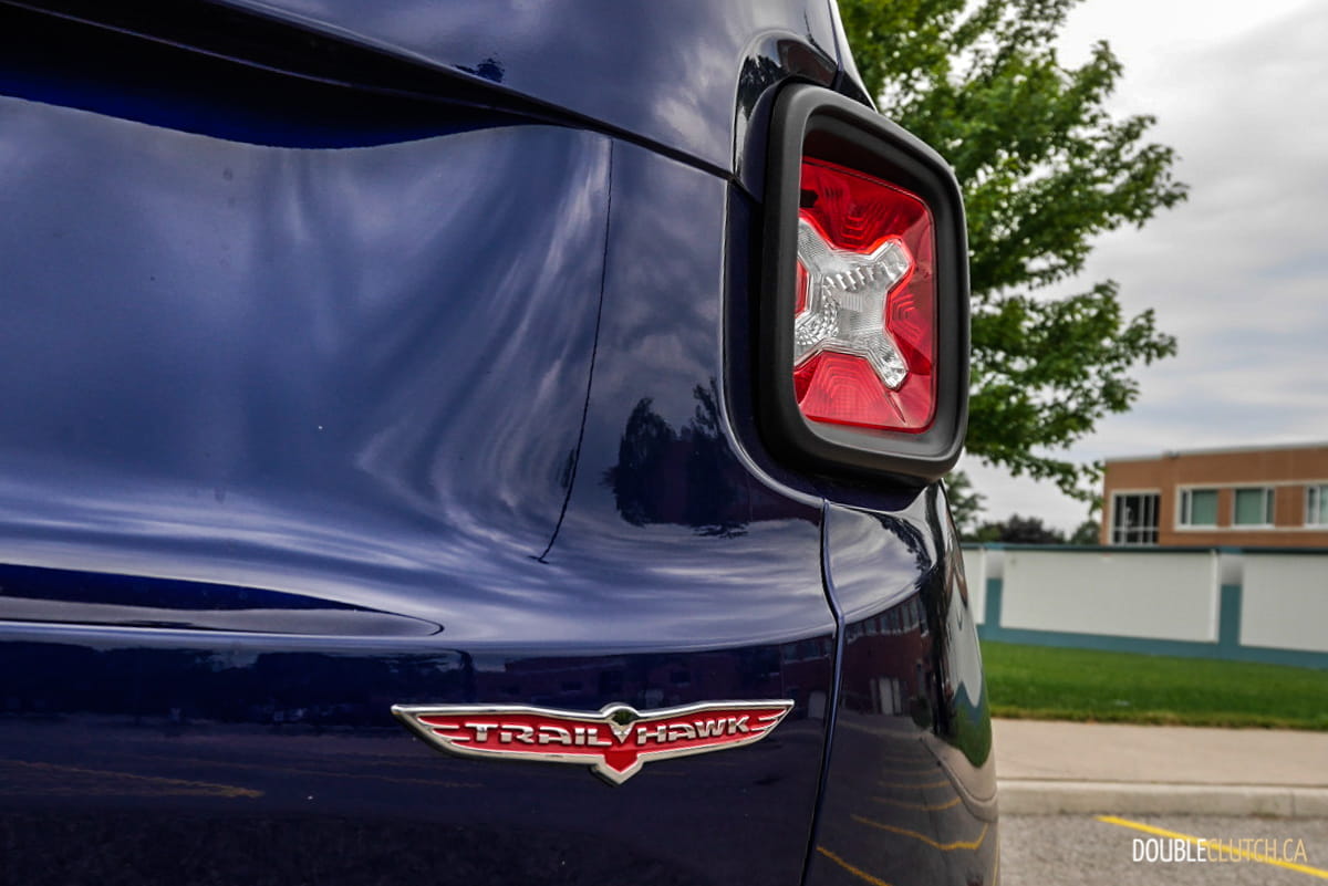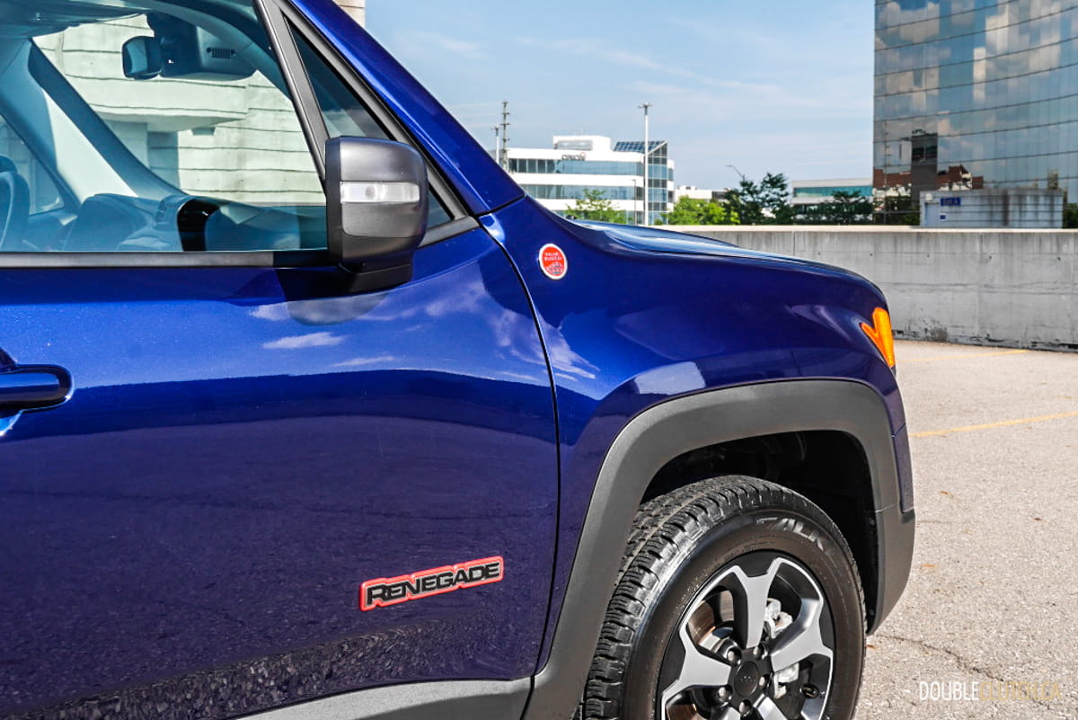 The Renegade The Trailhawk trim gets an additional Rock terrain drive mode over the rest of the lineup hawk arrived in our garage looking fun and youthful in a Jetset Blue colour. The Trailhawk is the most outdoorsy trim available, both in terms of styling and for its mechanical capabilities. It features a more rugged appearance with a blacked-out grille, hood decal, side mirrors, and an additional two-inches of ride height. The plastic side claddings are functional to protect the painted body panels from stone chips and damage when you are out on the trails, and there are bright red tow hooks in case those 17-inch all-season tires get stuck. There are classic Jeep graphics laid all over the Renegade, from its classic seven slot grille, to various little symbols to remind you of its lineage and more importantly, the Trail Rated capability.