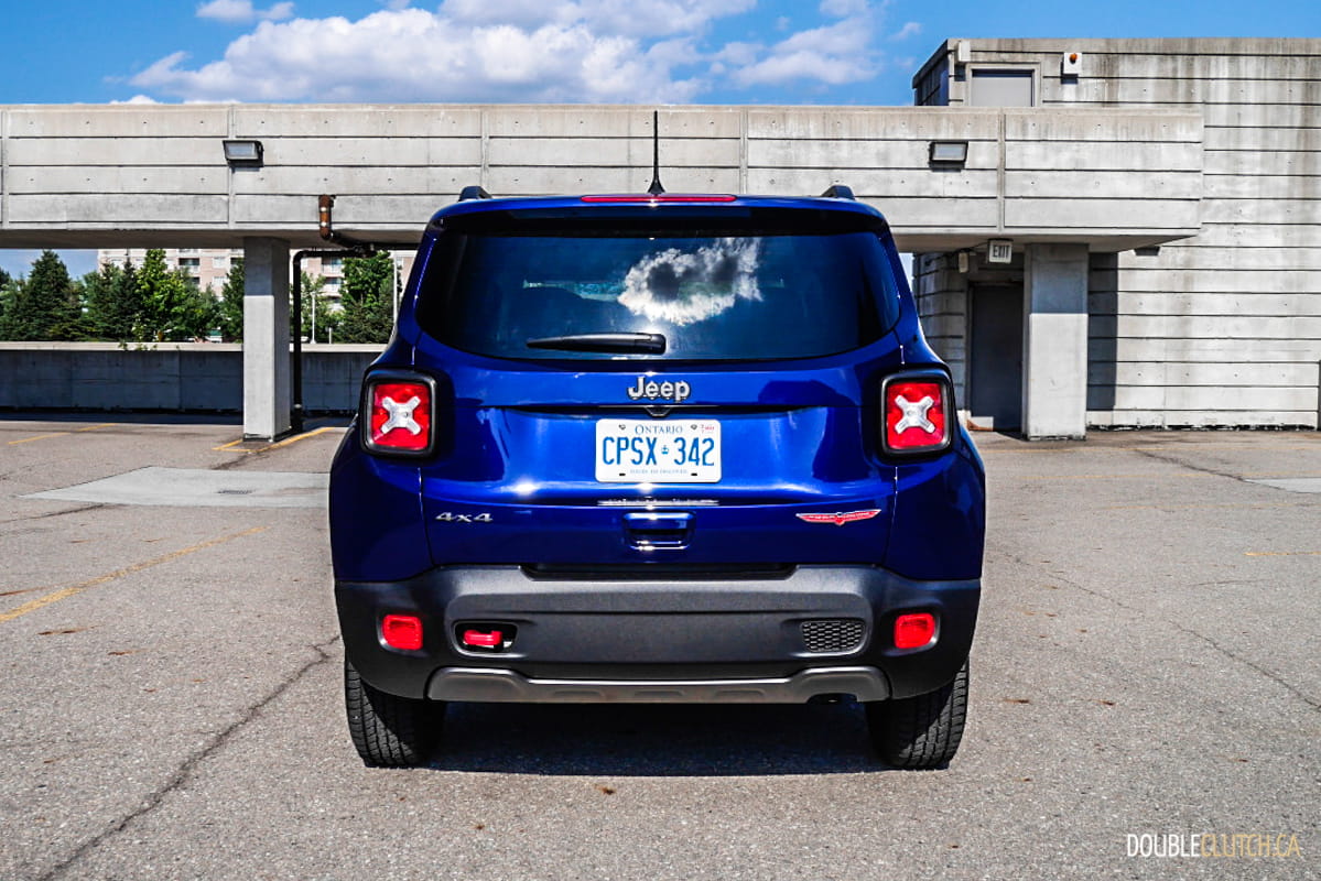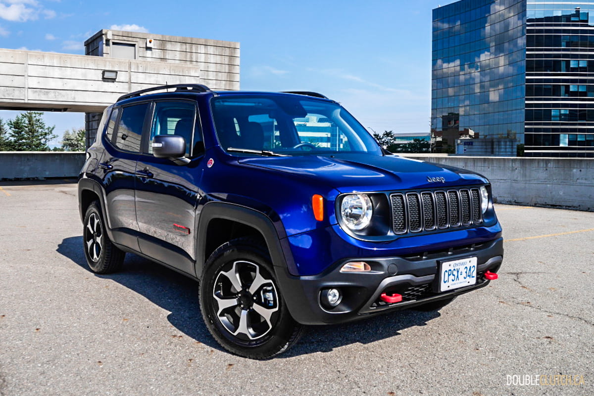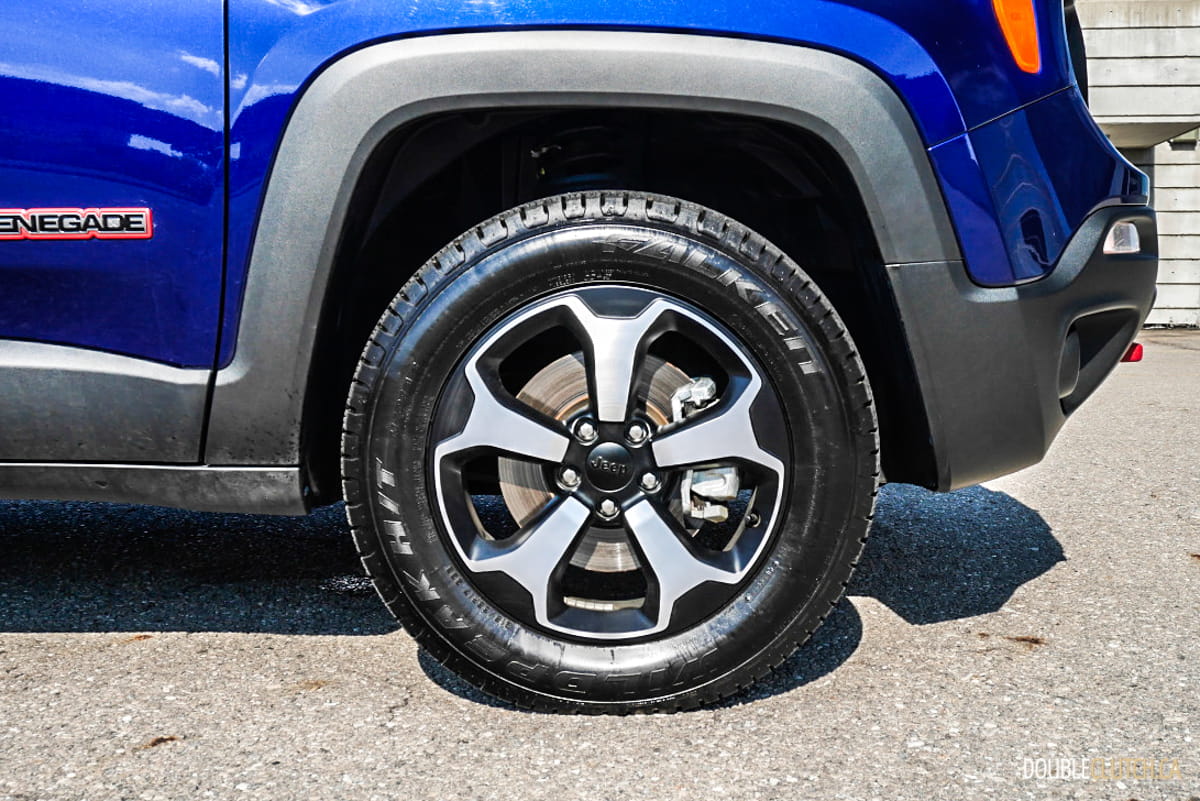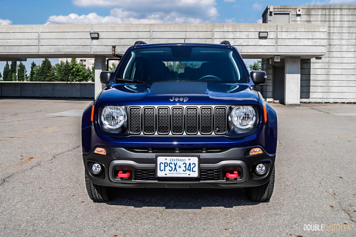 The Renegade The Trailhawk trim gets an additional Rock terrain drive mode over the rest of the lineup hawk arrived in our garage looking fun and youthful in a Jetset Blue colour. The Trailhawk is the most outdoorsy trim available, both in terms of styling and for its mechanical capabilities. It features a more rugged appearance with a blacked-out grille, hood decal, side mirrors, and an additional two-inches of ride height. The plastic side claddings are functional to protect the painted body panels from stone chips and damage when you are out on the trails, and there are bright red tow hooks in case those 17-inch all-season tires get stuck. There are classic Jeep graphics laid all over the Renegade, from its classic seven slot grille, to various little symbols to remind you of its lineage and more importantly, the Trail Rated capability.