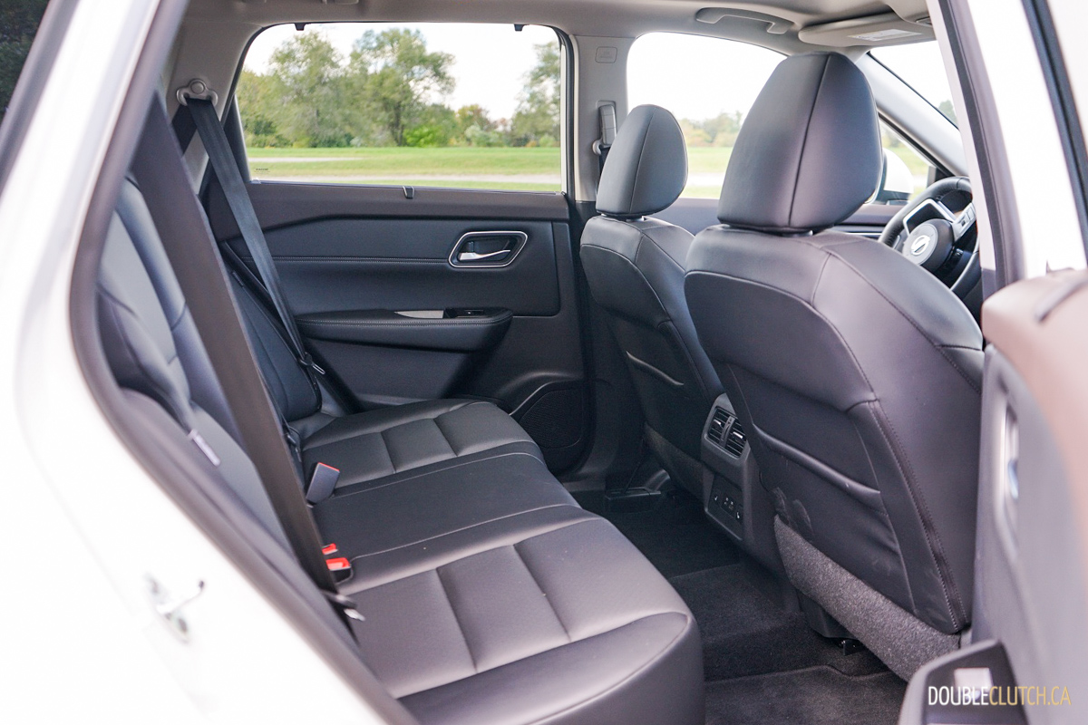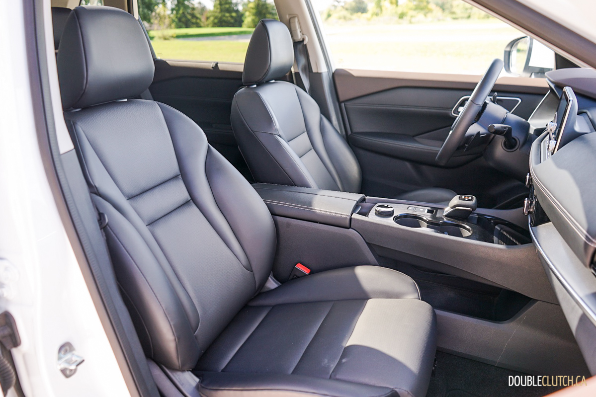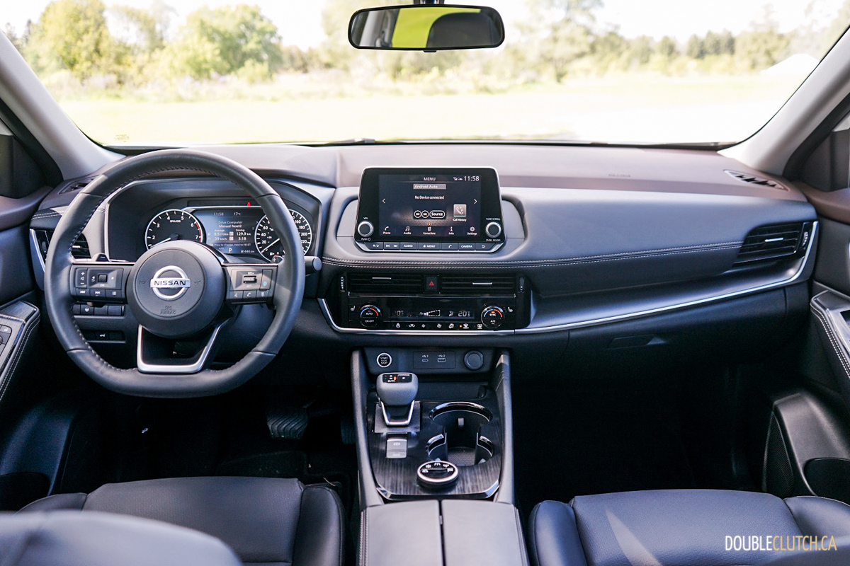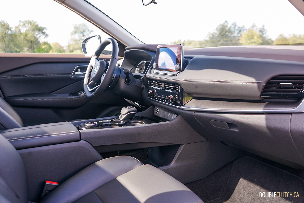 The interior is a delight; it’s simple and modern with clean lines and quality materials. It’s spacious enough to comfortably accommodate five passengers with ample leg and shoulder room. Our tester is the SV AWD model with the Premium Package, which adds features such as manual rear sunshades, leatherette seating and heated rear seats. This package gives the Rogue a more upscale interior without needing to go up to the Platinum trim.