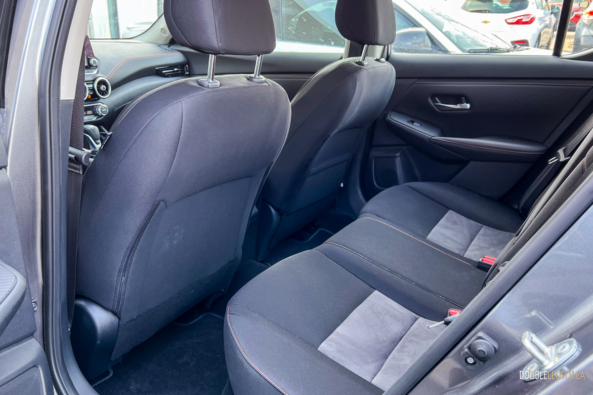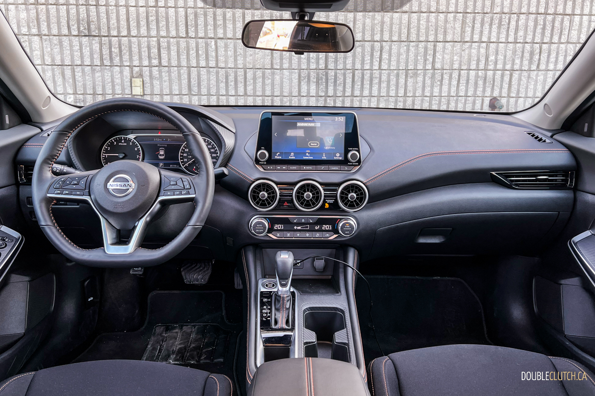Inside, most will be pleasantly surprised with the quality of materials used. Most surfaces are soft touch materials and don’t feel like you’ve been placed in a penalty box like the Hyundai Elantra, which has more hard surfaces in exchange for more technology. The Sentra Midnight Edition is a much nicer place to be especially when sitting in traffic or on long road trips, with very comfortable Zero Gravity seats. Orange stitching is used throughout to break up the black interior and can be found on the steering wheel, dash, console, doors and seats.