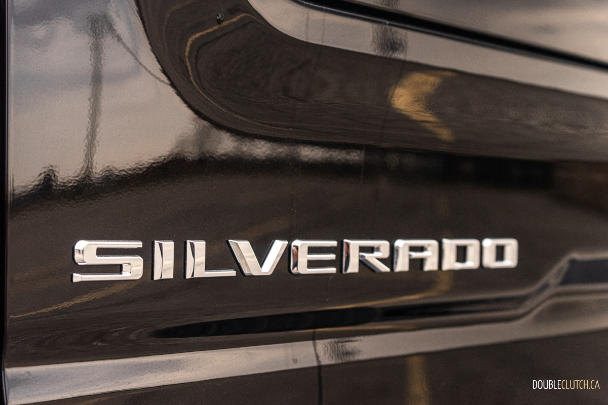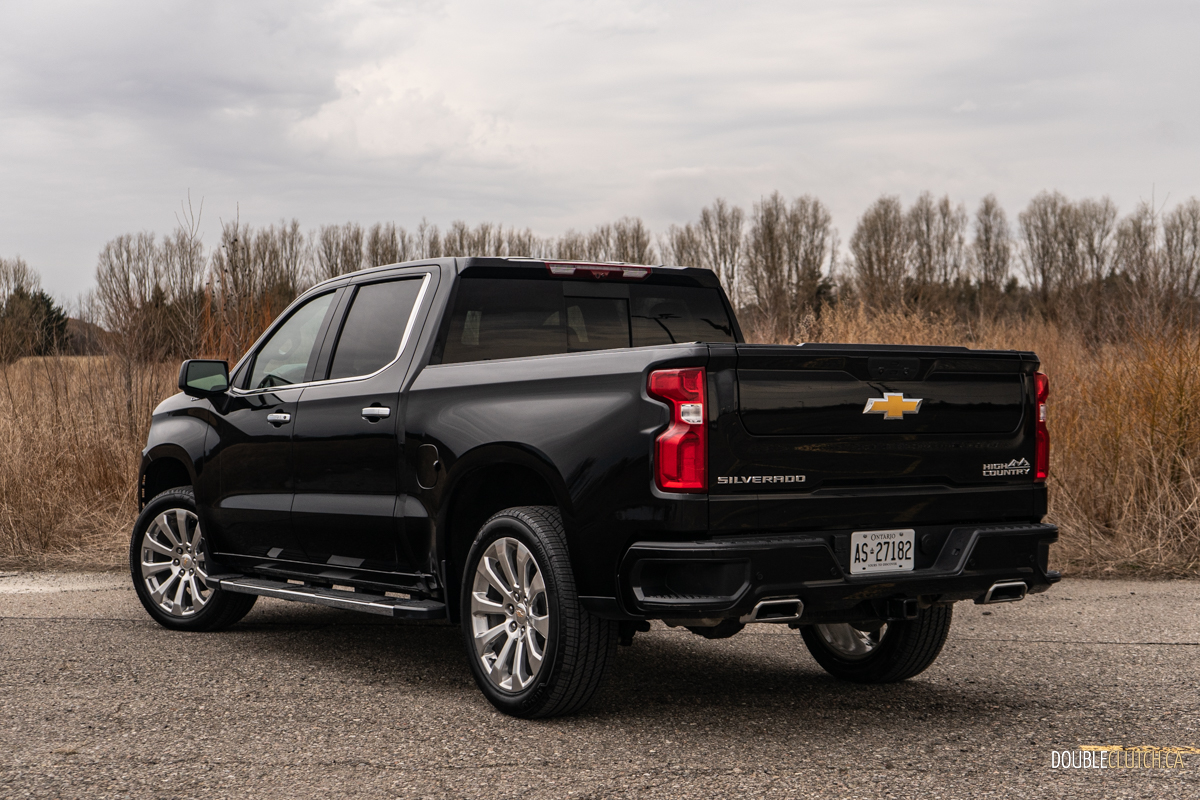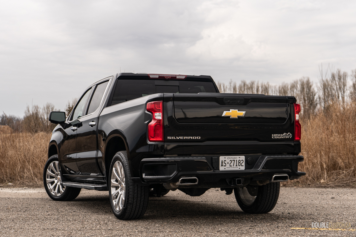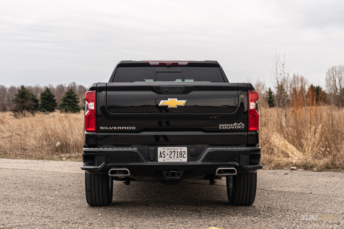 The Chevrolet Silverado is now into its fourth year on the fifth-generation platform, yet to my eyes it still looks very fresh. This may be because the proportions of the fifth generation haven’t grown on me as much as previous generations; the needlessly high hood and raised body line make it seem like the design is striving to look bigger than it really is. That said, overall exterior fit and finish on our High Country is quite nice, and the miles of flashy chrome, bright polished 22-inch wheels, Mosaic Black paint and nice touches such as dual exhaust tips integrated into the rear bumper, do help to distract from some of the awkward lines.