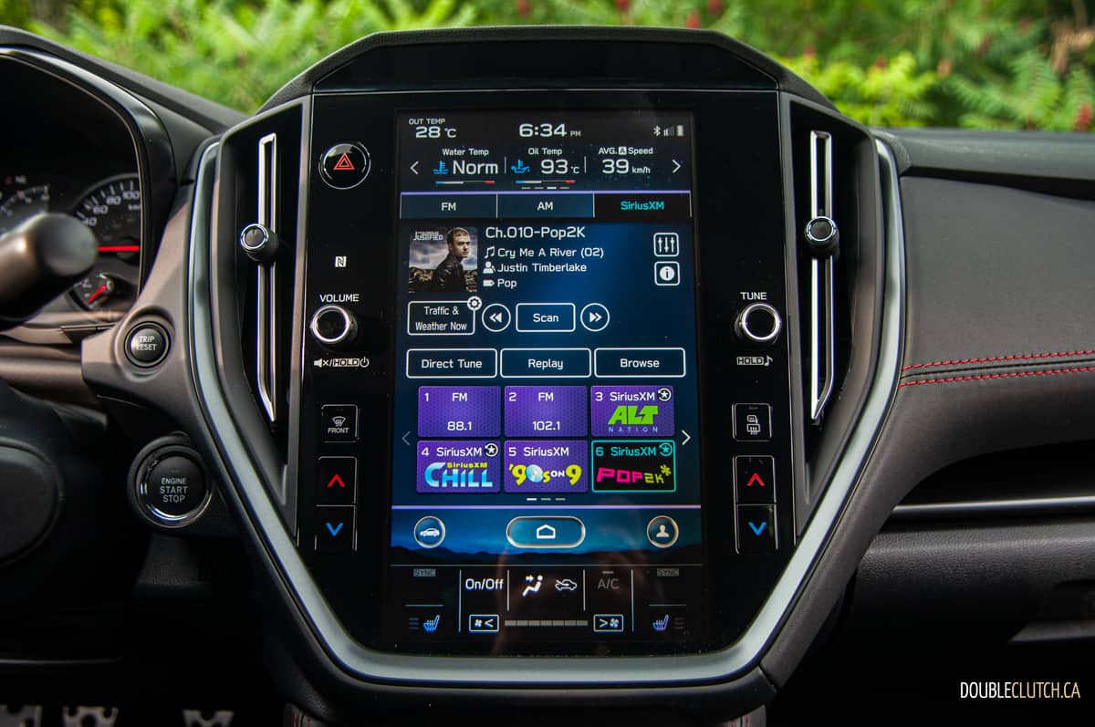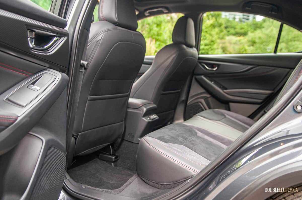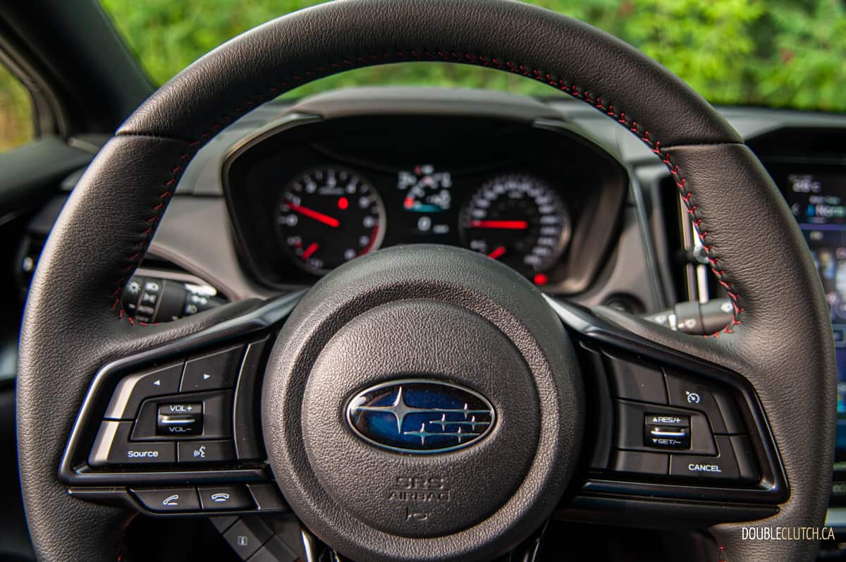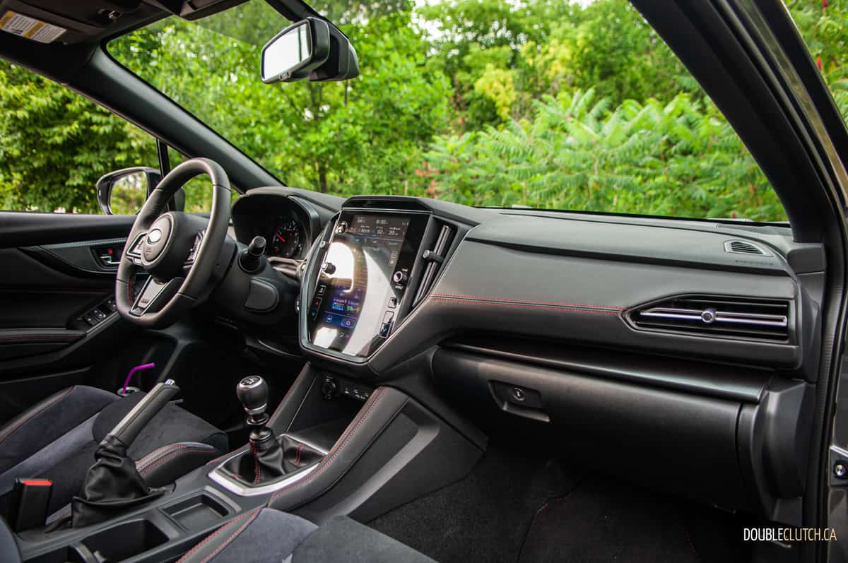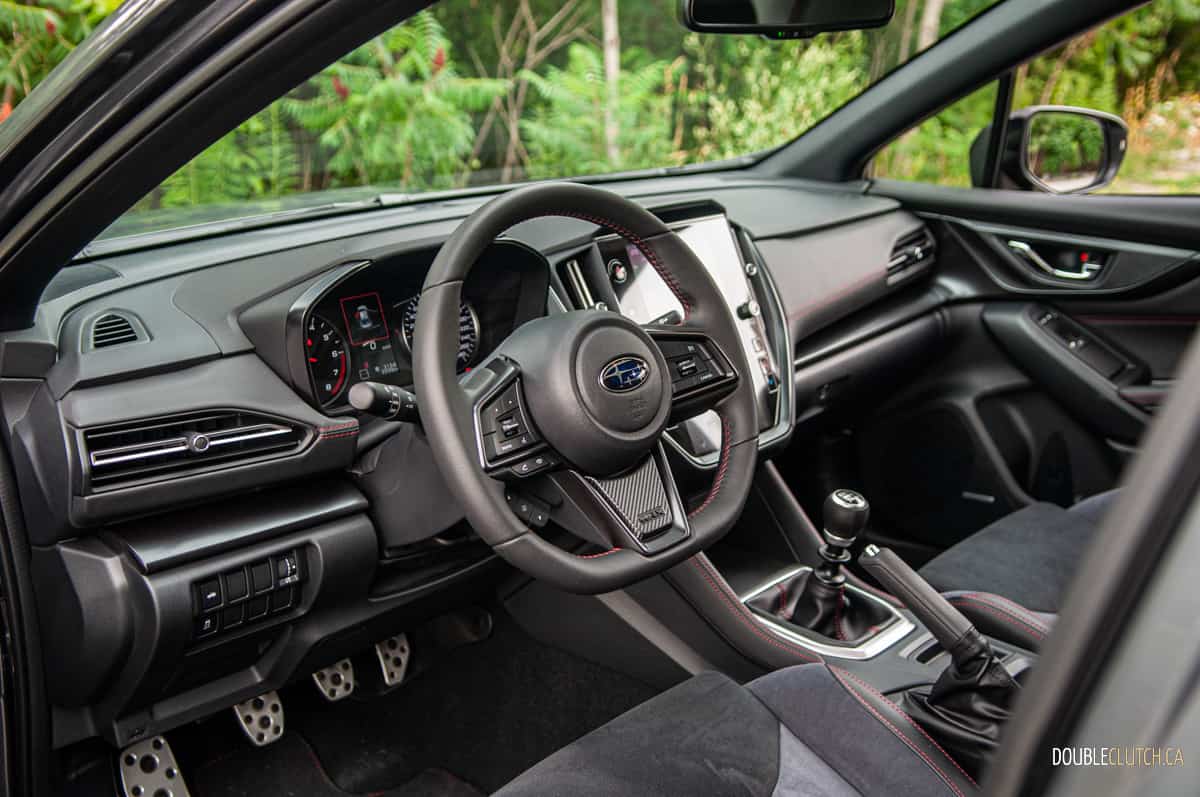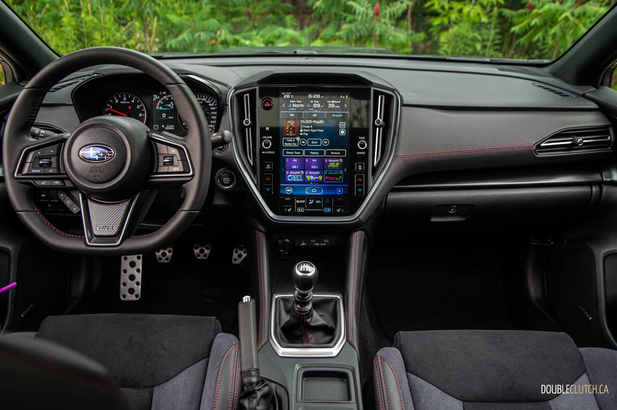 Rather than the simpler infotainment and centre stack setup we’ve seen in the Impreza and Crosstrek, the WRX draws inspiration from the setup we’ve seen in the Ascent, Legacy, and Outback. Base cars get a pair of seven-inch touchscreen displays stacked atop each other surrounded by matte black plastic, but the higher-spec Sport and Sport-tech trims get a portrait-oriented 11.6-inch touchscreen. We’ve said our piece before about this arrangement, so at the risk of repeating ourselves, we’ll just leave it at this: at least there are physical volume and tuning knobs, and at least Apple CarPlay and Android Auto are standard.