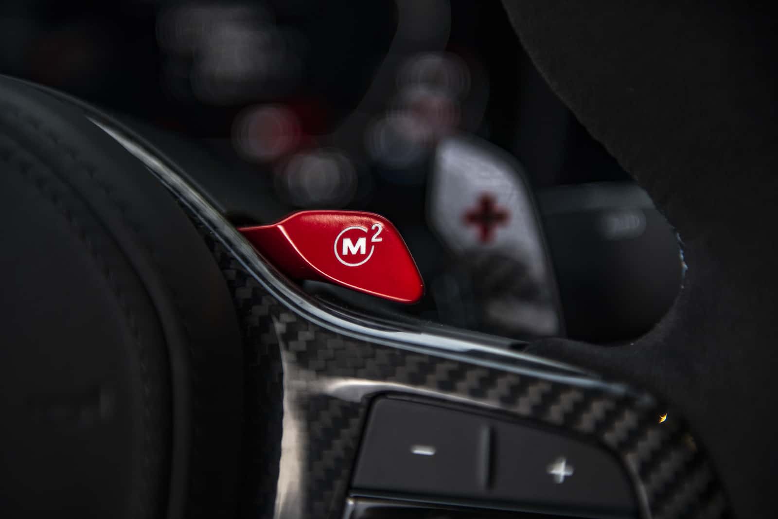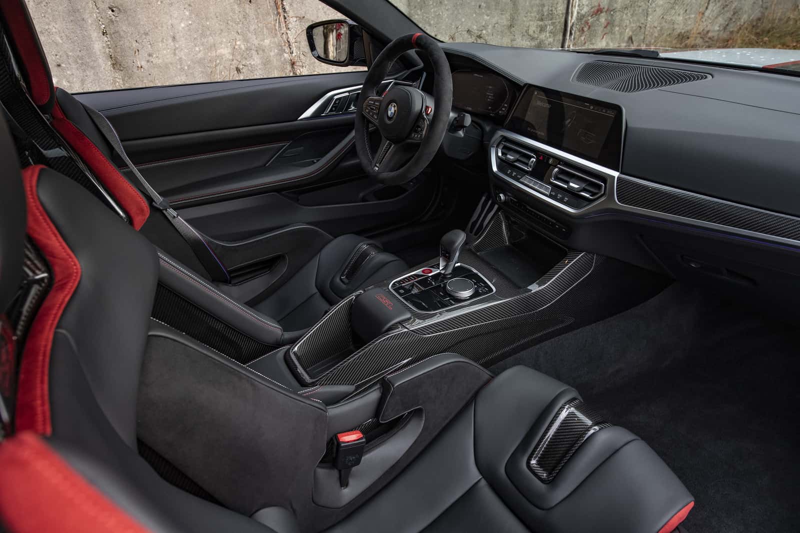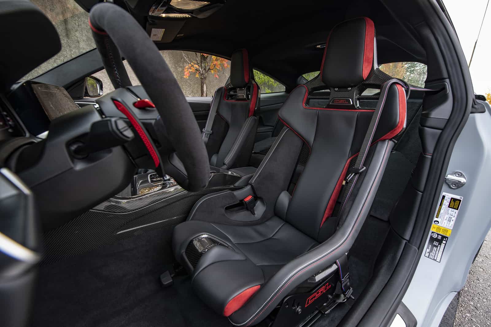 Moving on inside where we observed the extreme diet in full force; first thing you notice as soon as you open the doors is a pair of track-ready M Carbon full bucket seats that shave 53 pounds from the standard set, plus the deletion of the rear seats and seat belts that removed another 46 pounds. The use of ultra-lightweight sound insulation (read: nearly nonexistent sound deadening), thinner floor mats, and modified automatic climate control helped shed another 40 pounds or so, bringing the total curb weight to 3,640 pounds –a total of 240 pounds over a standard M4.