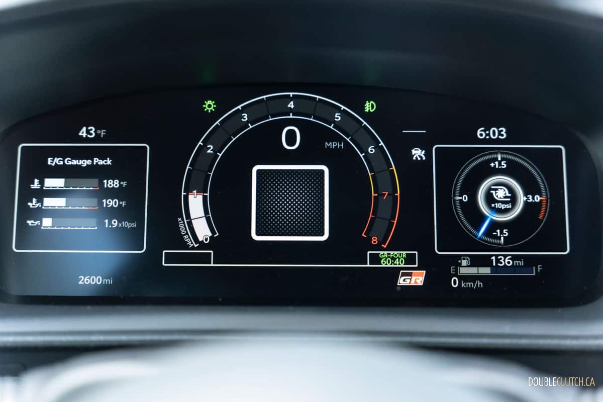 From the cockpit, we notice there is good visibility thanks to the GR Corolla’s large windows and side mirrors. Headroom is not an issue even with helmet use, and the bucket seats did an acceptable job fixating us and are relatively comfortable even for long drives. We liked the 12.3-inch digital instrument cluster that displays vital information such as all-wheel-drive mode, gear position, turbo pressure, as well as an easy-to-read tachometer with flashing shift indicator that was crucial in keeping us informed while minimizing attention away from the roads ahead.