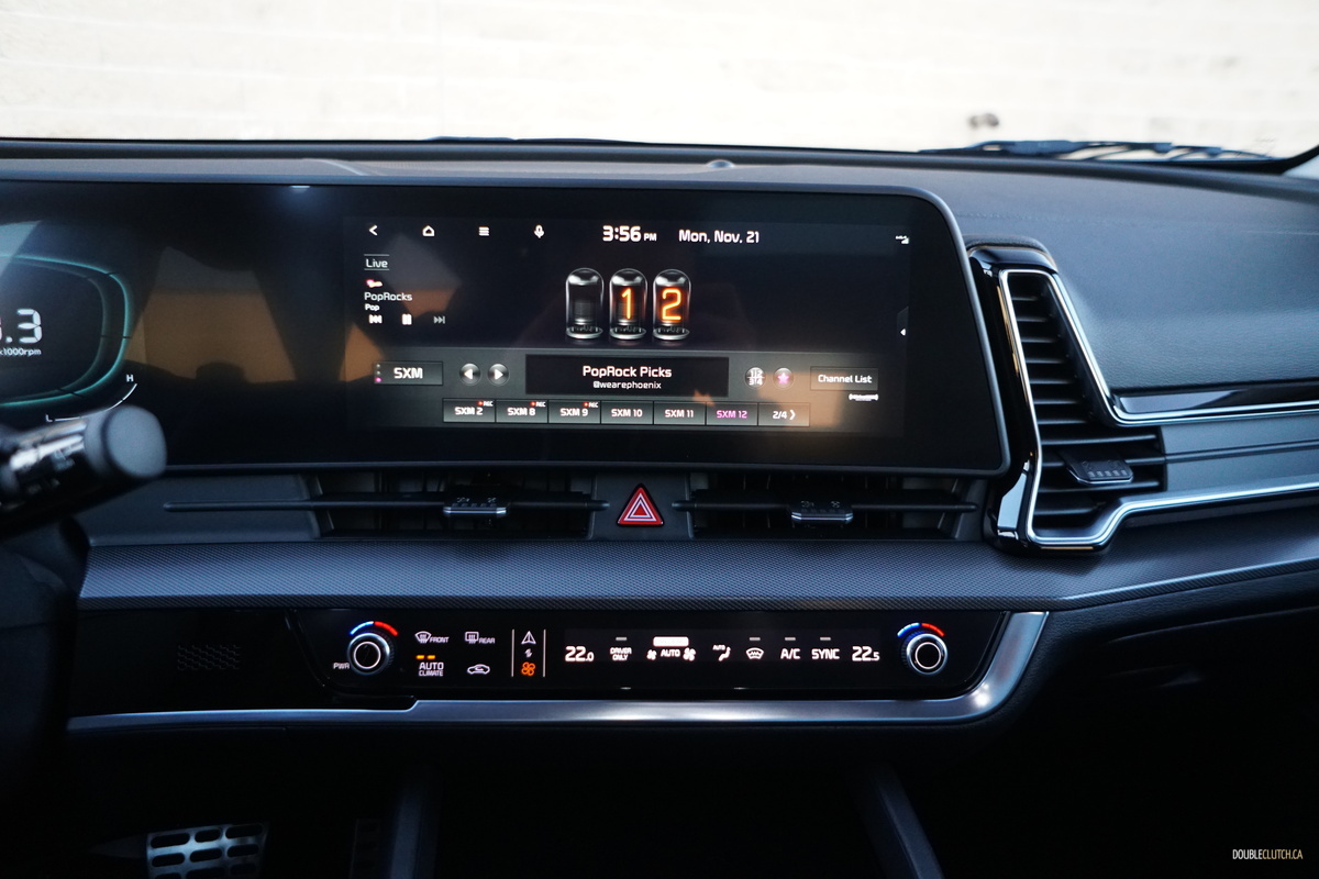 The interior space has gotten a makeover too, following the slick, tech-forward example set by the EV6. Everything that isn’t leatherette is gloss black, and while we normally complain about it collecting fingerprints and dust, we can’t deny that it makes the Sportage look more expensive than it actually is. Kia’s switchable 2-mode capacitive touch strip for climate/infotainment controls from the EV6 and Niro makes a return here, and we still don’t love it. It looks great and sounds like a good idea, but it’s way too easy to nudge something you didn’t intend to and end up inadvertently cranking the heat when you meant to turn up the volume.