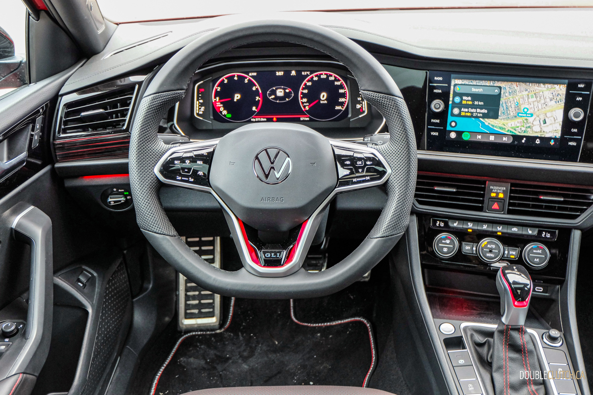 Inside, Volkswagen has the 10.25-inch Digital Cockpit Pro that looks fantastic. I love the option of having a map right behind the steering wheel, nestled neatly between the configurable gauges. This gives the GLI a more upscale look that is missing from its competitors. Black leather heated and ventilated seats with red perforation are standard here and are welcomed with open arms. From afar, the interior looks upscale and the touch points feel good, but upon closer inspection, hard plastics are found making up the majority of the dashboard, door panels, and center console.