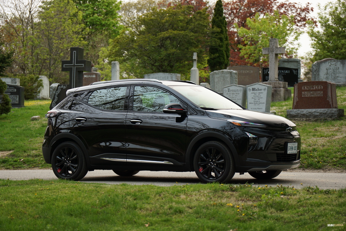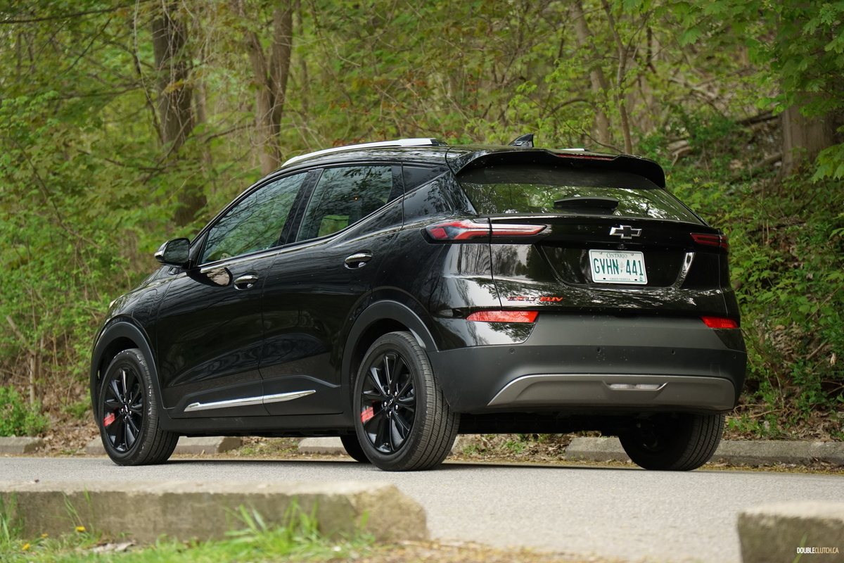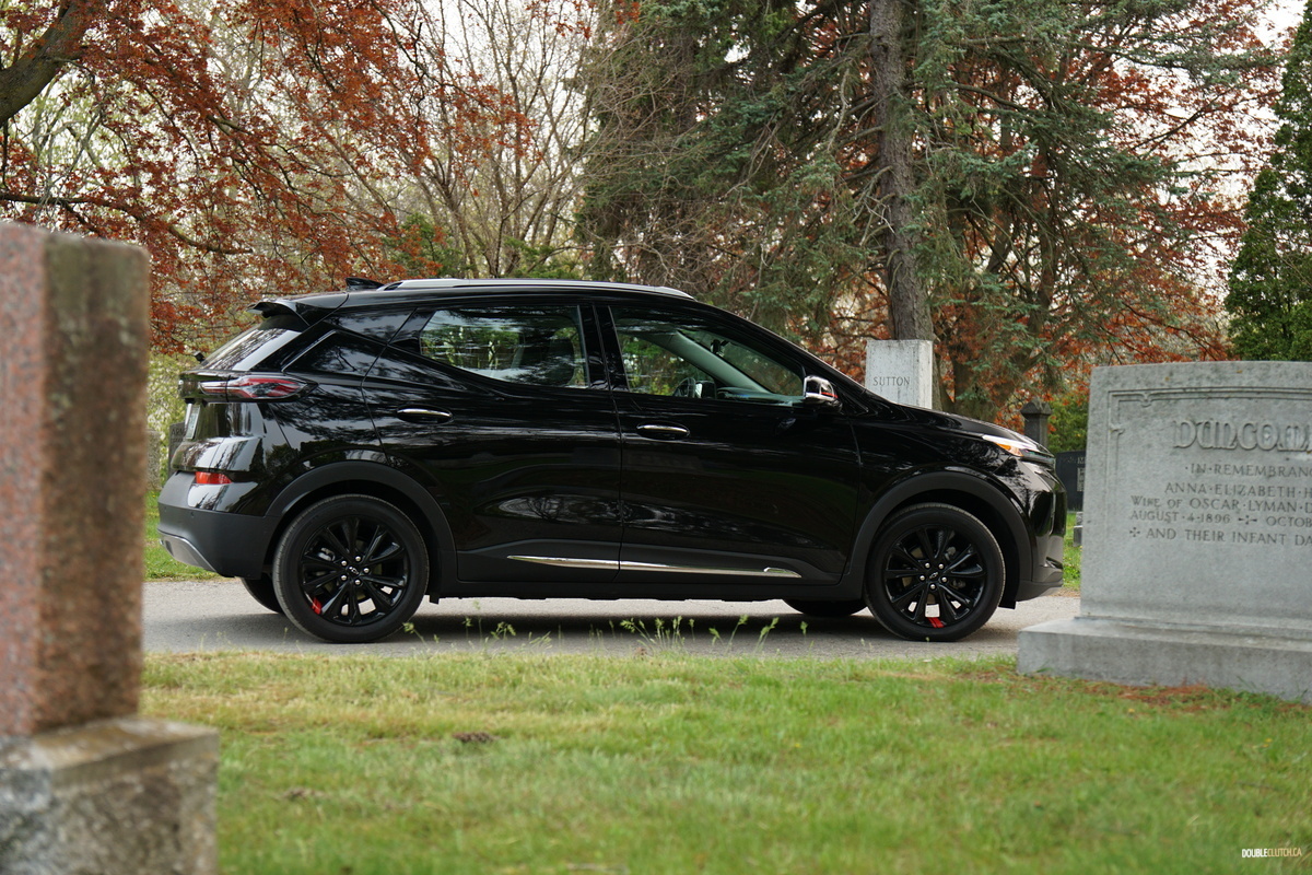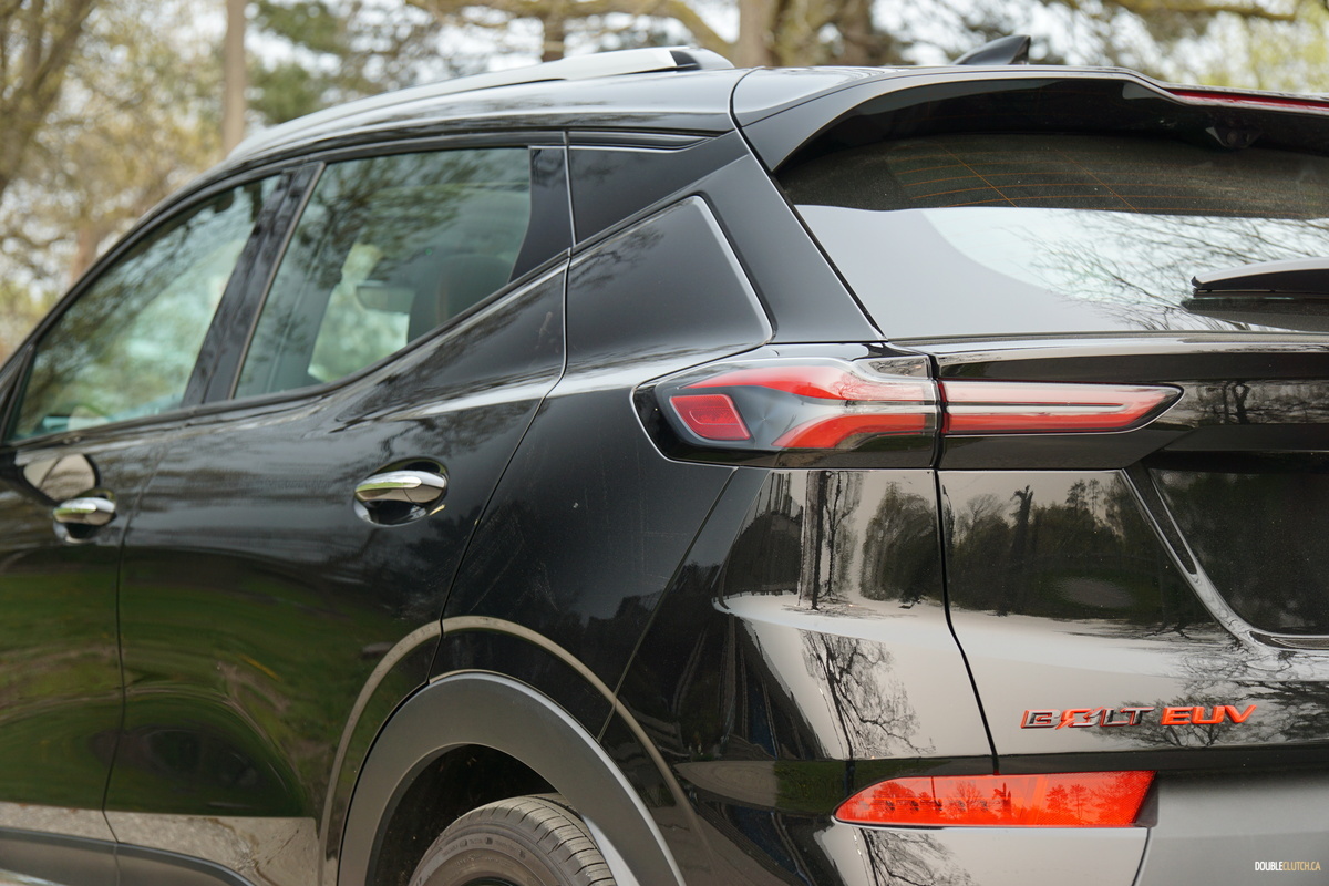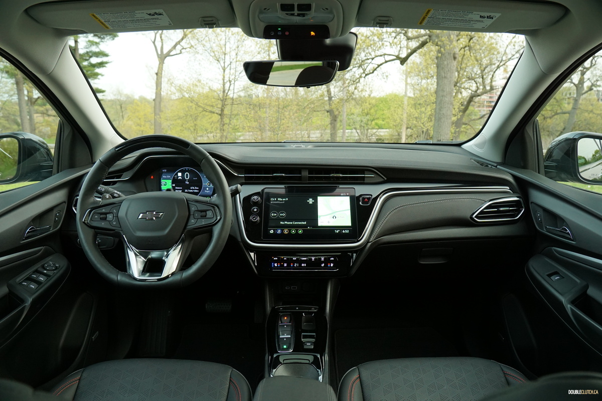 Our Bolt test vehicle came draped in appropriate garb for its own funeral, wearing Mosaic Black paint, along with black wheels, as part of the $570 Redline edition package, which includes said wheels and red highlights, serving to breathe a last gasp of life into the doomed Bolt. Its 2022 facelift still looks fresh, giving it tight, contemporary styling that admittedly is not quite as interesting as something like an Ioniq 5 but neatly manages to avoid being a Tesla clone. It’s still a sharp looking little orb, but we’d prefer it with less somber coloring.