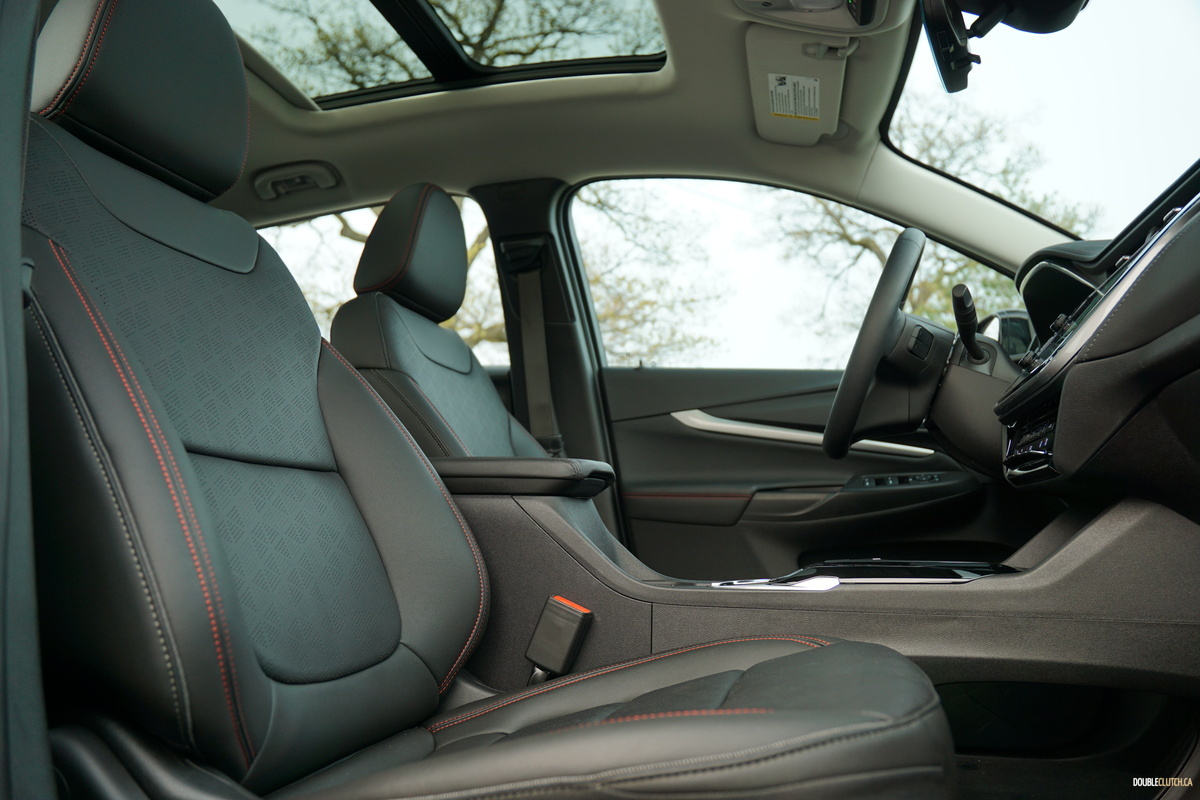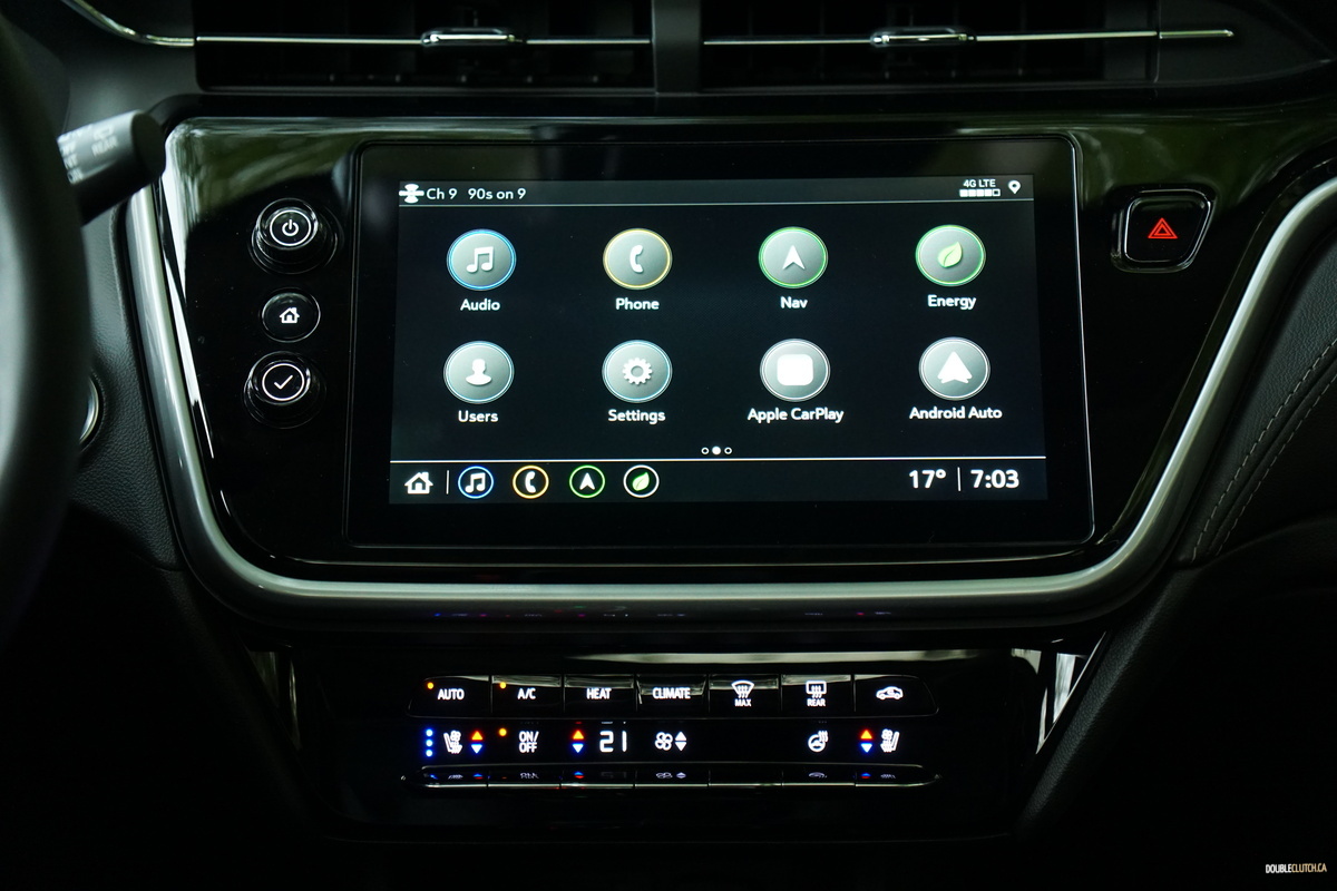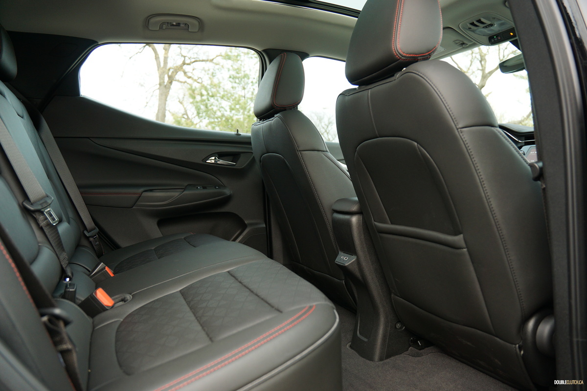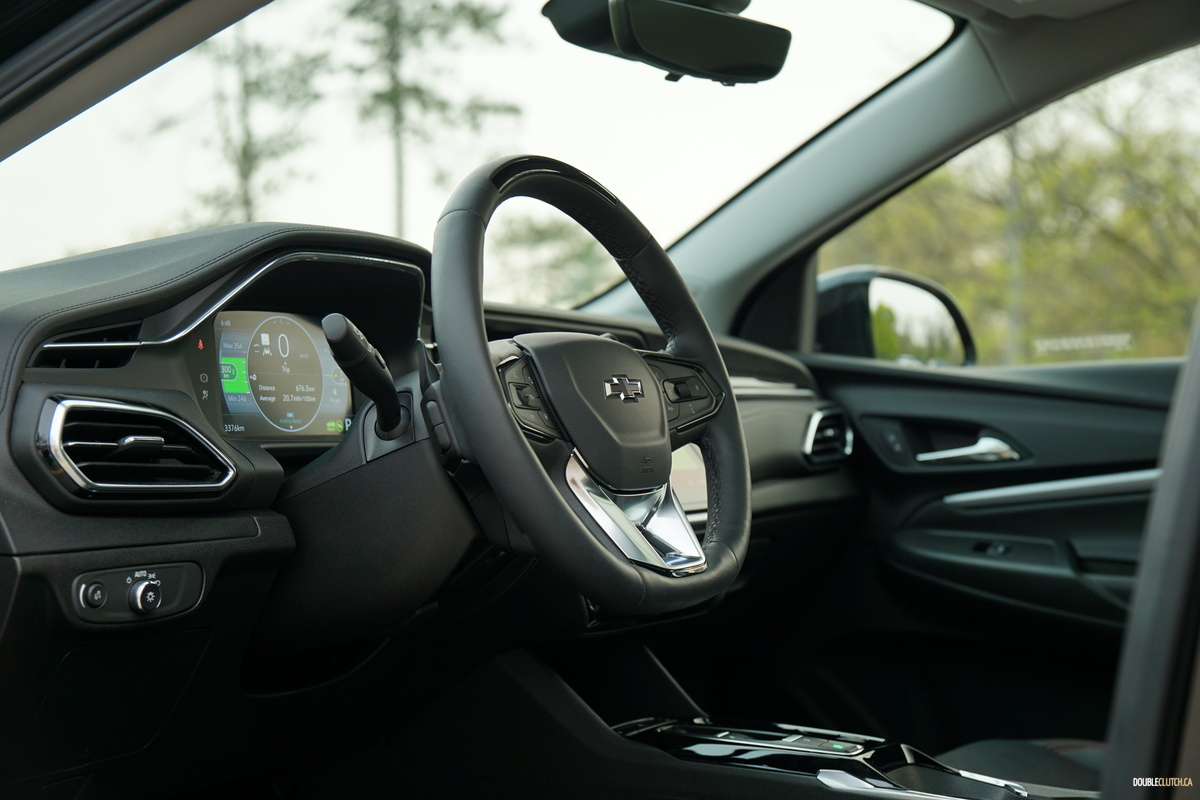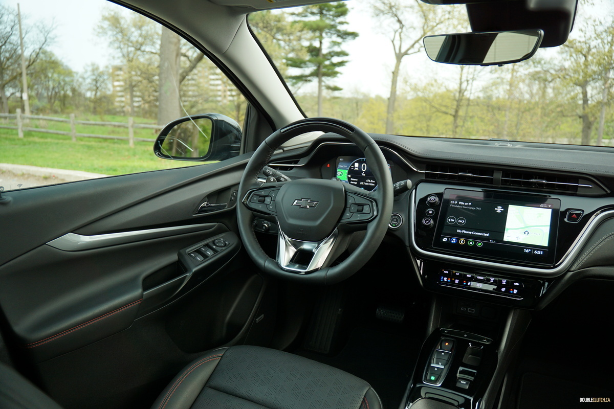 Our Bolt EUV’s cabin makes for a nice place to sit, with perforated, powered, heated, and ventilated leather seats, lots of metallic accents to brighten things up, and panoramic sunroof for natural levity. Unlike seemingly every other EV on the market, it deliberately strays away from hyper-futurism, opting instead for a nice blend of modern form and classic function. Modernity comes in the form of a piano black (ugh) center stack, framing a 10.26-inch touchscreen with a crisp display and sharp reflexes, and functionality comes in the form of sensibly placed physical buttons, and knobs for volume and tuning – brilliant.