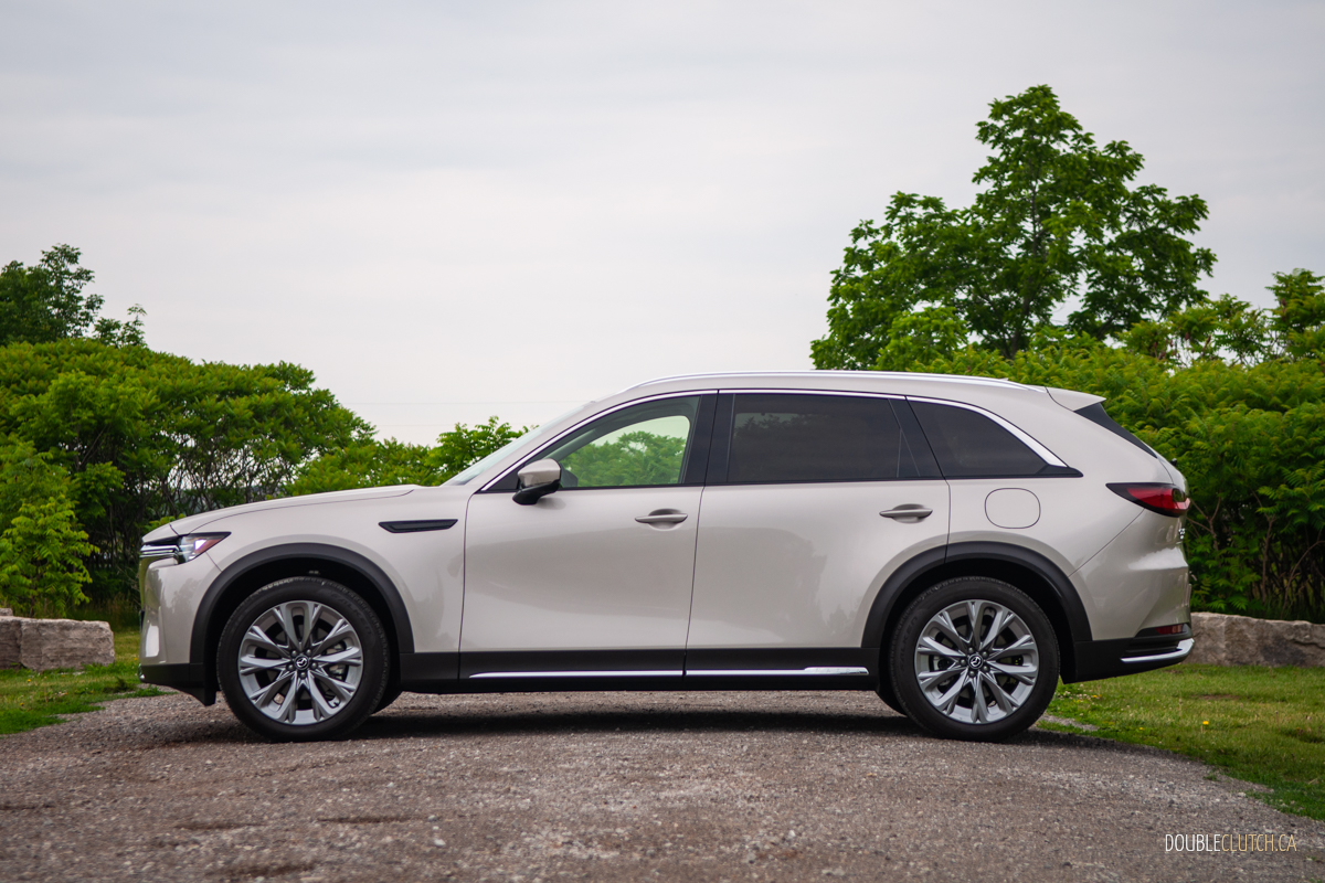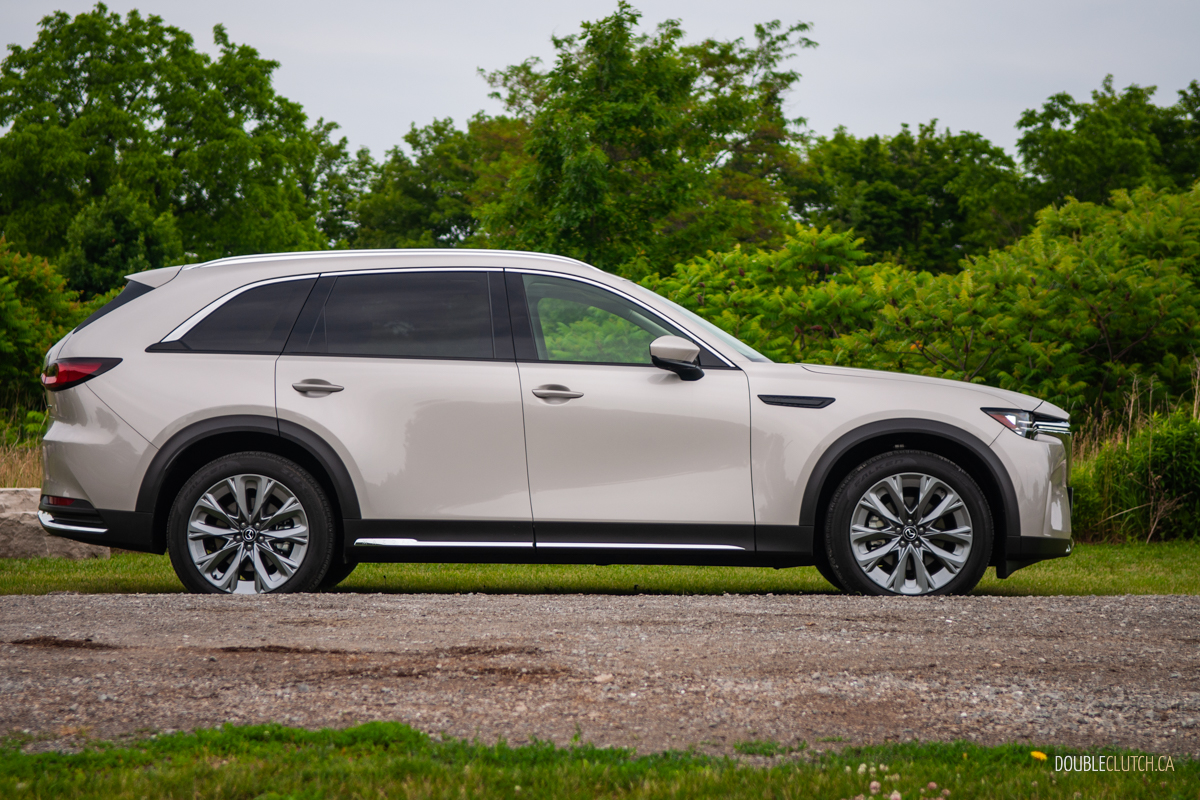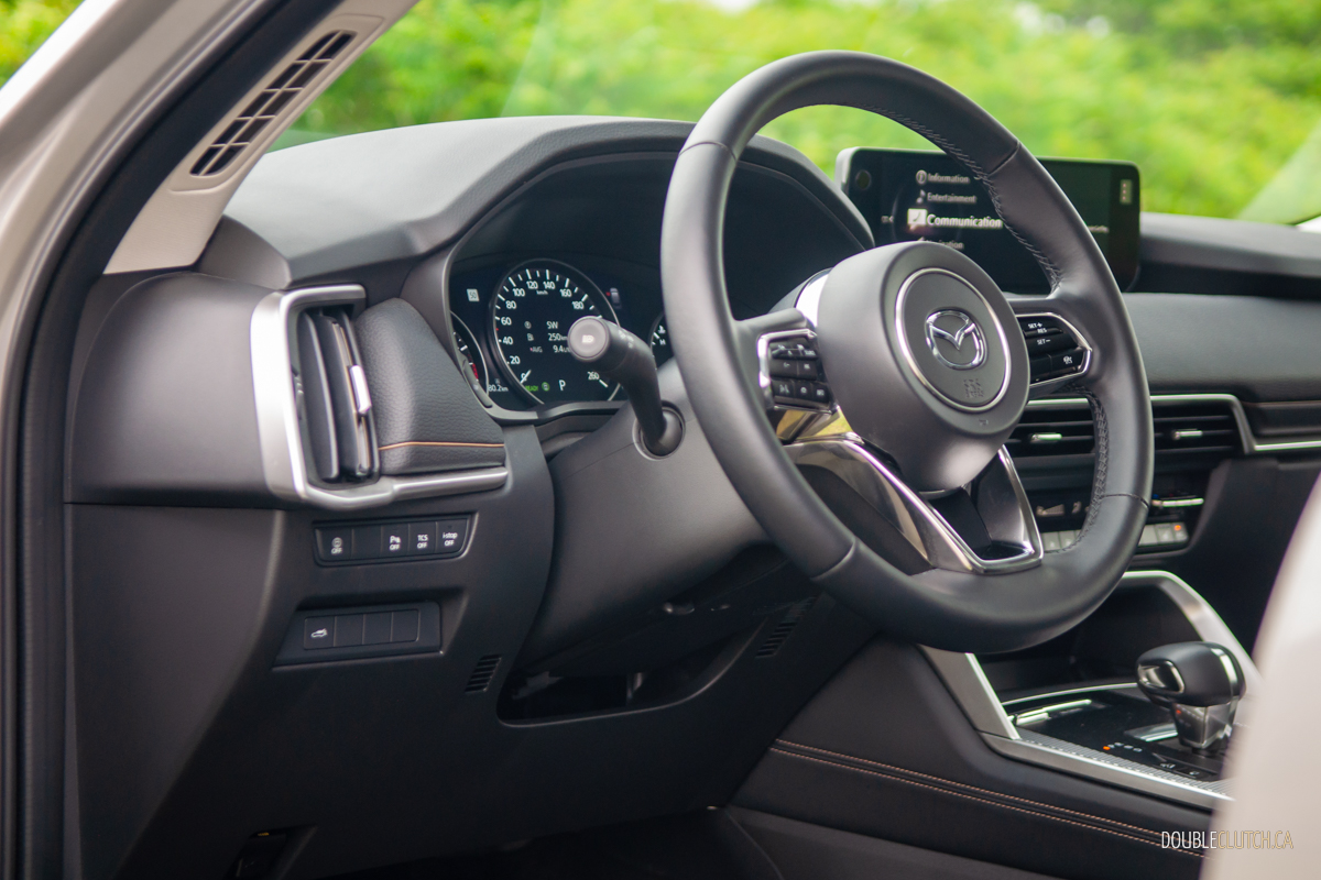 Stepping up to the CX-90’s GT-P and Signature trims ups output to 319 hp and 369 lb-ft of torque on 87-octane gas; feed it 93 and you get another bump to 340 ponies, but whether that minuscule bump worth the price difference between hogwash and high-test is up to you. Officially, the base sixer sips 9.9 L/100 km city, 8.4 highway, and 9.3 combined; we averaged 9.2 L/100 km over a fairly even city/highway split. Commendably miserly, given the CX-90’s sheer size.