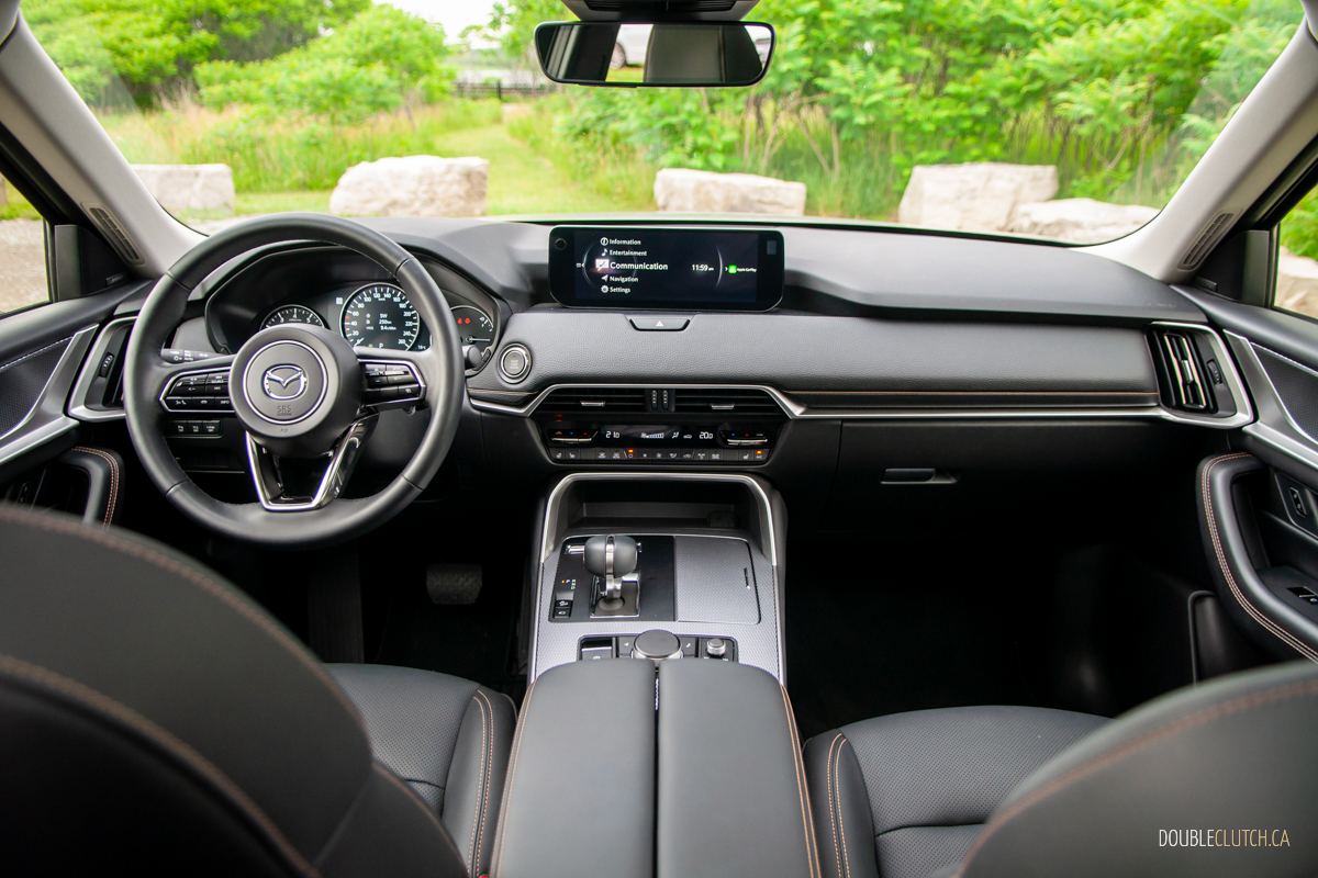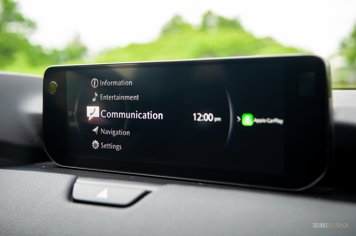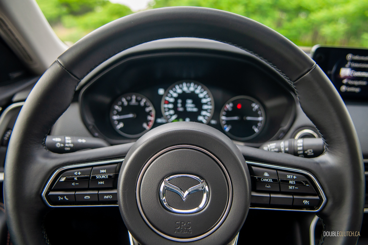 The rest of the interior is mostly well-executed. Visibility all around is good, finding a comfortable driving position is a piece of cake, and infotainment is handled by a 12.3-inch display mounted atop the dashboard. It operates no differently than other Mazdas, including the click-wheel on the centre console, so we’ll simply leave it at this: it’s intuitive enough once you’ve set up your presents, but operating Apple CarPlay or Android Auto — both of which are wireless, and standard — with the knob is awkward.