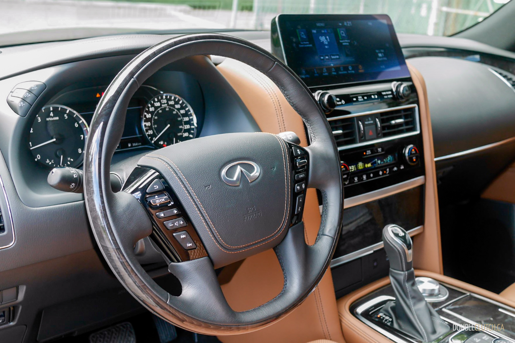 Slipping into the cabin is where things go a bit south. It’s not that what’s here isn’t of high-quality materials and excellent fit and finish, but rather the design is a bit long in the tooth the same way you might feel when looking at a mansion from the 1990s. Saddle brown leather with charcoal burl trim accents exude a timeless elegance, but clash somewhat by the large curved shapes on the dash. Plus, the giant centre console looks out of place in today’s age of clean lines and minimalism.