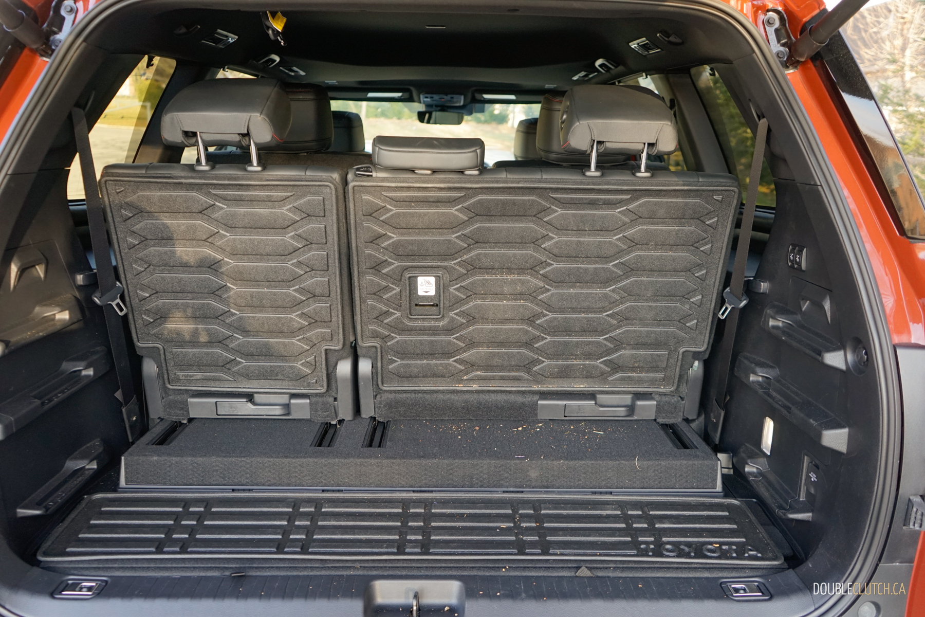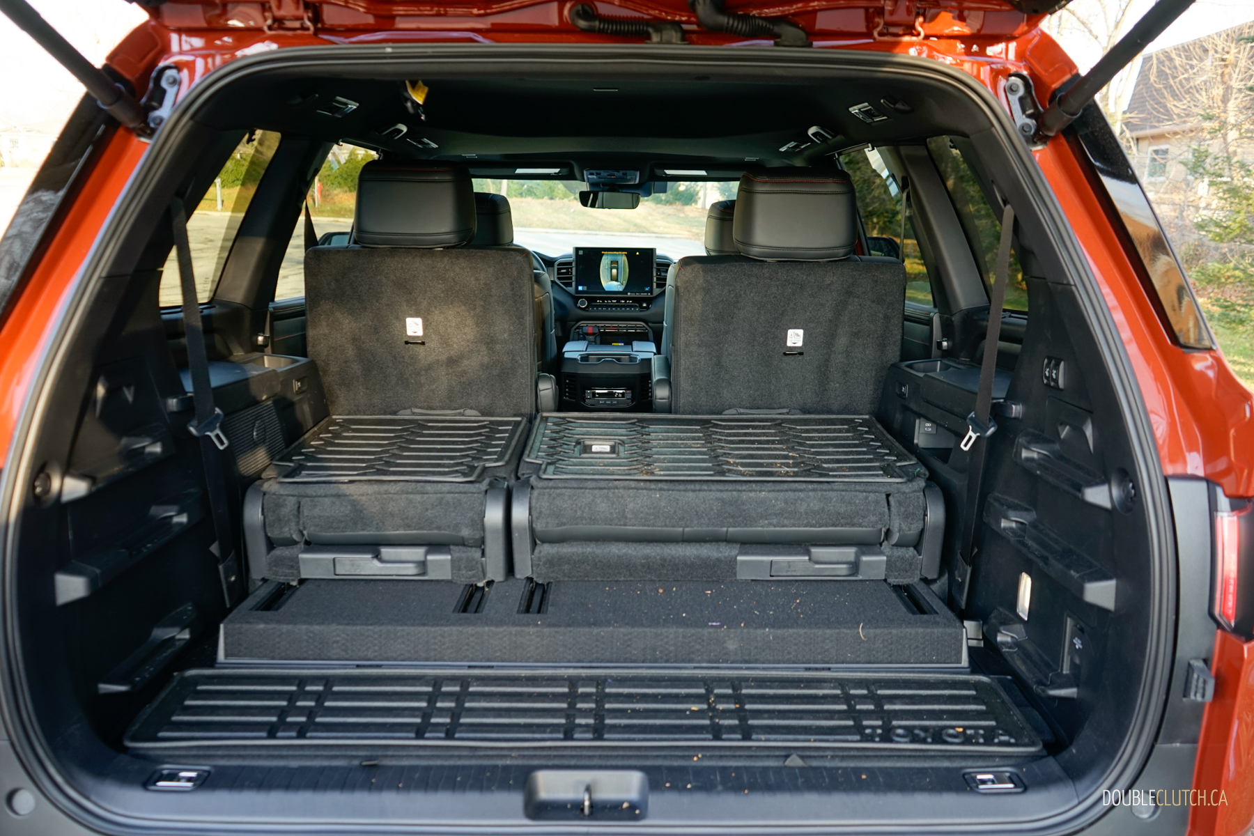 The Sequoia sees a complete refresh inside, too, with an all-new layout that looks clean and modern, and materials that feel quite premium for a truck-based SUV. The 14-inch touchscreen display offers clear resolution and houses an all-new infotainment system that is quite easy to use, and Android Auto and Apple CarPlay are both supported wirelessly. Given the massive size of this truck, it is no surprise to generous passenger space in the first two rows, especially with our tester’s second-row captain’s chairs. What was surprising was the lack of legroom in the third row, as well as the 326 litres of cargo space with the third row up. But you can slide the third-row bench forward for up to 631 litres of space with the seats up, and a new adjustable cargo shelf system allows you to store up to 100 pounds’ of junk in the trunk for more storage flexibility.