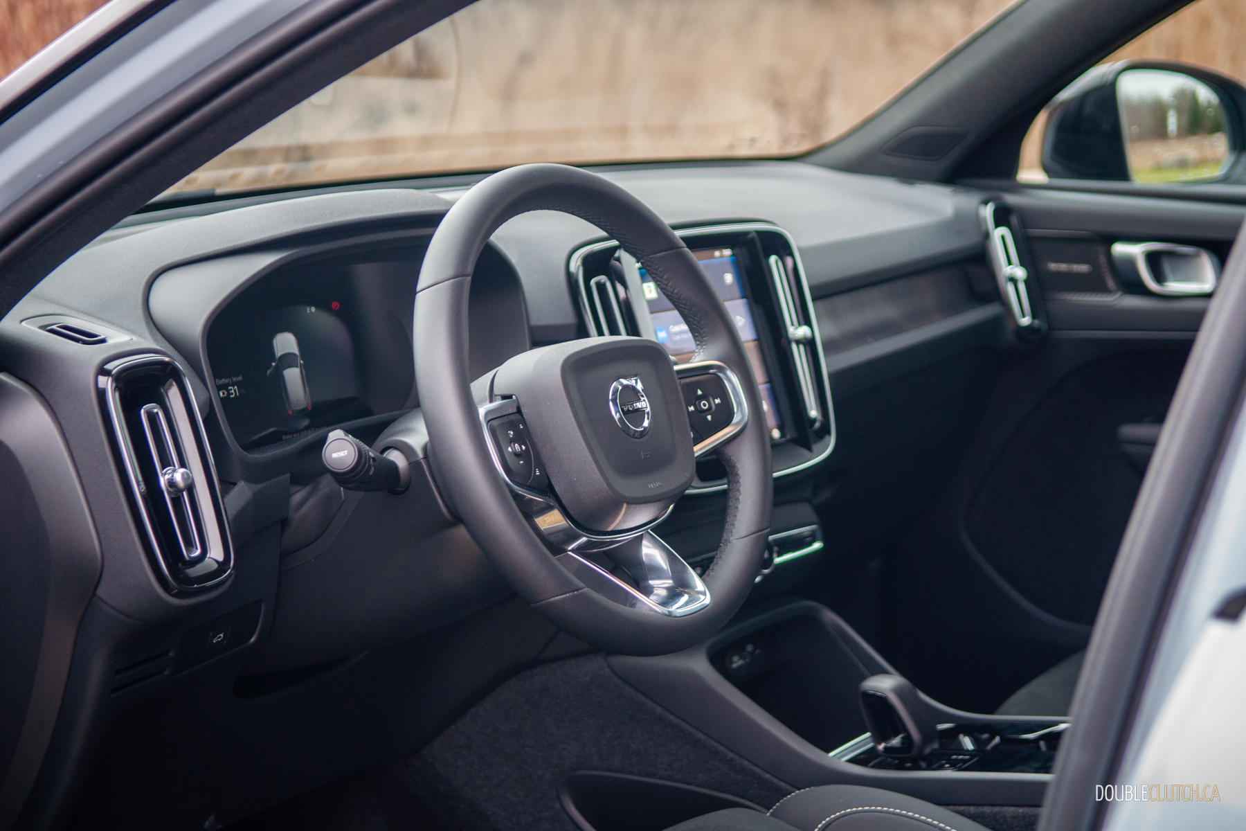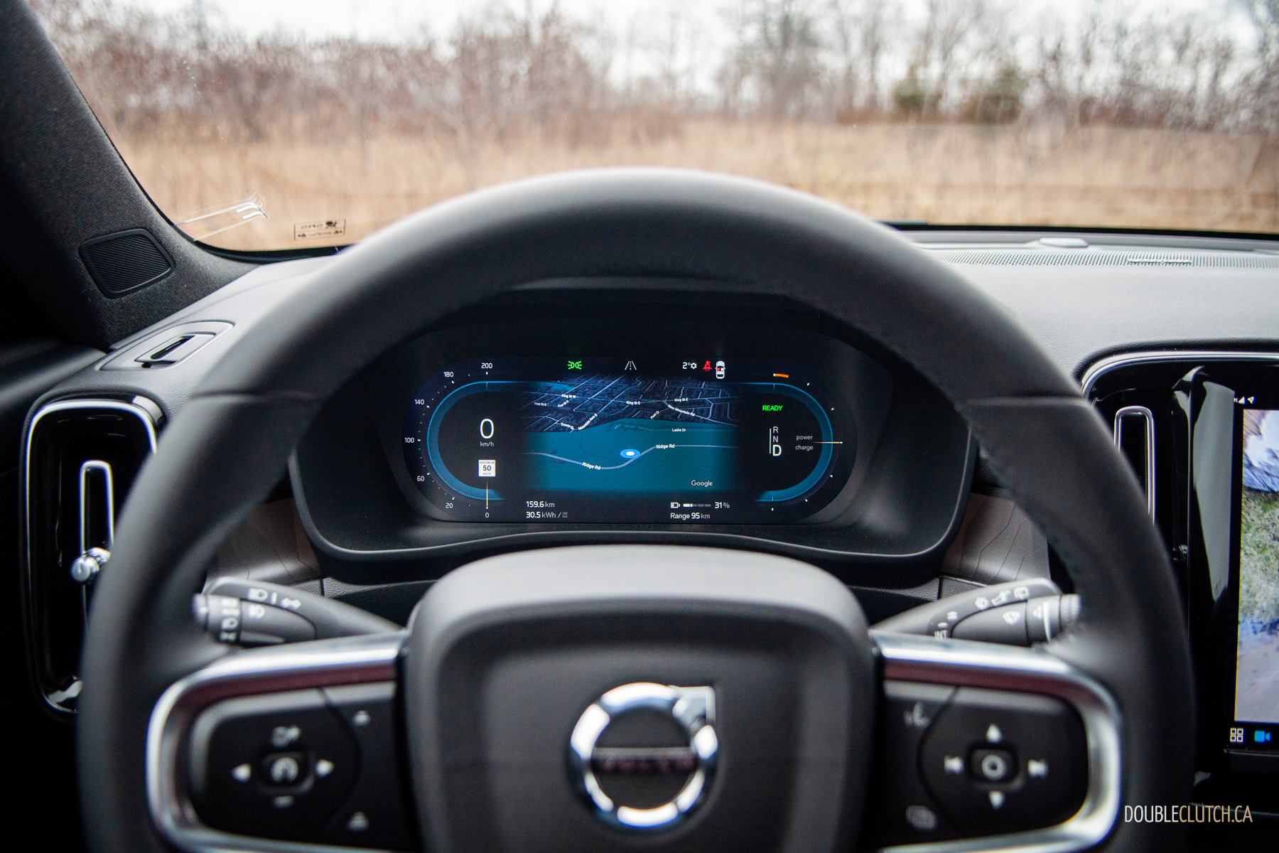Ah, about that. Despite the numbers Volvo officially quotes, not to mention the fact that our XC40 Recharge comes with a heat pump, our real-world experience yielded a big surprise. Look, we get that the cold affects EV range, and with temps hovering around the freezing mark, the 310 kilometres the XC40 promised on-board was still plenty. But using it like a normal car — climate control in auto and around 22 degrees Celsius, and not shying away from the heated seats, heated steering wheel, and defroster — the best we managed was 236 km on a full charge. We expected a hit in range, but not that much.