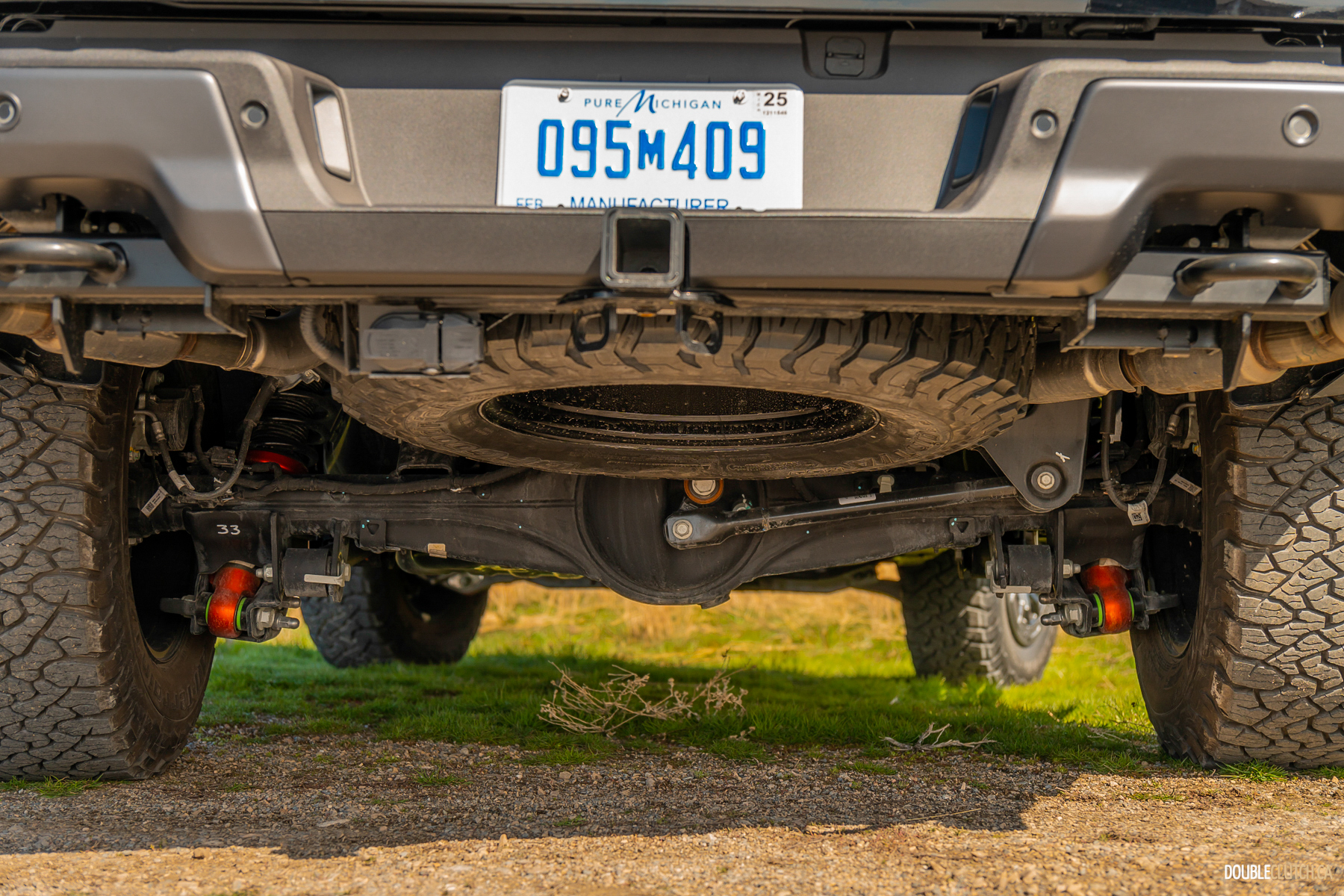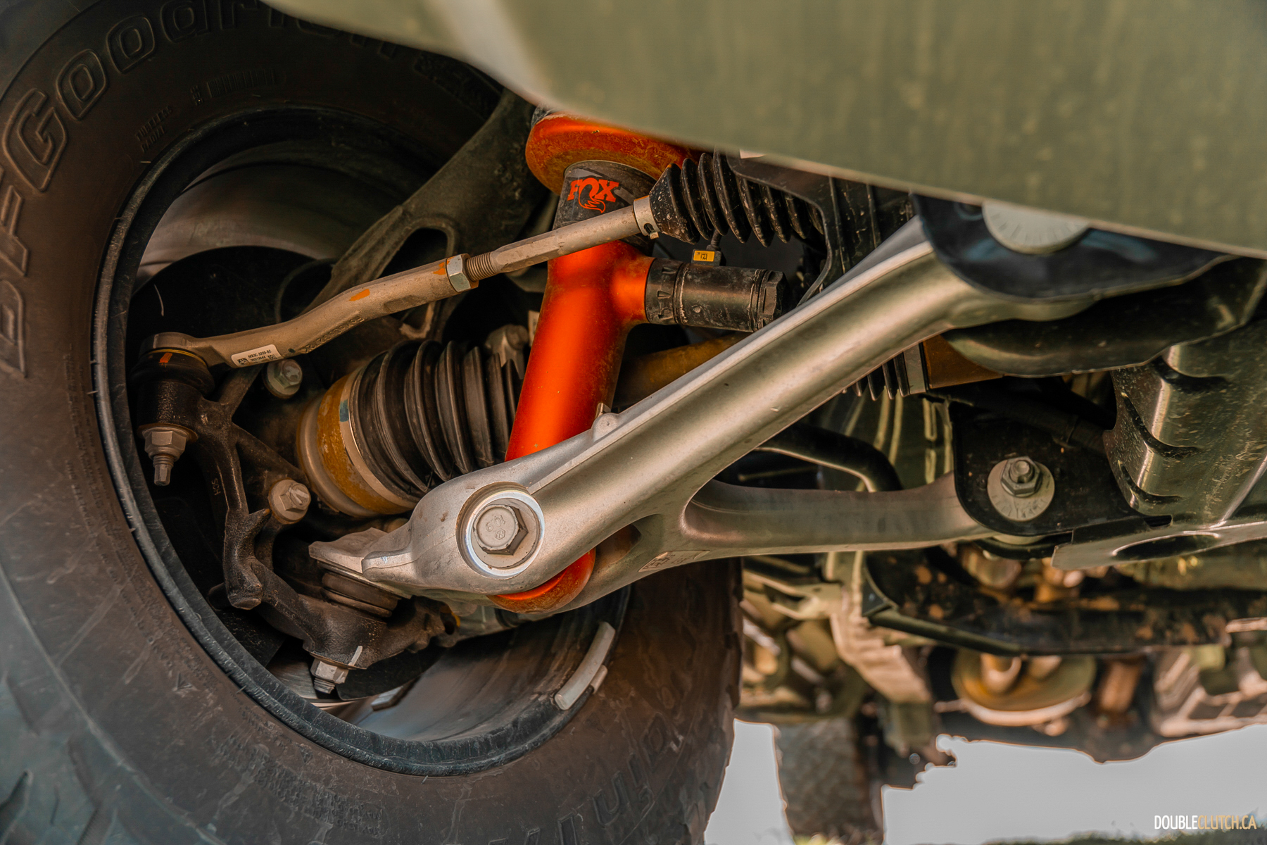 The front and rear sections of the frame are completely different. They both carry 3.5 additional inches of track width gained from relocating drive components, not just wheel offsets. The front is heavily reinforced with much tougher shock towers and gigantic forged aluminum control arms, while the rear is similarly built up with massive mounting points for the 2.5-inch Fox LiveValve dampers. Ford also uses a Watts Linkage to help triangulate the rear end under extreme cornering loads at any point of its foot-long travel.