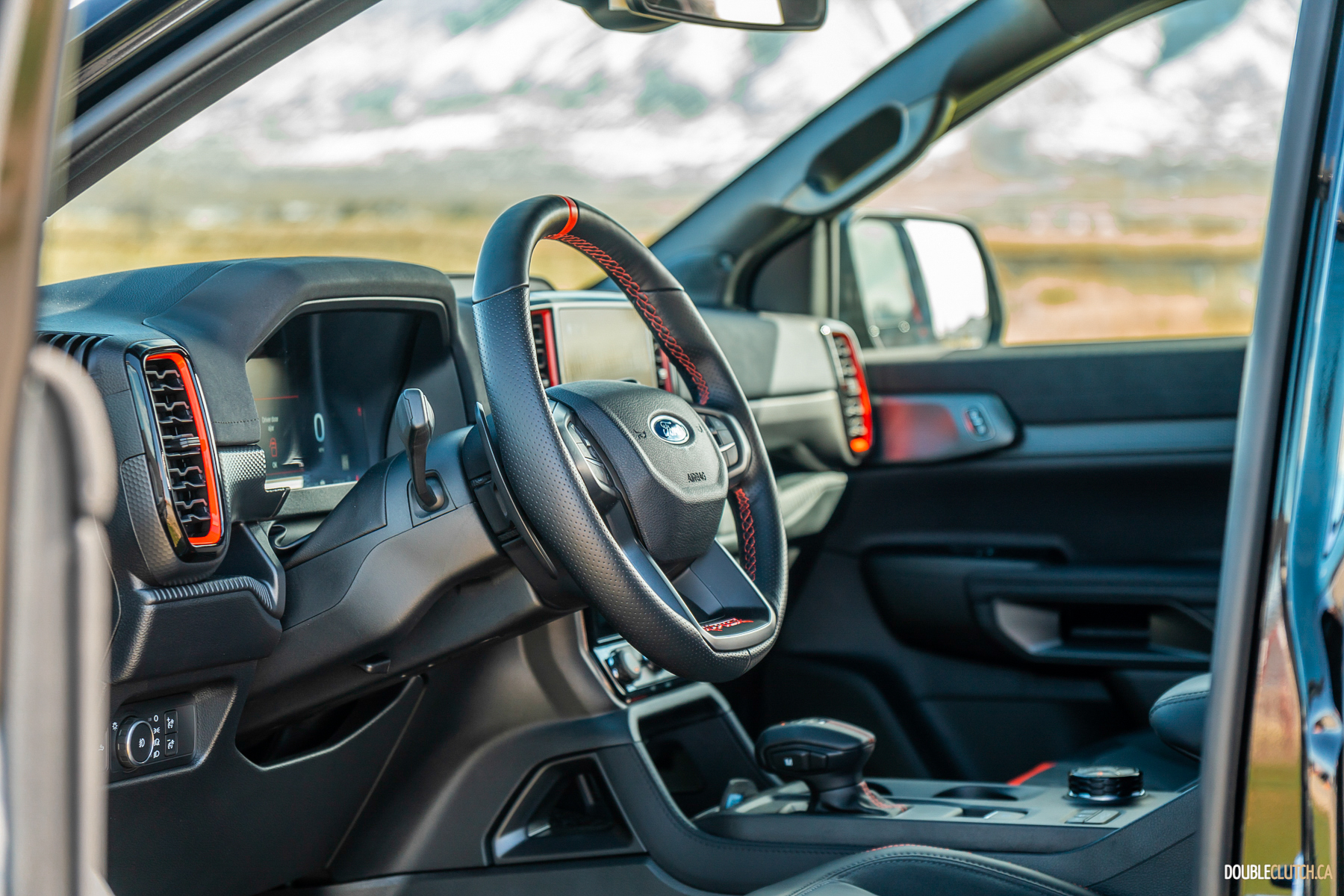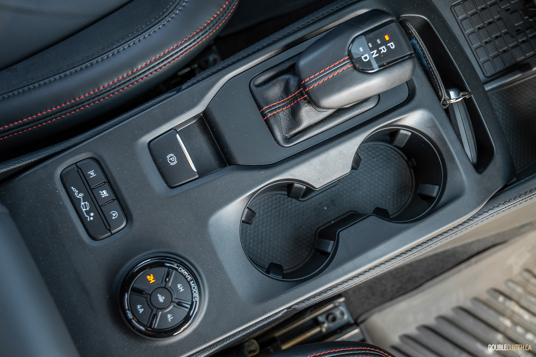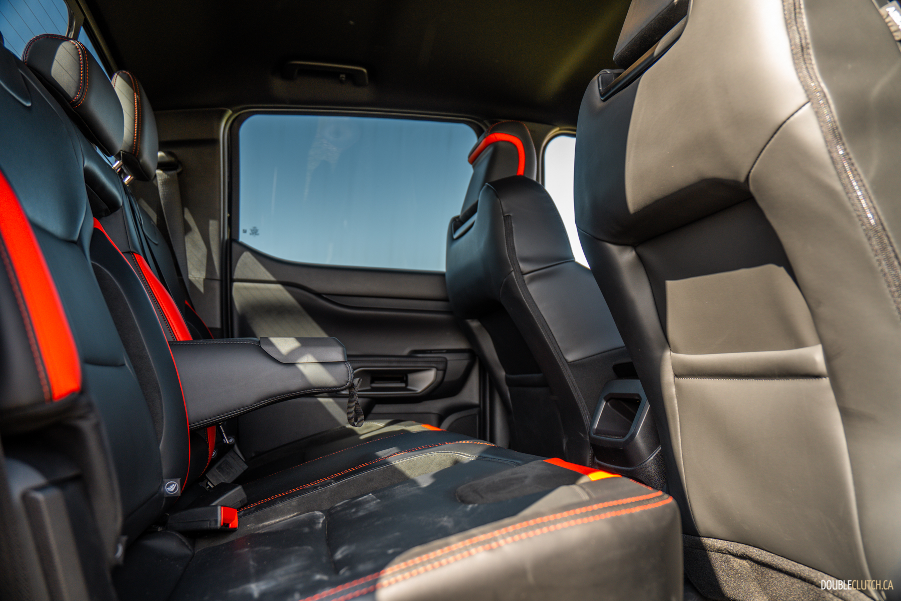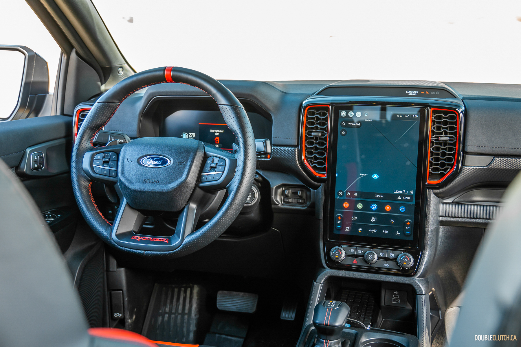 The Ranger Raptor is powered by a 3.0-litre twin-turbocharged V6, managed by a 10-speed automatic transmission. It’s very similar to what’s in the Bronco Raptor, but slightly re-tuned for a broader torque spread; 90 per cent of its 405 horsepower and 430 pound-feet of torque is available from idle all the way up to redline. It’s fitted with an anti-lag system that keeps the turbos spinning, so that pool of power is instantly ready to dig in and pull you through a muddy rut the instant you get back on the skinny pedal, with the 10-speed gearbox banging through gears all the way.