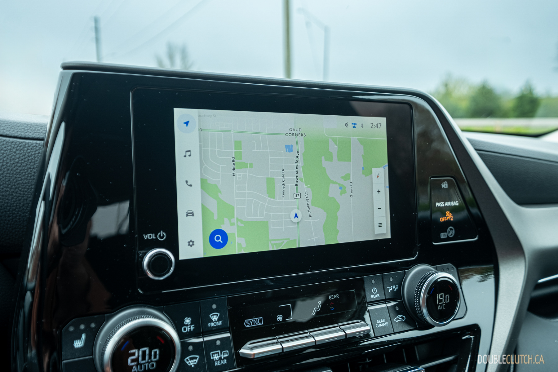 The Highlander’s hybrid powertrain doesn’t make the most pleasant noises when you wring it out, either, but I’ve noted similar moaning-and-groaning from the Mazda CX-90 PHEV, so it isn’t alone here. But around town, the noise won’t bother most since it’s relatively silent at normal speeds — and then there’s the fuel economy. Upon picking it up, the Highlander showed almost 800 kilometres of range on a full tank, and I barely got through half a tank in my week with it. I averaged 6.4 L/100 kilometres over a fairly even mix of city and highway driving, along with some lead-footedness.