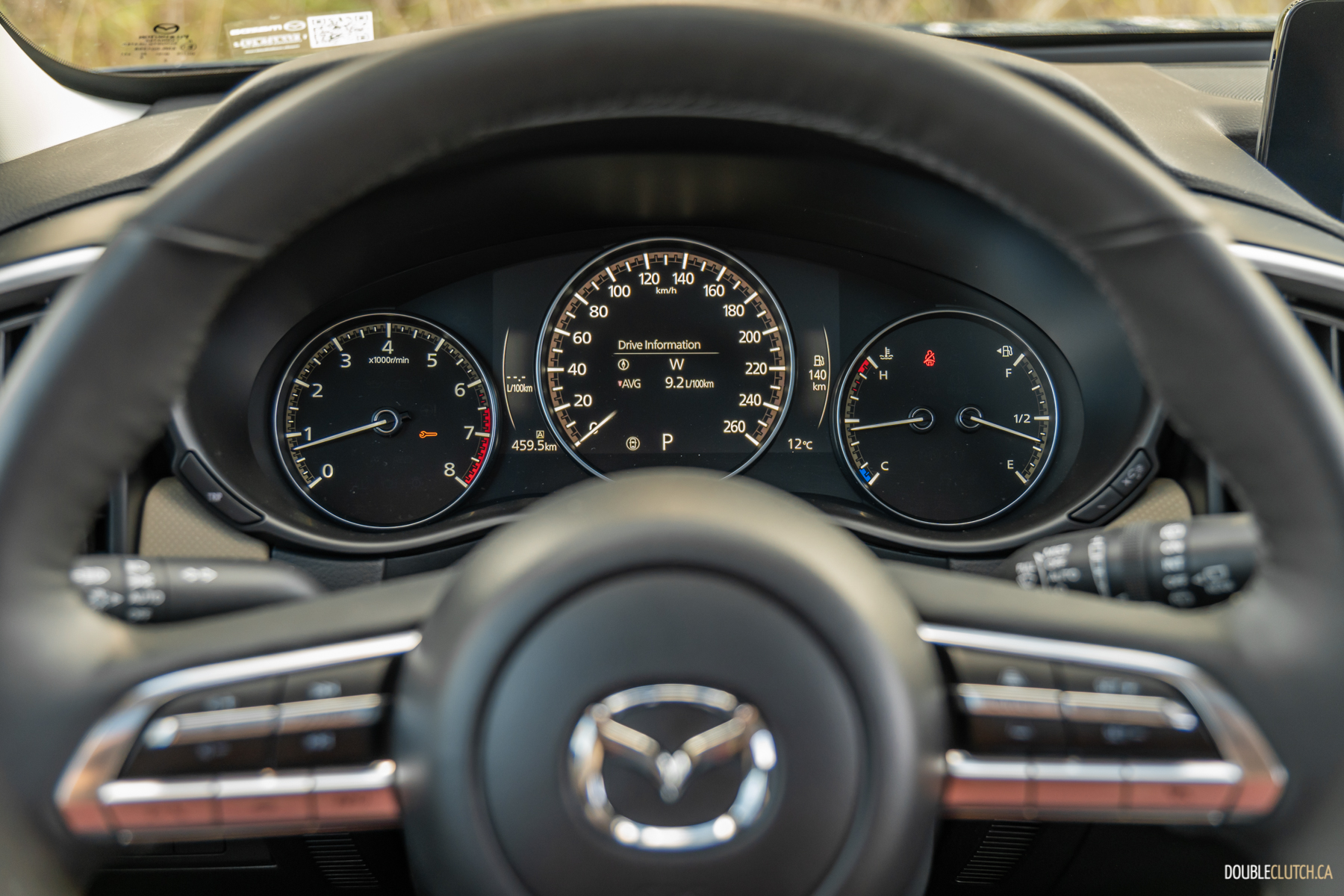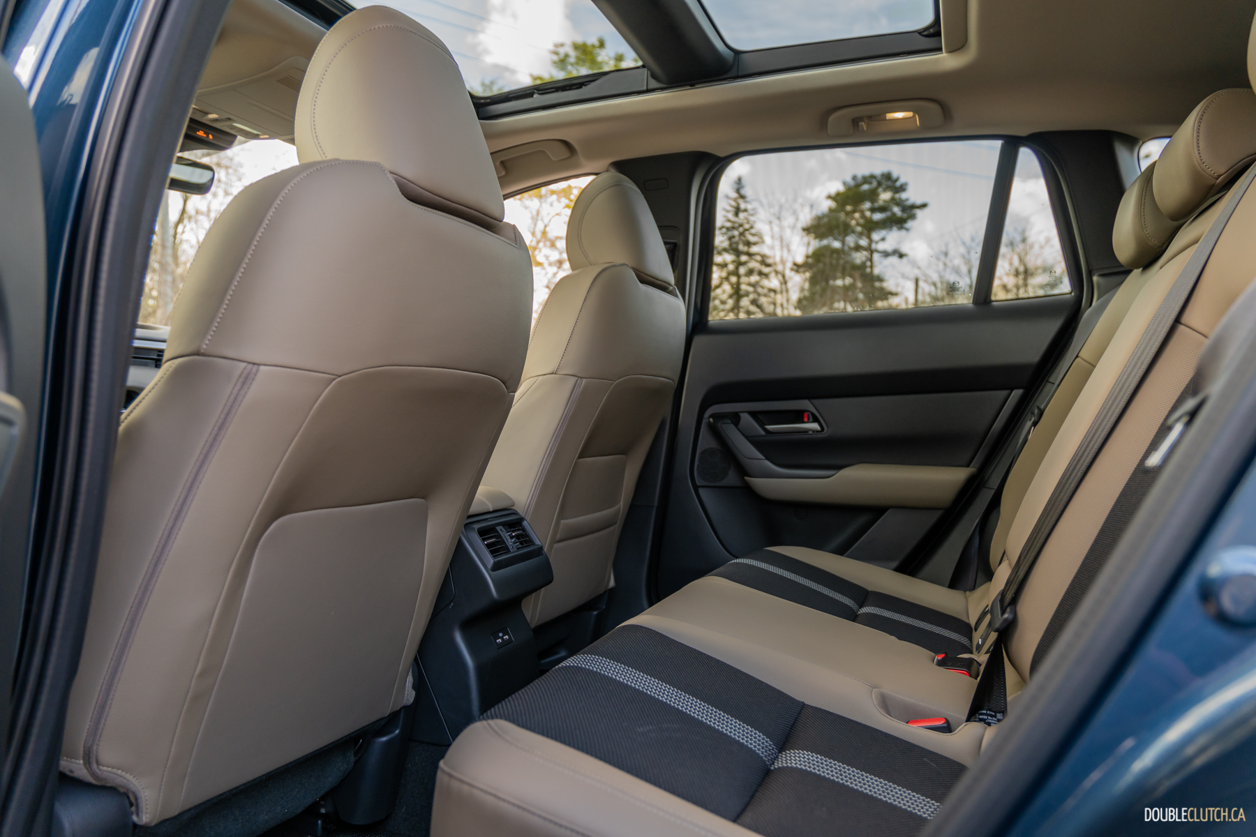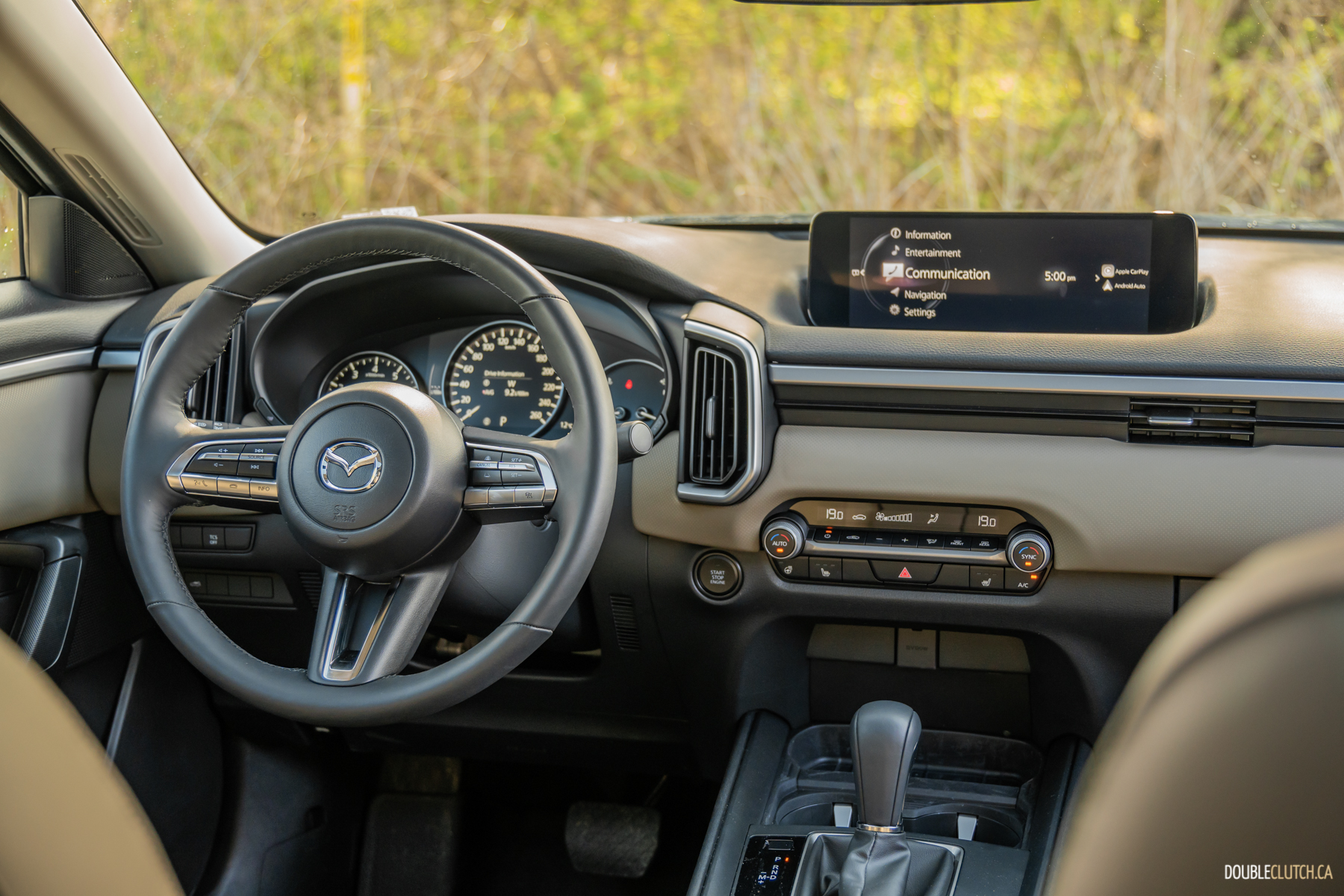 Inside the CX-50, Mazda’s design philosophy prevails. Even in this base trim, all finishes feel high-quality and the rather simple layout overall is well thought-out. The clean and crisp typefaces, the cohesive blend of fabrics and finishes, and touches like the physical switchgear for the climate controls make this affordable mainstream crossover feel like it’s in a class above. Unlike the upper-trim CX-50s we’ve tested in the past, this base model has leatherette upholstery on the seats, and a textured, cloth-like material spanning the dash. Unsurprisingly, it feels cheaper than you’d expect for a Mazda, but then again, this is a base CX-50. Impressively, a much more high-quality leather-wrapped steering wheel is standard; it’s heated, as are the front seats. Infotainment is handled through a 10.25-inch display controlled by a rotary knob in the centre console, and wireless Android Auto and Apple CarPlay are both standard. However, in order to get wireless charging and the upgraded 12-speaker Bose sound system, you’ll have to step up to the GT model.