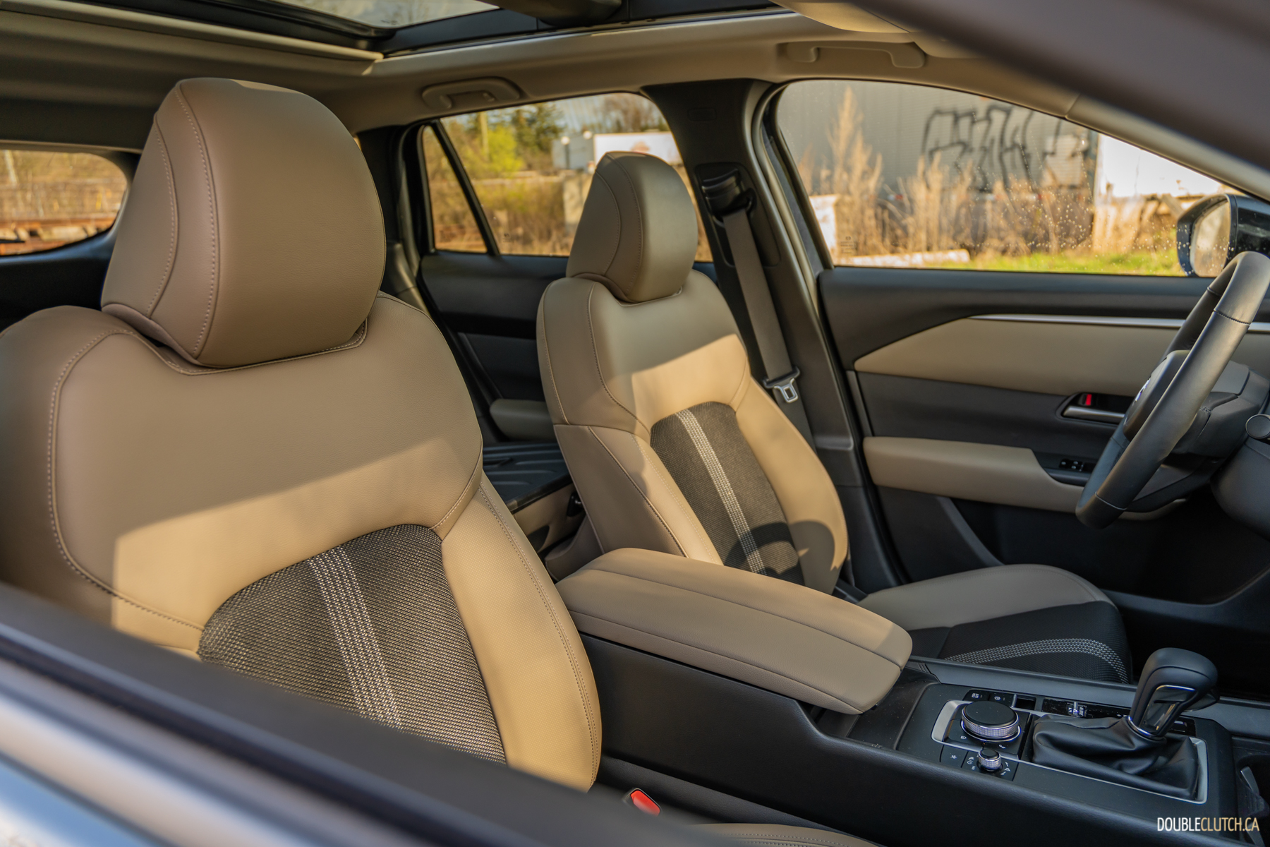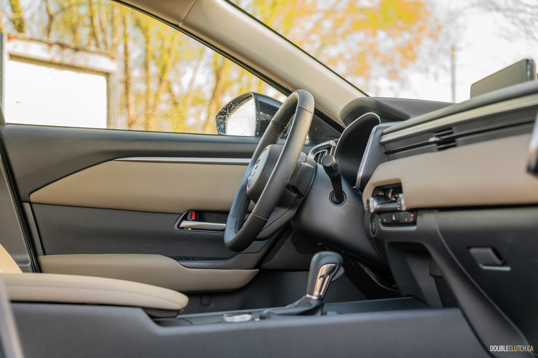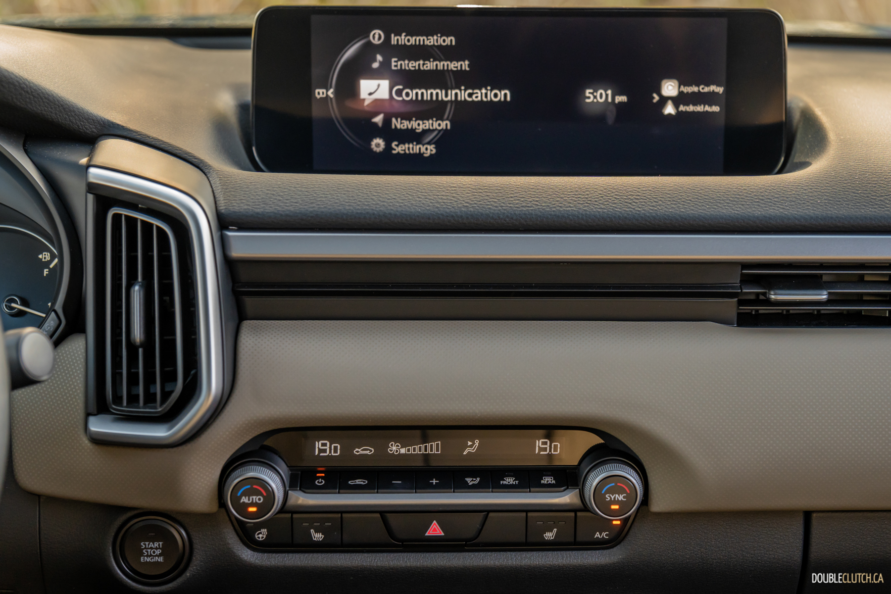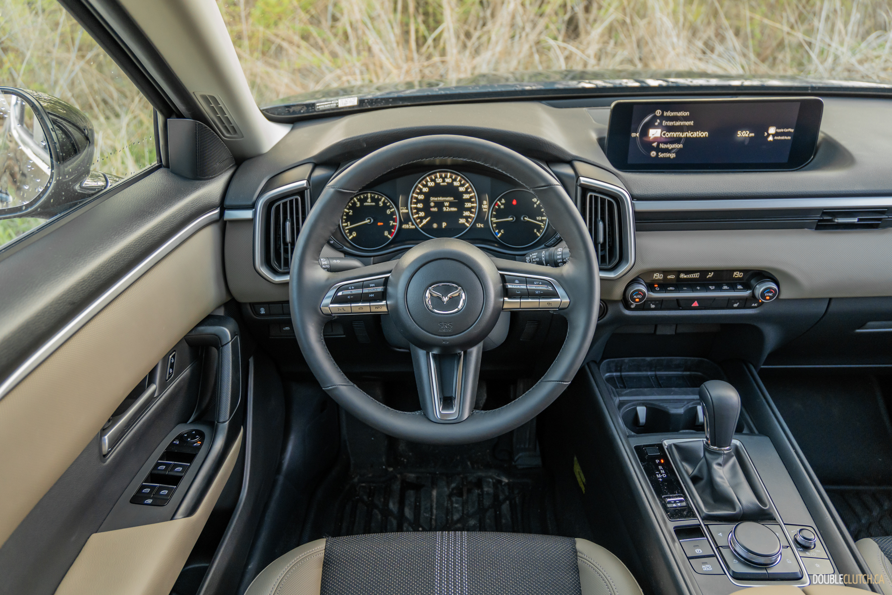 Inside the CX-50, Mazda’s design philosophy prevails. Even in this base trim, all finishes feel high-quality and the rather simple layout overall is well thought-out. The clean and crisp typefaces, the cohesive blend of fabrics and finishes, and touches like the physical switchgear for the climate controls make this affordable mainstream crossover feel like it’s in a class above. Unlike the upper-trim CX-50s we’ve tested in the past, this base model has leatherette upholstery on the seats, and a textured, cloth-like material spanning the dash. Unsurprisingly, it feels cheaper than you’d expect for a Mazda, but then again, this is a base CX-50. Impressively, a much more high-quality leather-wrapped steering wheel is standard; it’s heated, as are the front seats. Infotainment is handled through a 10.25-inch display controlled by a rotary knob in the centre console, and wireless Android Auto and Apple CarPlay are both standard. However, in order to get wireless charging and the upgraded 12-speaker Bose sound system, you’ll have to step up to the GT model.