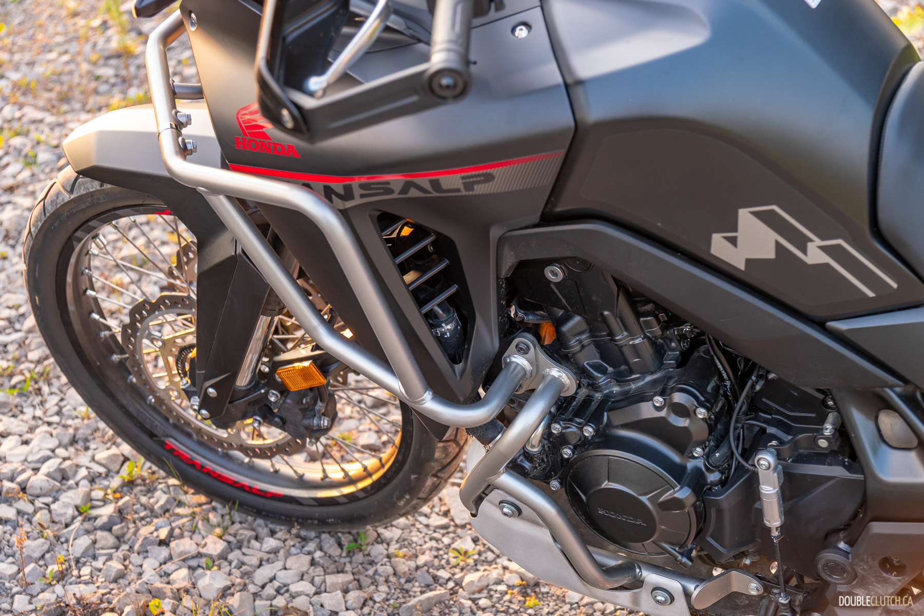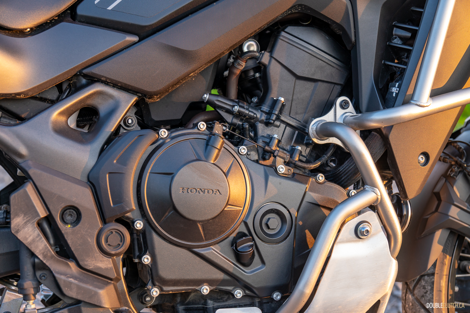 The new Transalp is powered by a new 755-cc engine, producing 83 horsepower at 9,500 rpm and 55 pound-feet of torque at 7,250 rpm. It’s a parallel-twin that makes use of Honda’s Unicam head design, using one camshaft and a clever rocker setup to actuate four valves per cylinder. This shaves weight, keeping the TransAlp at a very trim 459 pounds, and it shaves weight off the top of the engine—lowering the centre of gravity and helping it handle like a much smaller bike than it is.