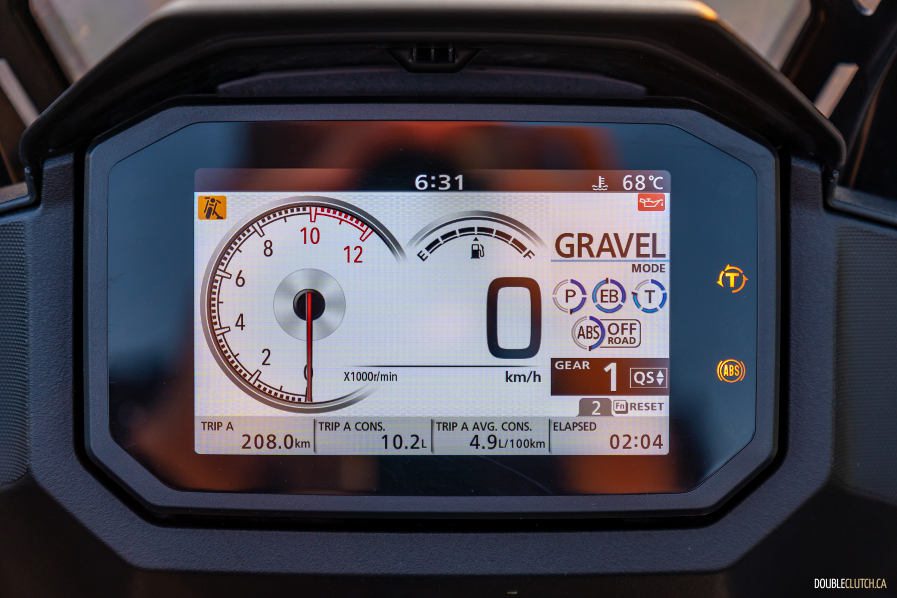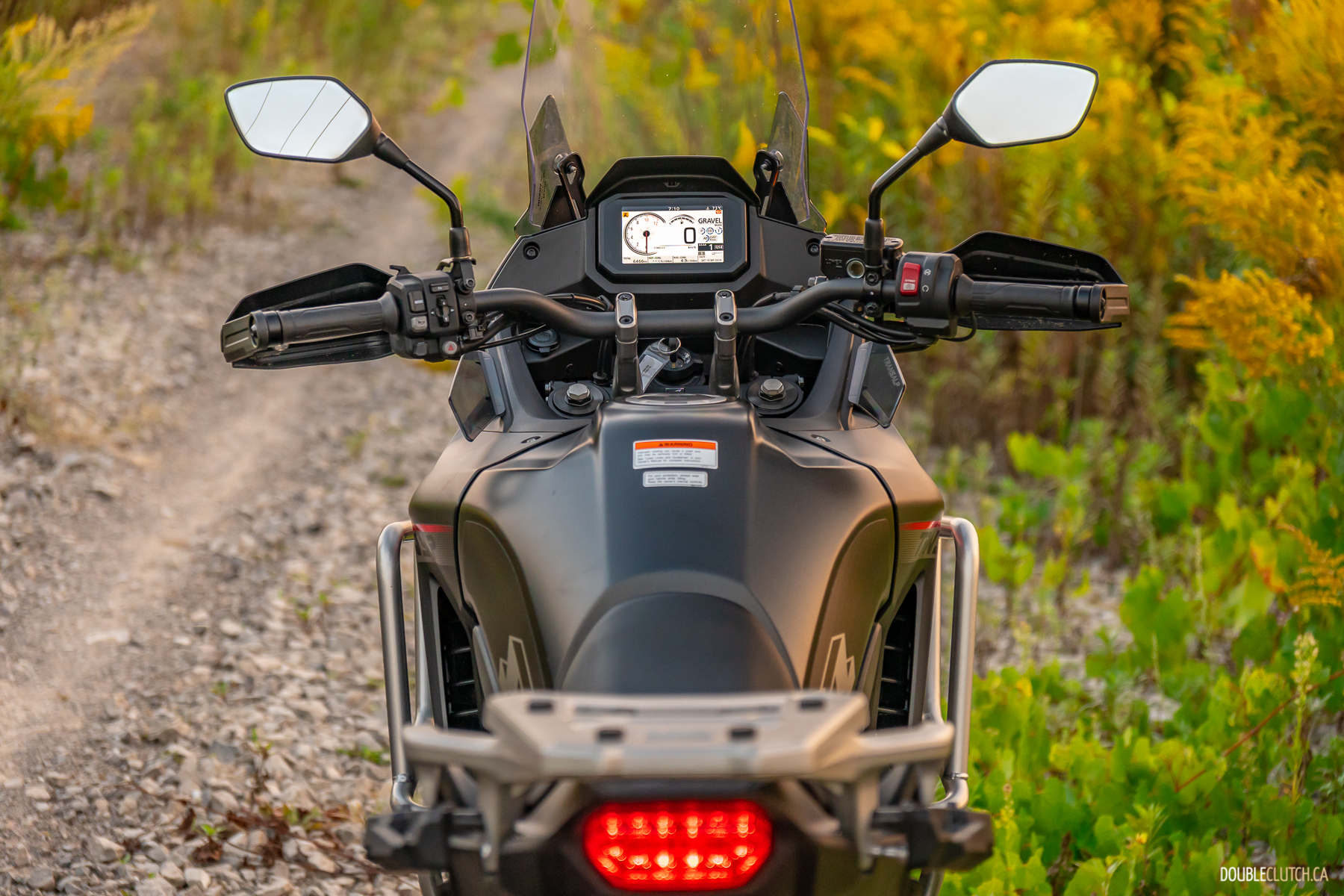 Honda’s selectable torque control is standard and works well, giving you either a rigid safety net or gentle guiding hand depending on which drive mode you’ve selected. The parameters of the different drive modes—ABS intervention, engine braking, power, and more—are clearly telegraphed on the five-inch TFT display, so you can immediately know what to expect in each mode, or have at it with the customizable user mode. The clutch has an exceptionally light action, its slipper function is very forgiving, and a two-way quickshifter is standard. The Transalp is a peach, no matter what you’re doing with it.