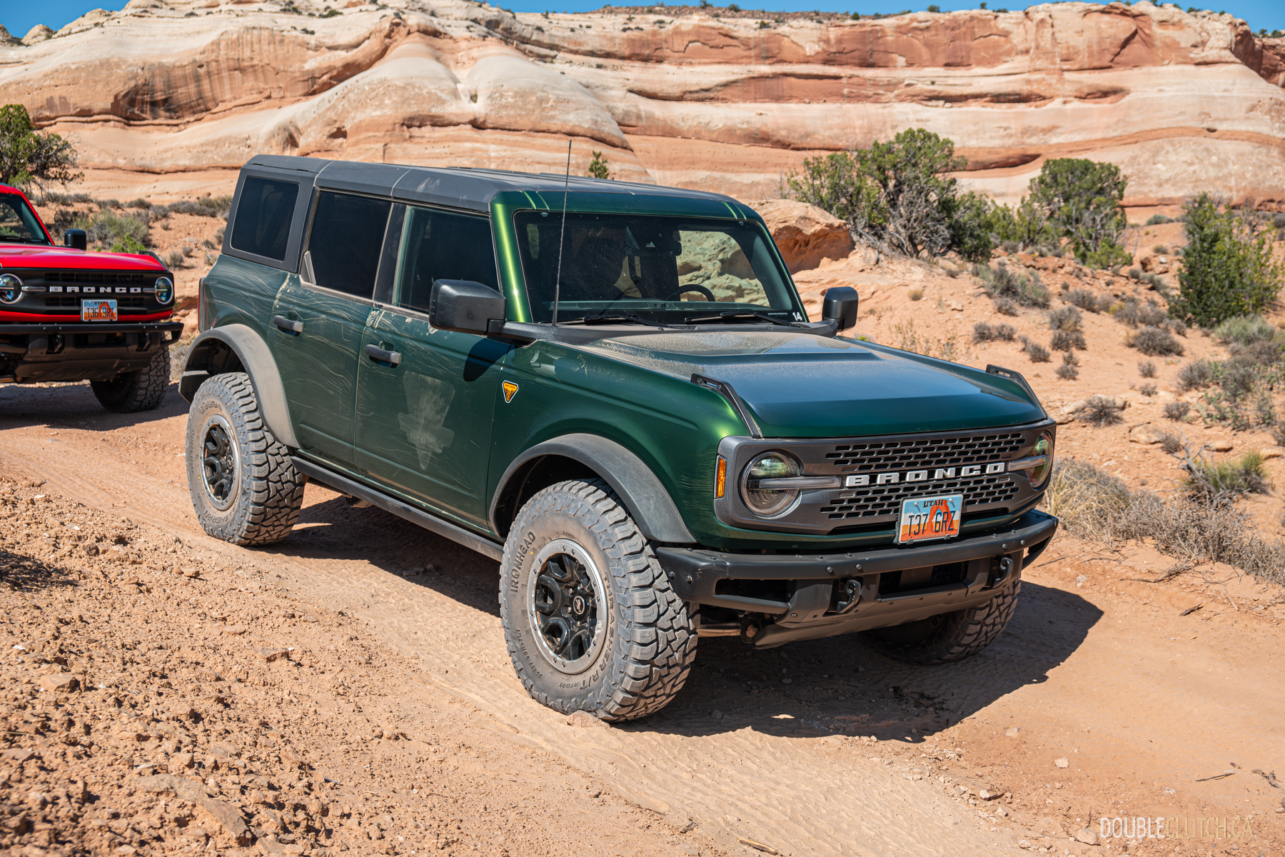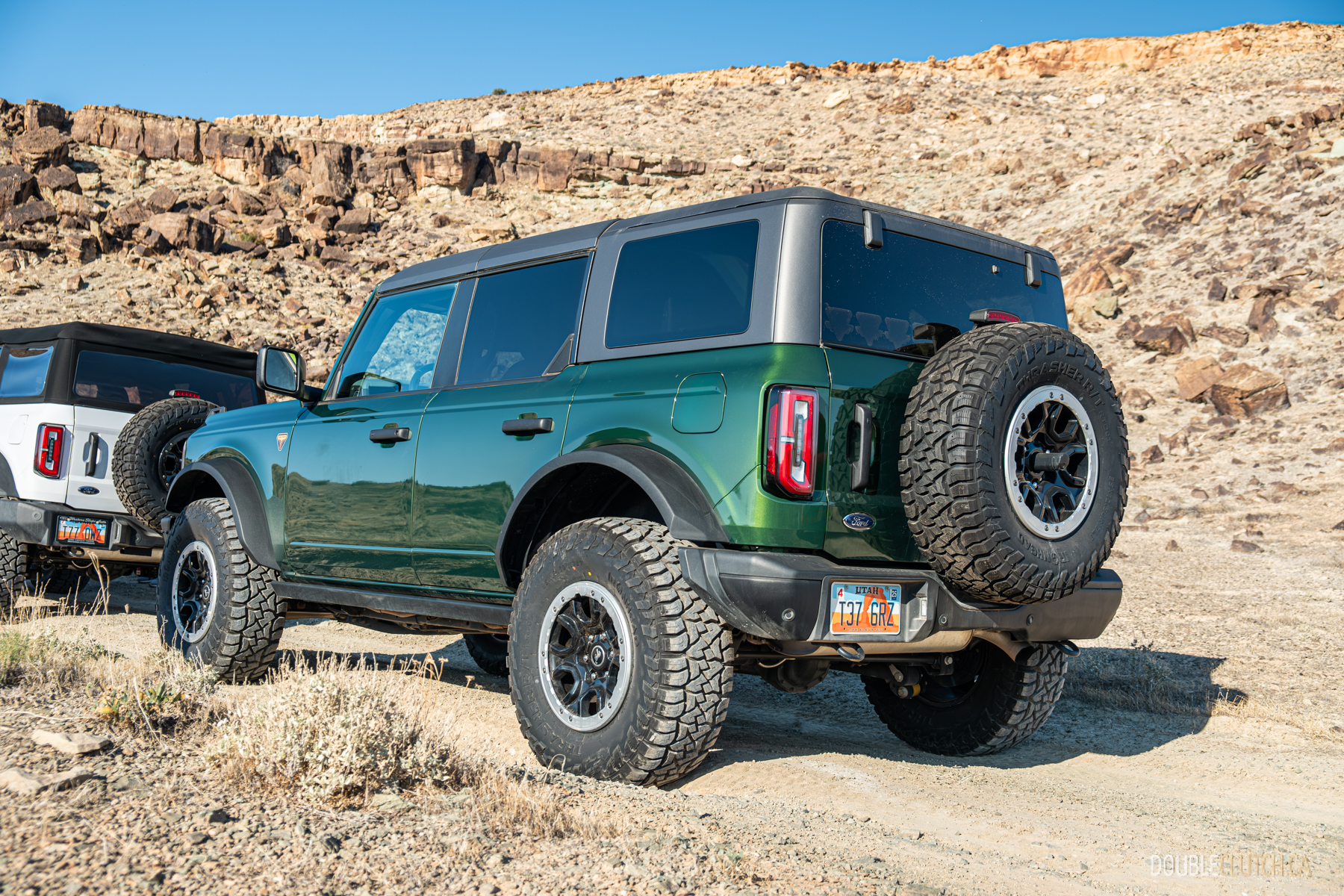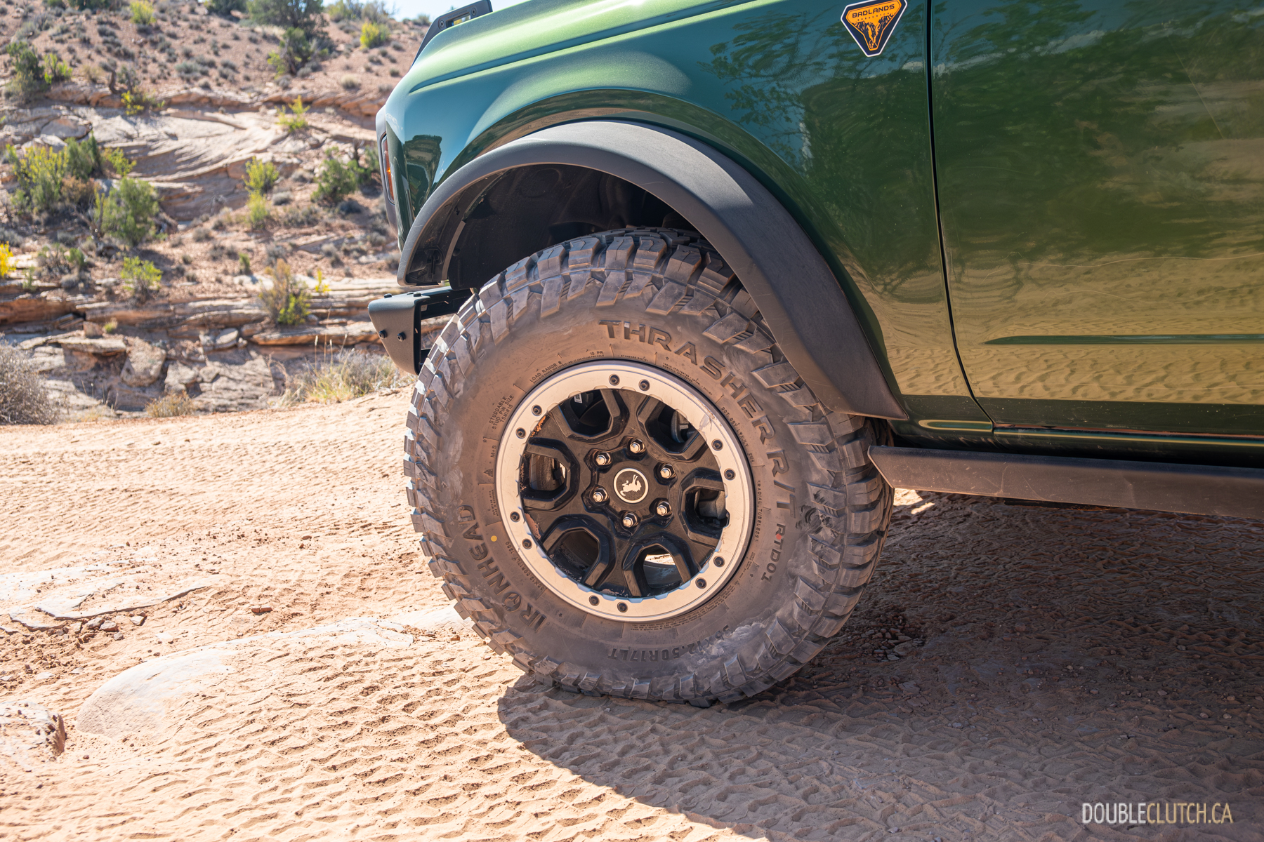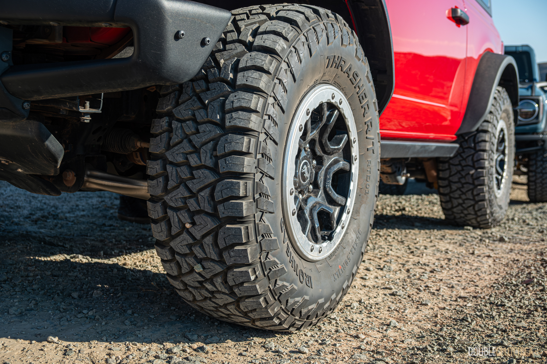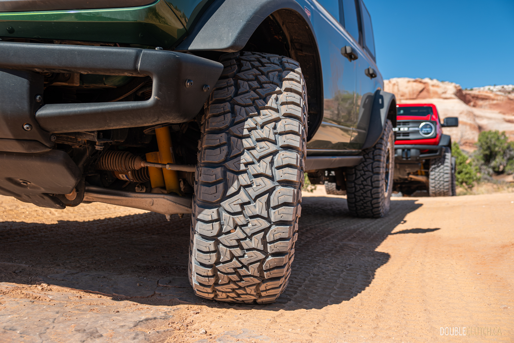On that paved road, we kept tired pressures up at Ford’s recommended 39 PSI, which led to surprisingly good road manners and a moderate but completely bearable level of road noise. Once we hit the dirt, we deflated the Thrasher R/Ts down to a 22 PSI for a larger contact patch over the rocky stuff. The trail started off light and easy enough, but quickly gave way to some bumpy rocks that required finesse and careful consideration. The Bronco would pitch and angle, but the Thrasher R/Ts kept us moving forward confidently.